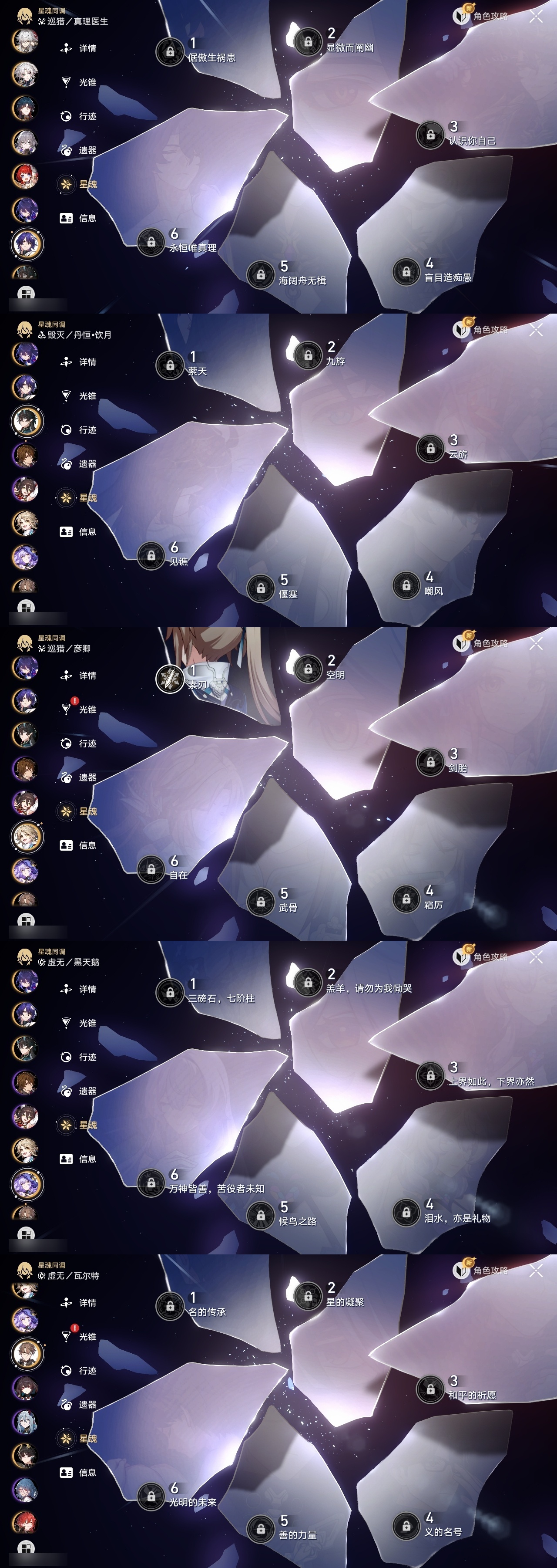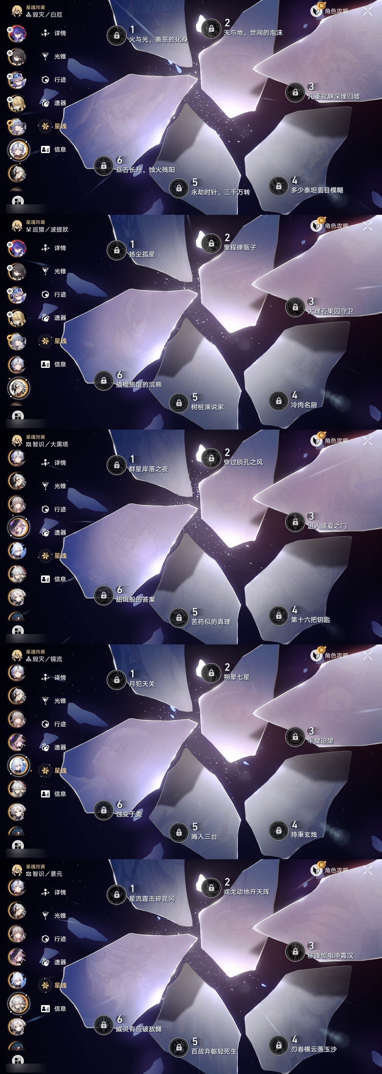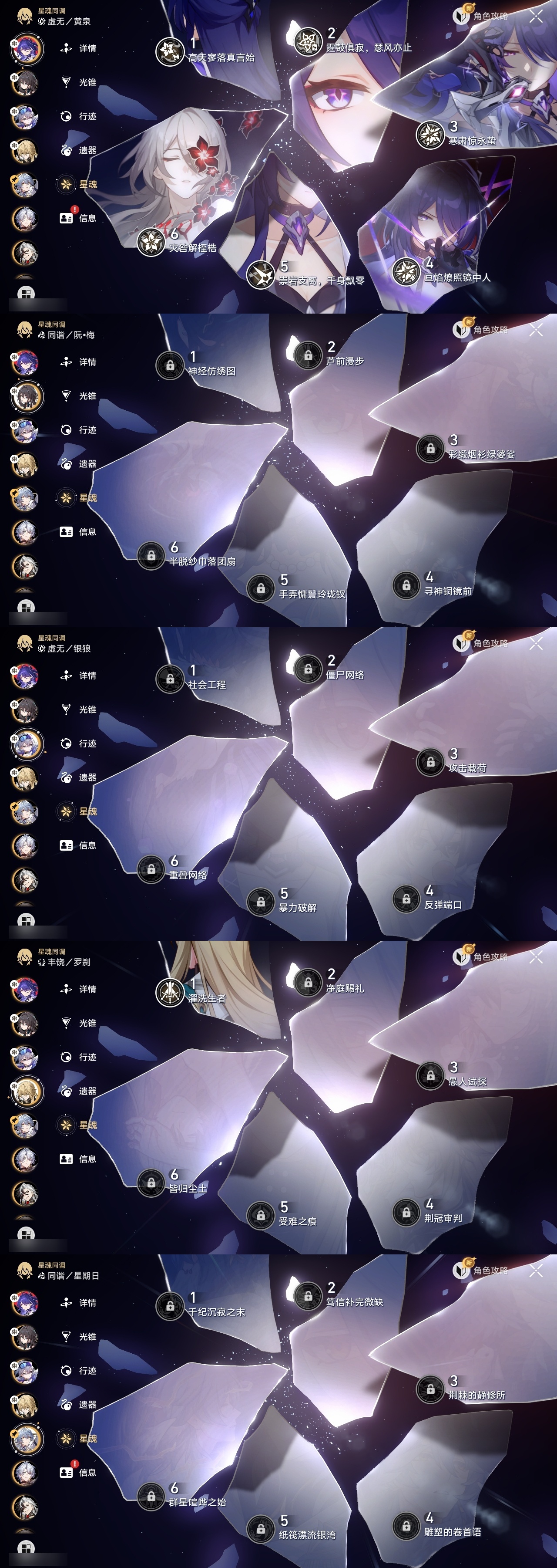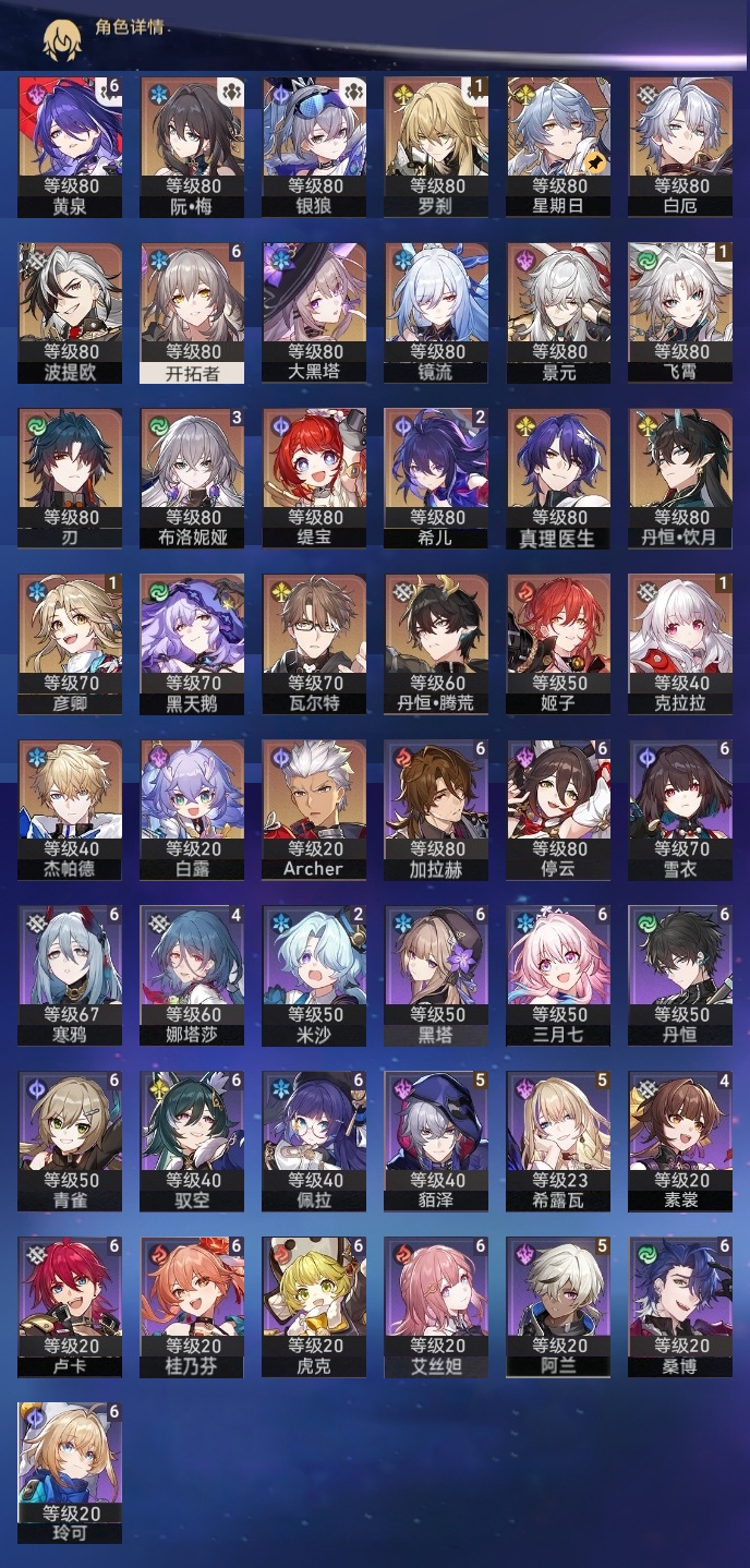 【崩坏·星穹铁道】【lyxq9897】冒险等级:70,女主,五星数量:38,五星角色:黄泉 6命布洛妮娅 3命希儿 2命飞霄 1命彦卿 1命克拉拉 1命罗刹 1命银狼景元白露姬子杰帕德瓦尔特星期日大黑塔缇宝刃丹恒·饮月镜流真理医生黑天鹅白厄archer丹恒·腾荒波提欧__五星光锥:记一位星神的陨落 5精无可取代的东西 2精拂晓之前 2精以世界之名时节不居如泥酣眠我将,巡征追猎向着不可追问处棺的回响纯粹思维的洗礼行于流逝的岸记忆永不落幕驶向第二次生命__四星角色:虎克 6命黑塔 6命丹恒 6命艾丝妲 6命停云 6命桑博 6命三月七 6命青雀 6命佩拉 6命驭空 6命卢卡 6命玲可 6命桂乃芬 6命寒鸦 6命雪衣 6命加拉赫 6命阿兰 5命貊泽 5命希露瓦 5命娜塔莎 4命素裳 4命米沙 2命
