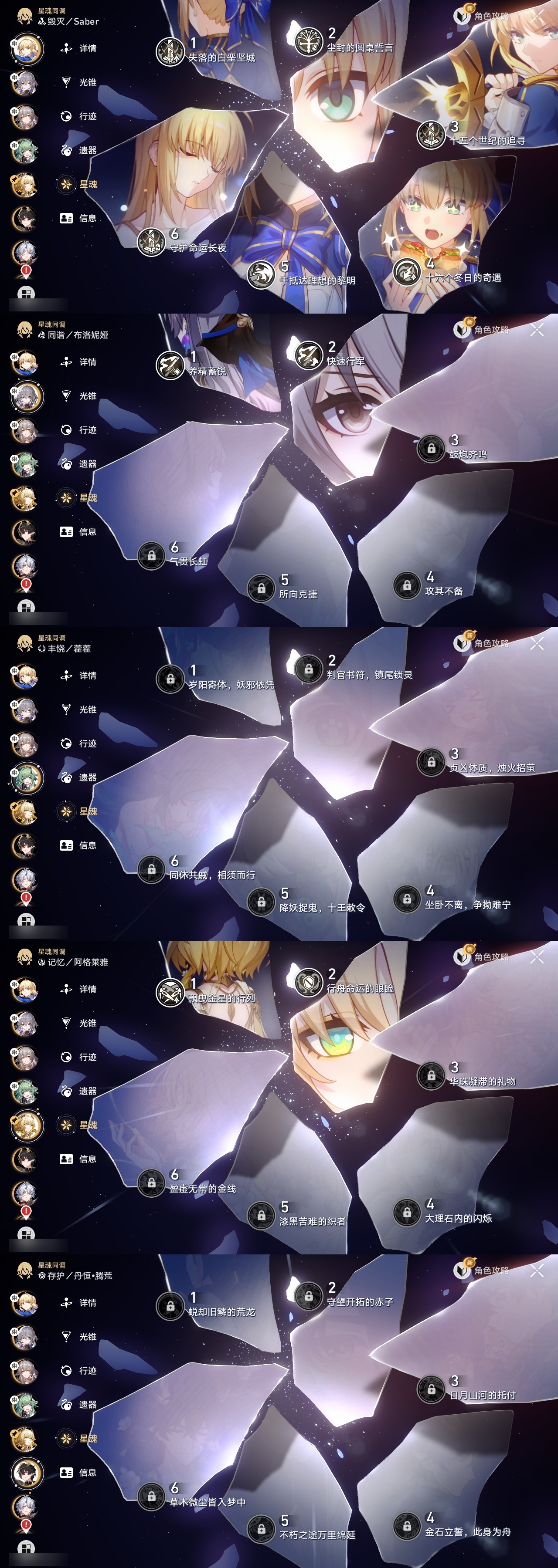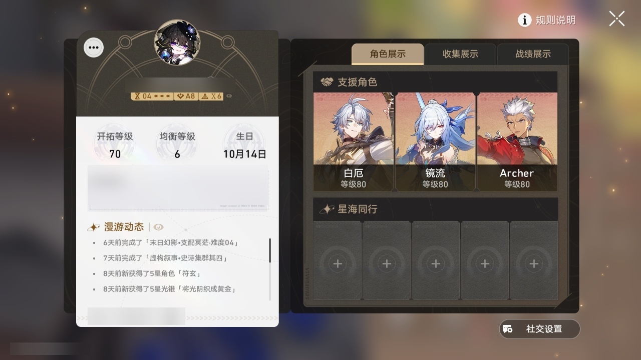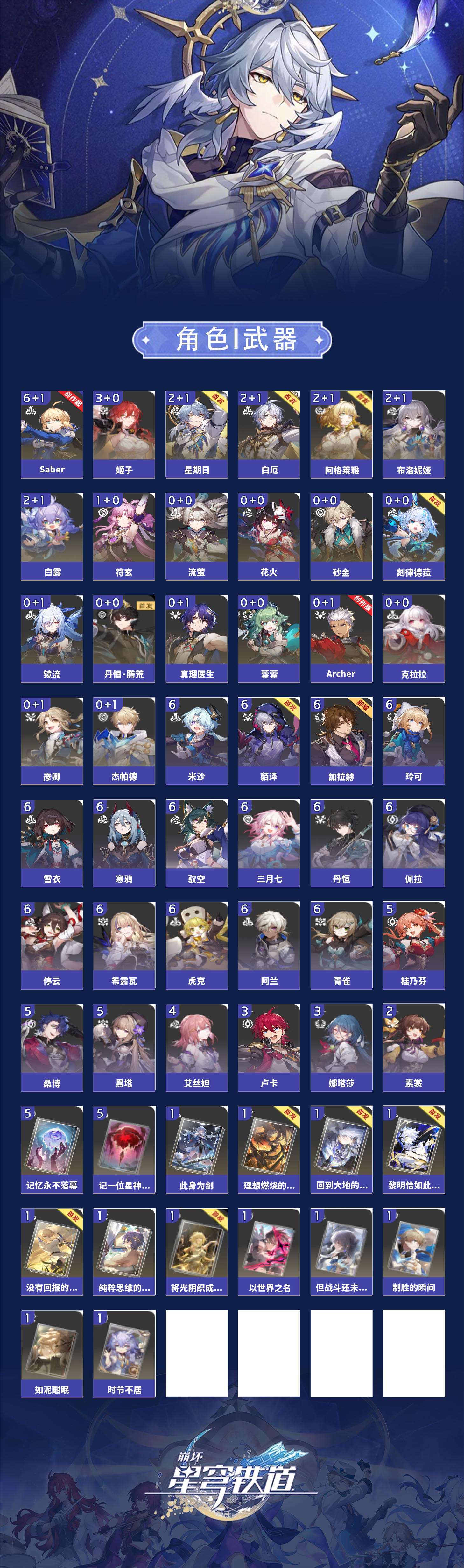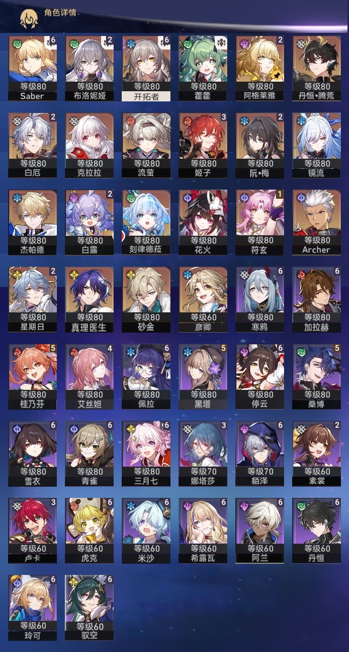 【崩坏·星穹铁道】【lyxq9895】冒险等级:70,女主,五星数量:34,五星角色:saber 6命姬子 3命白露 2命布洛妮娅 2命星期日 2命阿格莱雅 2命白厄 2命符玄 1命杰帕德彦卿克拉拉镜流藿藿真理医生花火砂金archer刻律德菈丹恒·腾荒流萤__五星光锥:记一位星神的陨落 5精记忆永不落幕 5精制胜的瞬间以世界之名时节不居如泥酣眠但战斗还未结束回到大地的飞行将光阴织成黄金此身为剑纯粹思维的洗礼黎明恰如此燃烧理想燃烧的地狱没有回报的加冕__四星角色:阿兰 6命虎克 6命貊泽 6命丹恒 6命希露瓦 6命停云 6命三月七 6命青雀 6命佩拉 6命驭空 6命玲可 6命寒鸦 6命雪衣 6命米沙 6命加拉赫 6命黑塔 5命桑博 5命桂乃芬 5命艾丝妲 4命娜塔莎 3命卢卡 3命素裳 2命