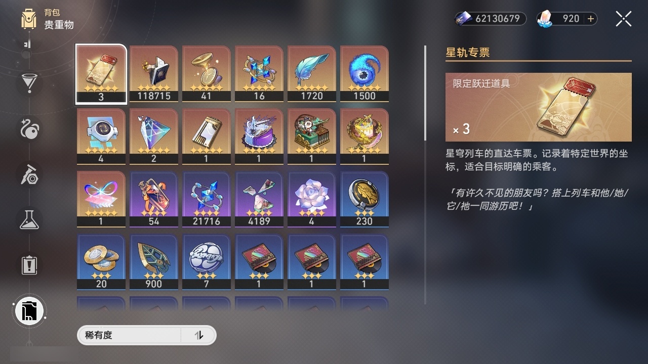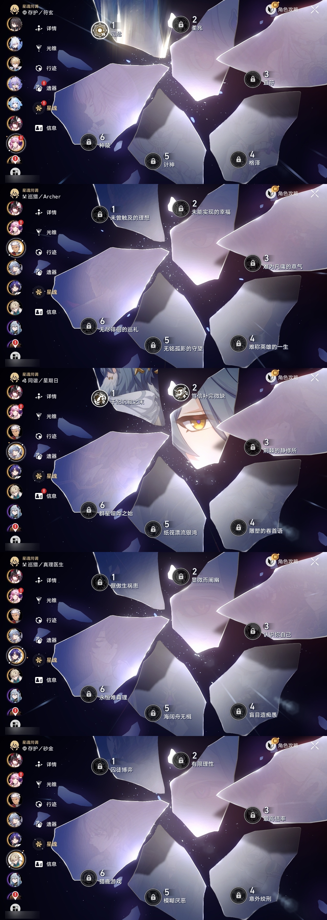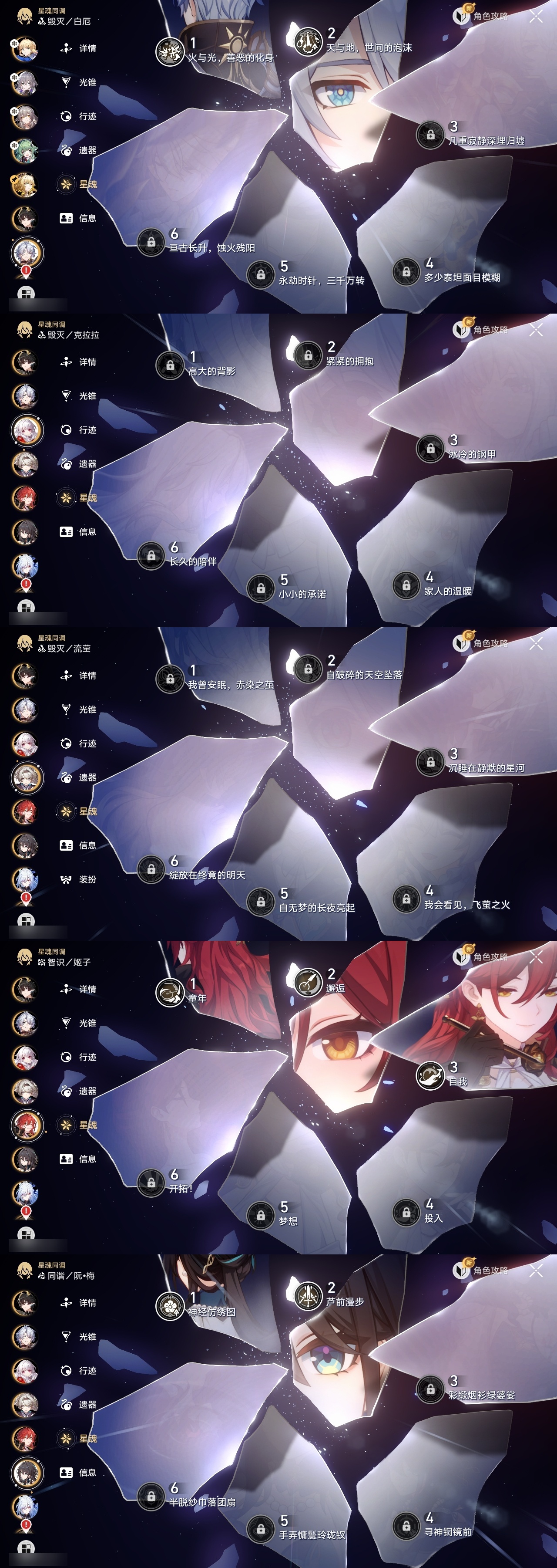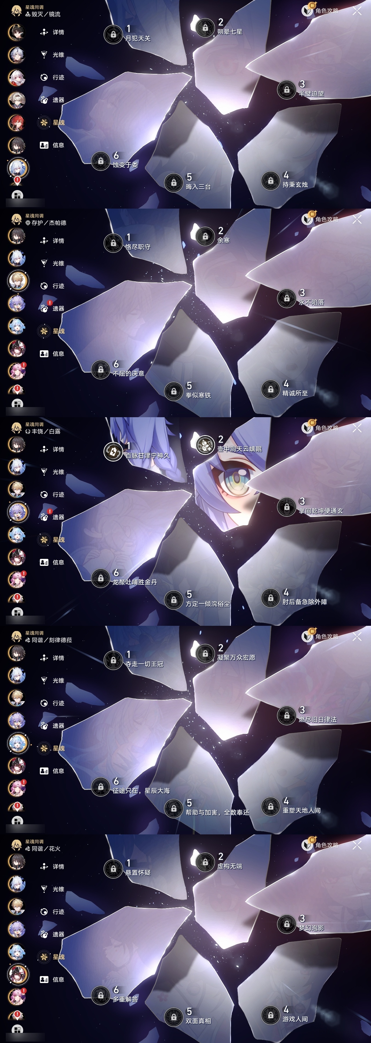 【崩坏·星穹铁道】【lyxq9895】冒险等级:70,女主,五星数量:34,五星角色:saber 6命姬子 3命白露 2命布洛妮娅 2命星期日 2命阿格莱雅 2命白厄 2命符玄 1命杰帕德彦卿克拉拉镜流藿藿真理医生花火砂金archer刻律德菈丹恒·腾荒流萤__五星光锥:记一位星神的陨落 5精记忆永不落幕 5精制胜的瞬间以世界之名时节不居如泥酣眠但战斗还未结束回到大地的飞行将光阴织成黄金此身为剑纯粹思维的洗礼黎明恰如此燃烧理想燃烧的地狱没有回报的加冕__四星角色:阿兰 6命虎克 6命貊泽 6命丹恒 6命希露瓦 6命停云 6命三月七 6命青雀 6命佩拉 6命驭空 6命玲可 6命寒鸦 6命雪衣 6命米沙 6命加拉赫 6命黑塔 5命桑博 5命桂乃芬 5命艾丝妲 4命娜塔莎 3命卢卡 3命素裳 2命