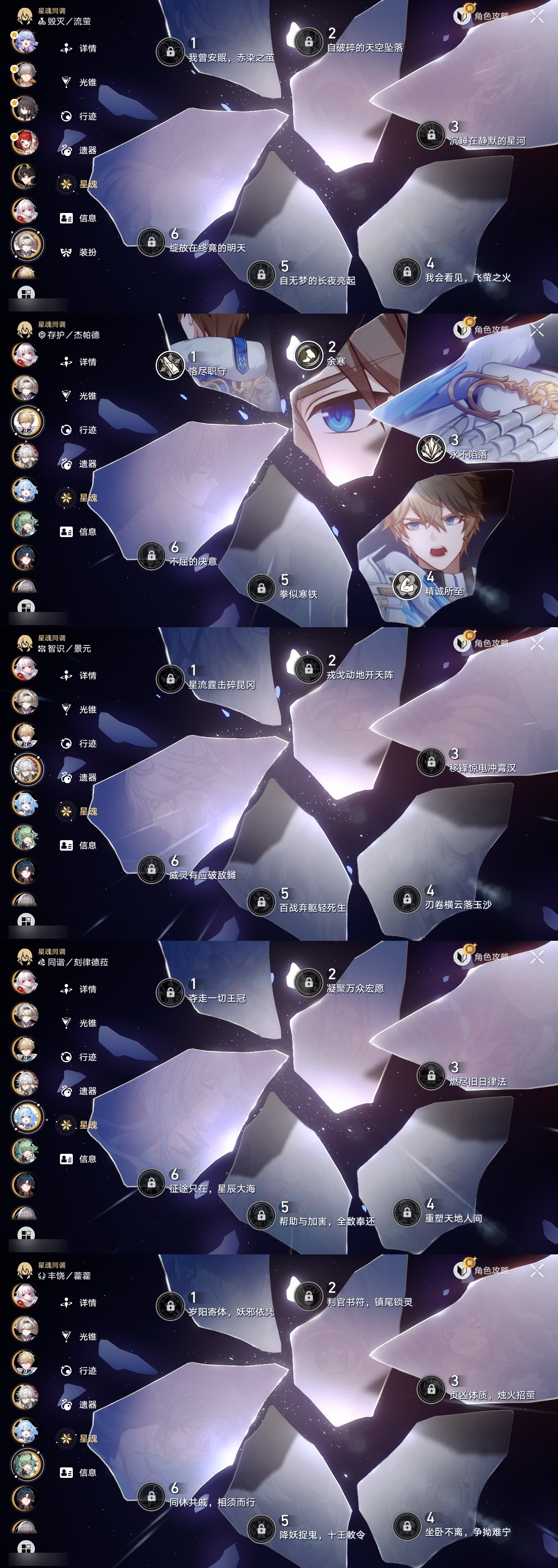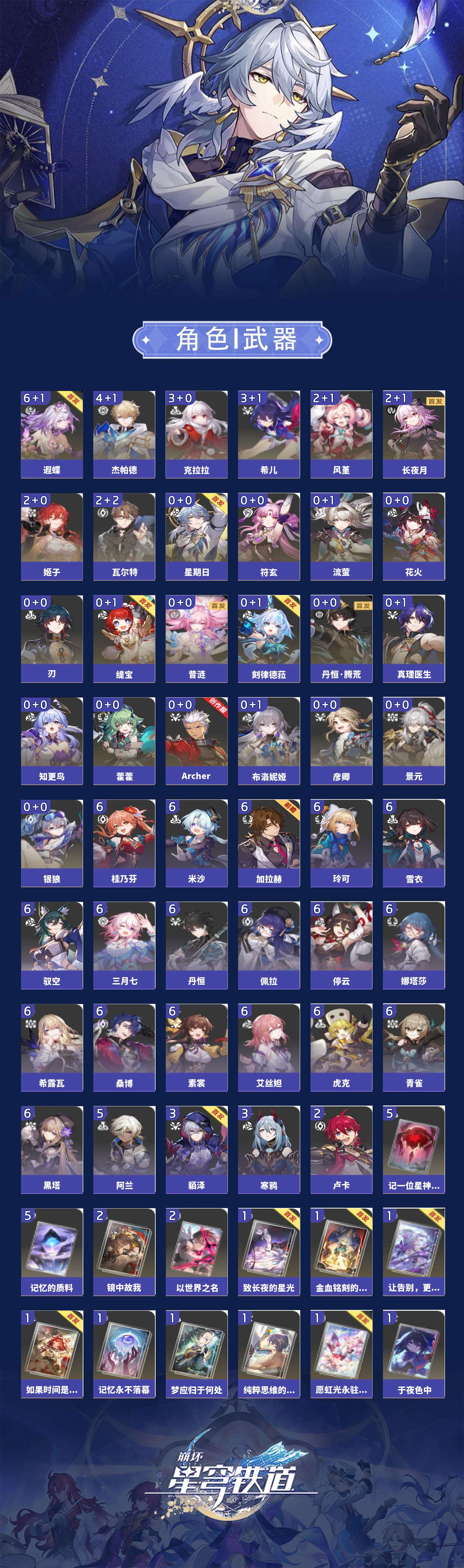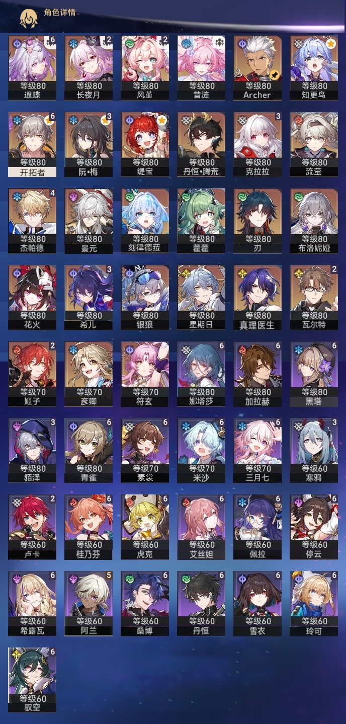 【崩坏·星穹铁道】【lyxq9893】冒险等级:70,男主,五星数量:43,五星角色:遐蝶 6命杰帕德 4命希儿 3命克拉拉 3命姬子 2命瓦尔特 2命风堇 2命长夜月 2命银狼景元布洛妮娅彦卿星期日缇宝刃符玄藿藿真理医生花火知更鸟archer刻律德菈丹恒·腾荒昔涟流萤__五星光锥:记忆的质料 5精记一位星神的陨落 5精不息的演算 5精以世界之名 2精镜中故我 2精制胜的瞬间时节不居但战斗还未结束但战斗还未结束于夜色中如果时间是一朵花让告别,更美一些纯粹思维的洗礼愿虹光永驻天空记忆永不落幕金血铭刻的时代致长夜的星光梦应归于何处__四星角色:娜塔莎 6命虎克 6命黑塔 6命丹恒 6命艾丝妲 6命希露瓦 6命停云 6命素裳 6命桑博 6命三月七 6命青雀 6命佩拉 6命驭空 6命玲可 6命桂乃芬 6命雪衣 6命米沙 6命加拉赫 6命阿兰 5命貊泽 3命寒鸦 3命卢卡 2命