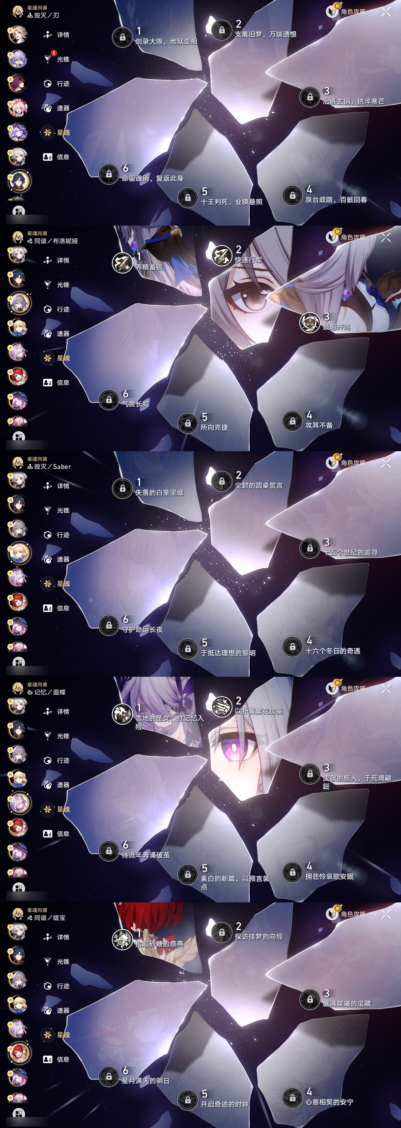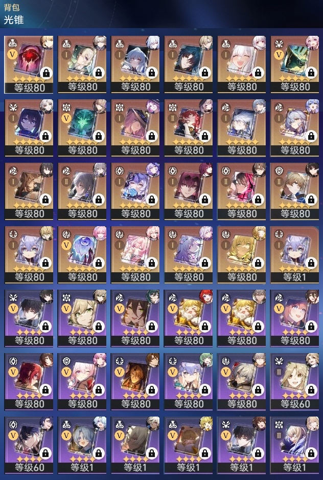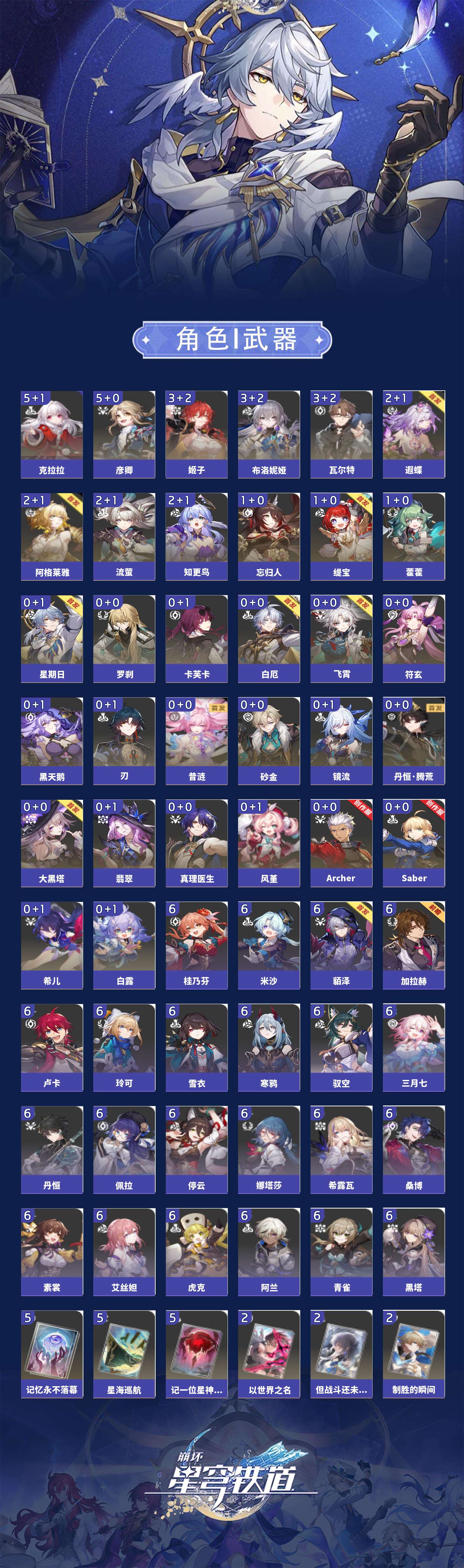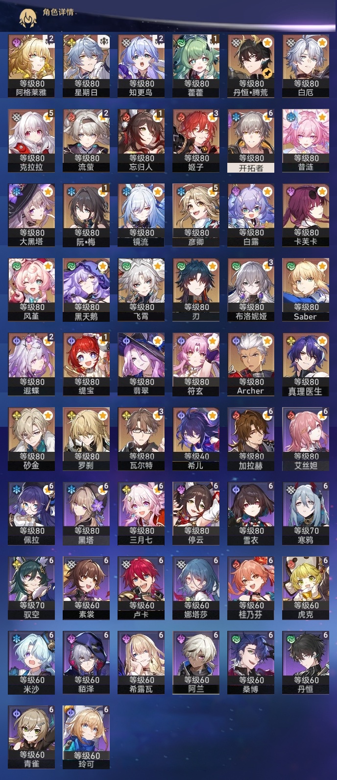 【崩坏·星穹铁道】【lyxq9889】冒险等级:70,男主,五星数量:56,五星角色:彦卿 5命克拉拉 5命布洛妮娅 3命姬子 3命瓦尔特 3命阿格莱雅 2命遐蝶 2命知更鸟 2命流萤 2命忘归人 1命缇宝 1命藿藿 1命飞霄希儿白露星期日大黑塔罗刹刃卡芙卡符玄镜流真理医生黑天鹅风堇砂金白厄saberarcher丹恒·腾荒昔涟翡翠__五星光锥:星海巡航 5精记一位星神的陨落 5精不息的演算 5精记忆永不落幕 5精制胜的瞬间 2精银河铁道之夜 2精以世界之名 2精但战斗还未结束 2精无可取代的东西时节不居时节不居于夜色中回到大地的飞行将光阴织成黄金到不了的彼岸只需等待让告别,更美一些此身为剑镜中故我重塑时光之忆愿虹光永驻天空夜色流光溢彩梦应归于何处偏偏希望无价__四星角色:阿兰 6命娜塔莎 6命虎克 6命貊泽 6命黑塔 6命丹恒 6命艾丝妲 6命希露瓦 6命停云 6命素裳 6命桑博 6命三月七 6命青雀 6命佩拉 6命驭空 6命卢卡 6命玲可 6命桂乃芬 6命寒鸦 6命雪衣 6命米沙 6命加拉赫 6命