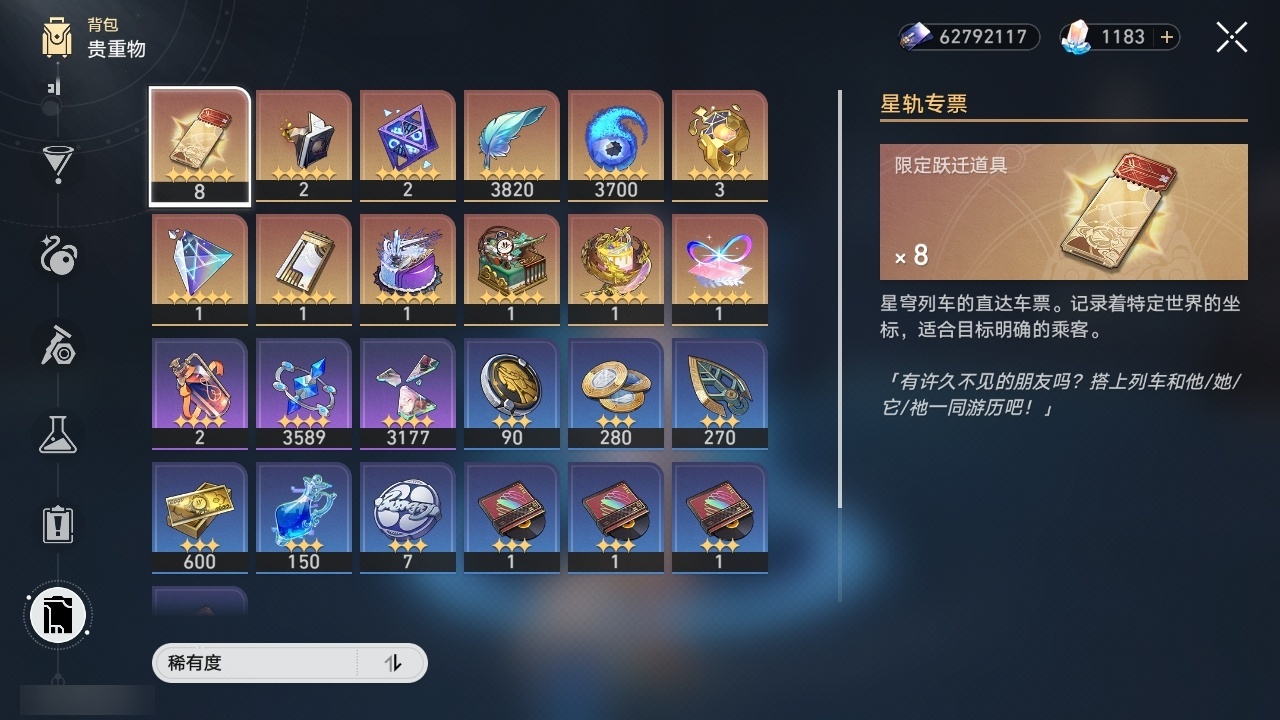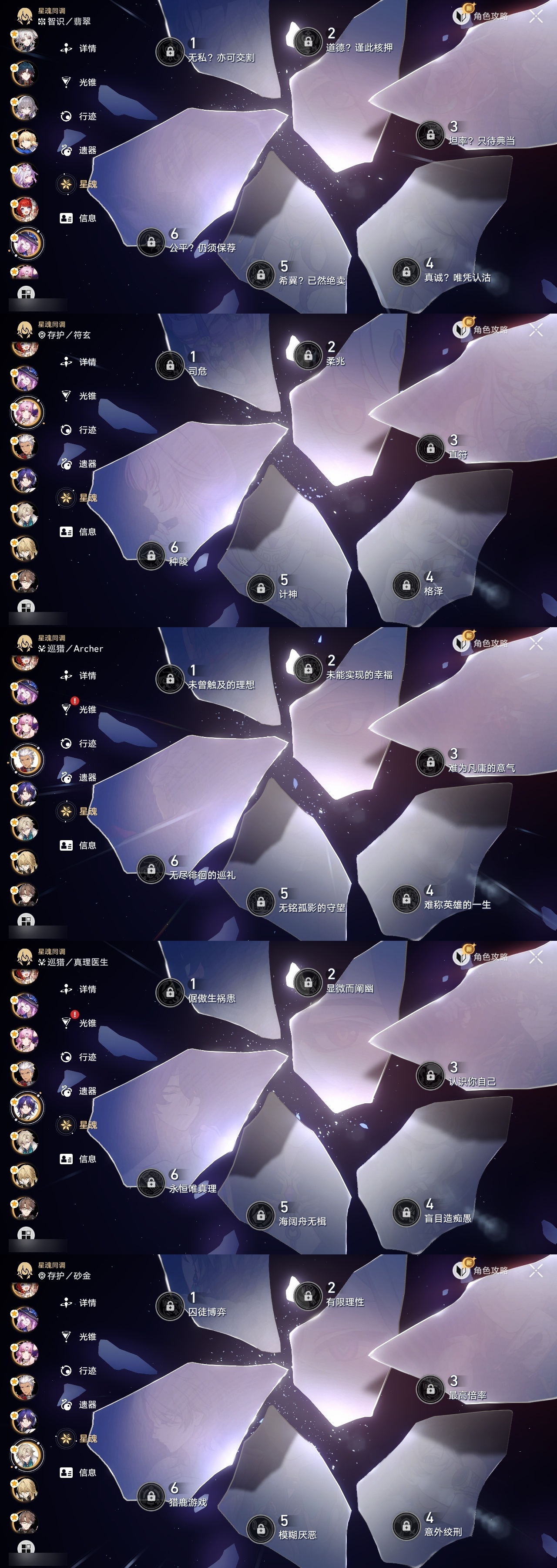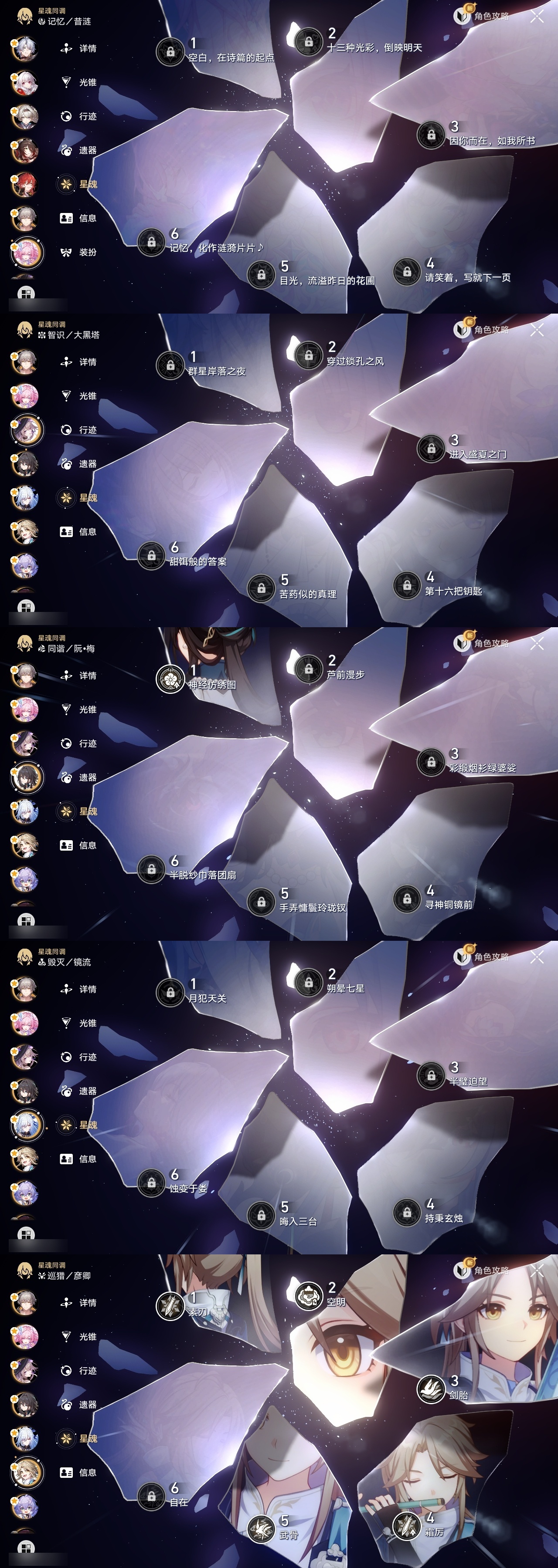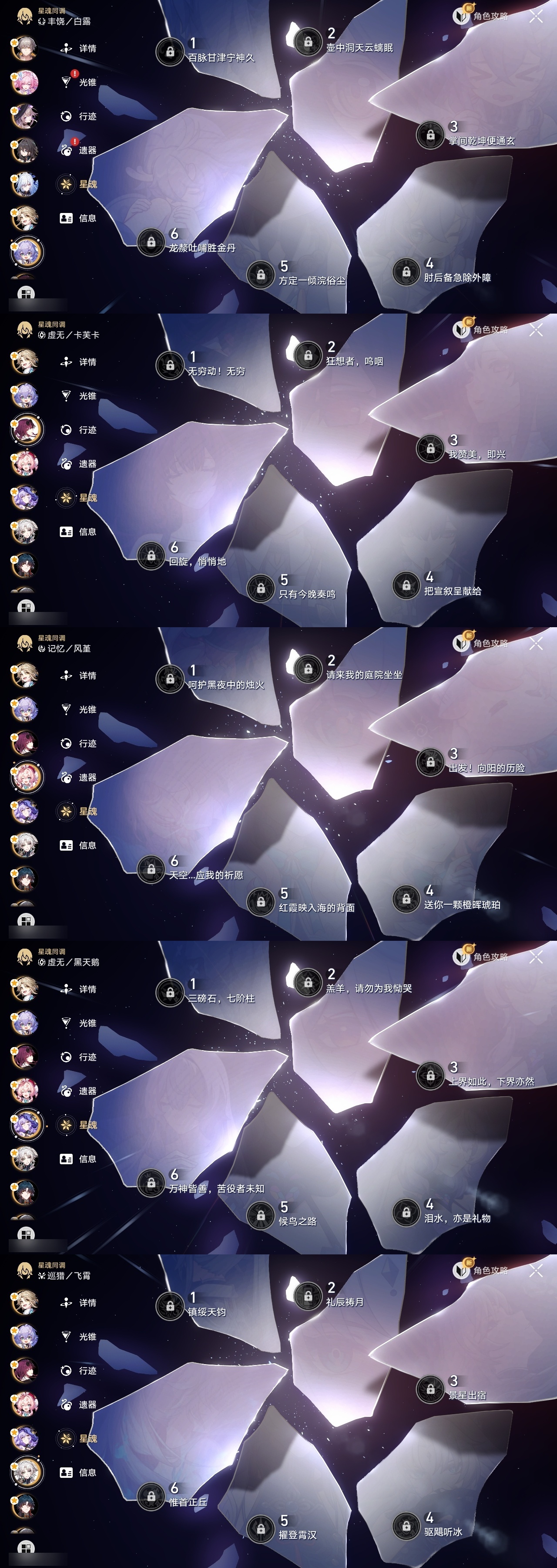 【崩坏·星穹铁道】【lyxq9889】冒险等级:70,男主,五星数量:56,五星角色:彦卿 5命克拉拉 5命布洛妮娅 3命姬子 3命瓦尔特 3命阿格莱雅 2命遐蝶 2命知更鸟 2命流萤 2命忘归人 1命缇宝 1命藿藿 1命飞霄希儿白露星期日大黑塔罗刹刃卡芙卡符玄镜流真理医生黑天鹅风堇砂金白厄saberarcher丹恒·腾荒昔涟翡翠__五星光锥:星海巡航 5精记一位星神的陨落 5精不息的演算 5精记忆永不落幕 5精制胜的瞬间 2精银河铁道之夜 2精以世界之名 2精但战斗还未结束 2精无可取代的东西时节不居时节不居于夜色中回到大地的飞行将光阴织成黄金到不了的彼岸只需等待让告别,更美一些此身为剑镜中故我重塑时光之忆愿虹光永驻天空夜色流光溢彩梦应归于何处偏偏希望无价__四星角色:阿兰 6命娜塔莎 6命虎克 6命貊泽 6命黑塔 6命丹恒 6命艾丝妲 6命希露瓦 6命停云 6命素裳 6命桑博 6命三月七 6命青雀 6命佩拉 6命驭空 6命卢卡 6命玲可 6命桂乃芬 6命寒鸦 6命雪衣 6命米沙 6命加拉赫 6命
