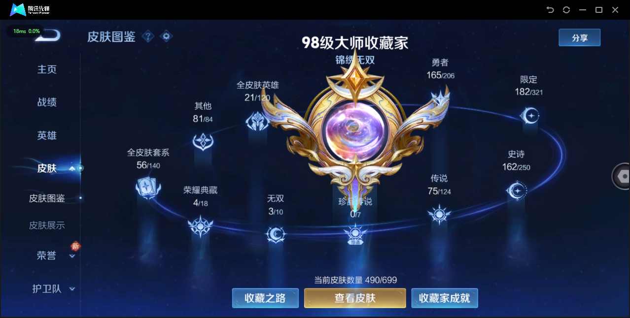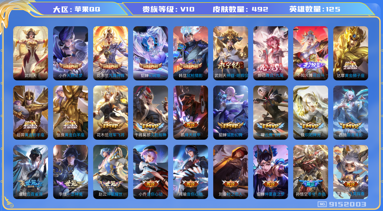 [9152003]贵族等级:v10 皮肤价值:476256 荣耀典藏:5 无双皮肤:3 传说皮肤:75 史诗皮肤:160 英雄数量:125 皮肤数量:490 游戏区服:苹果qq135区