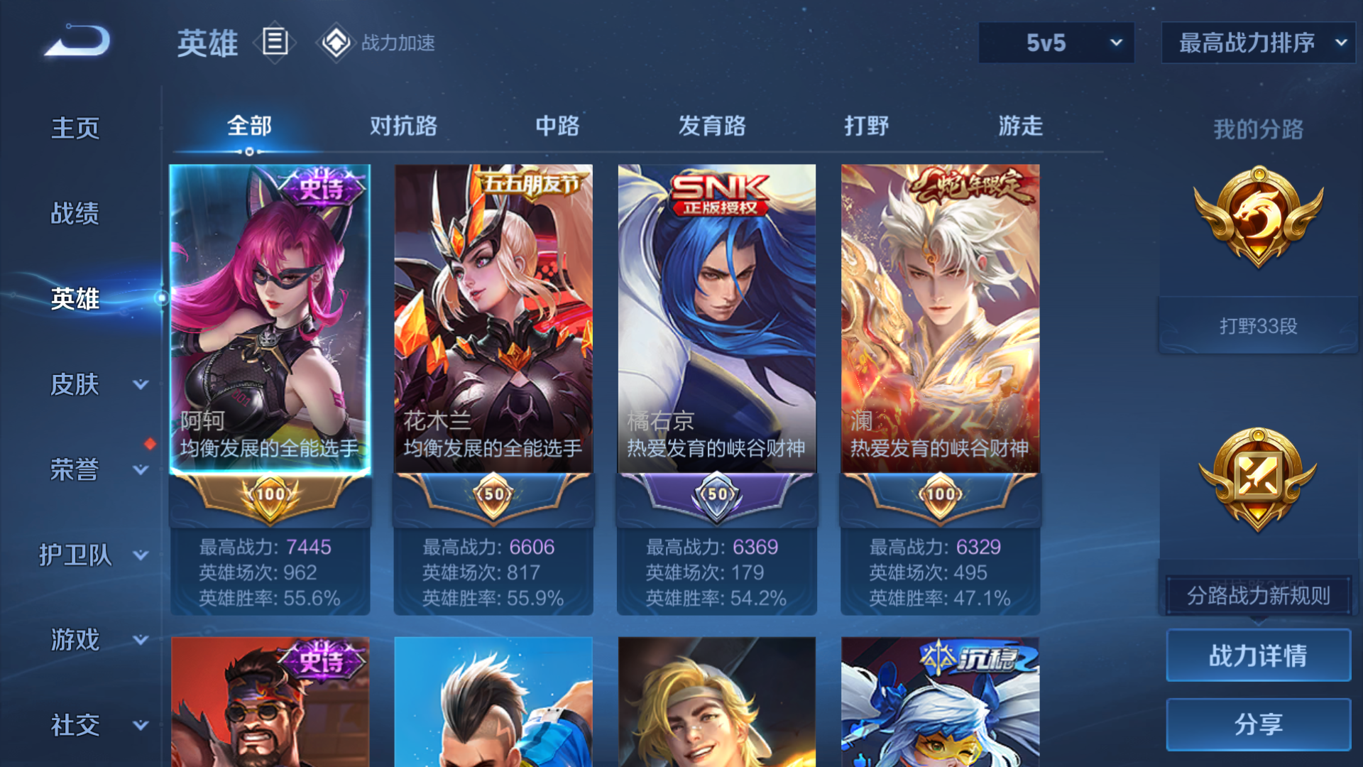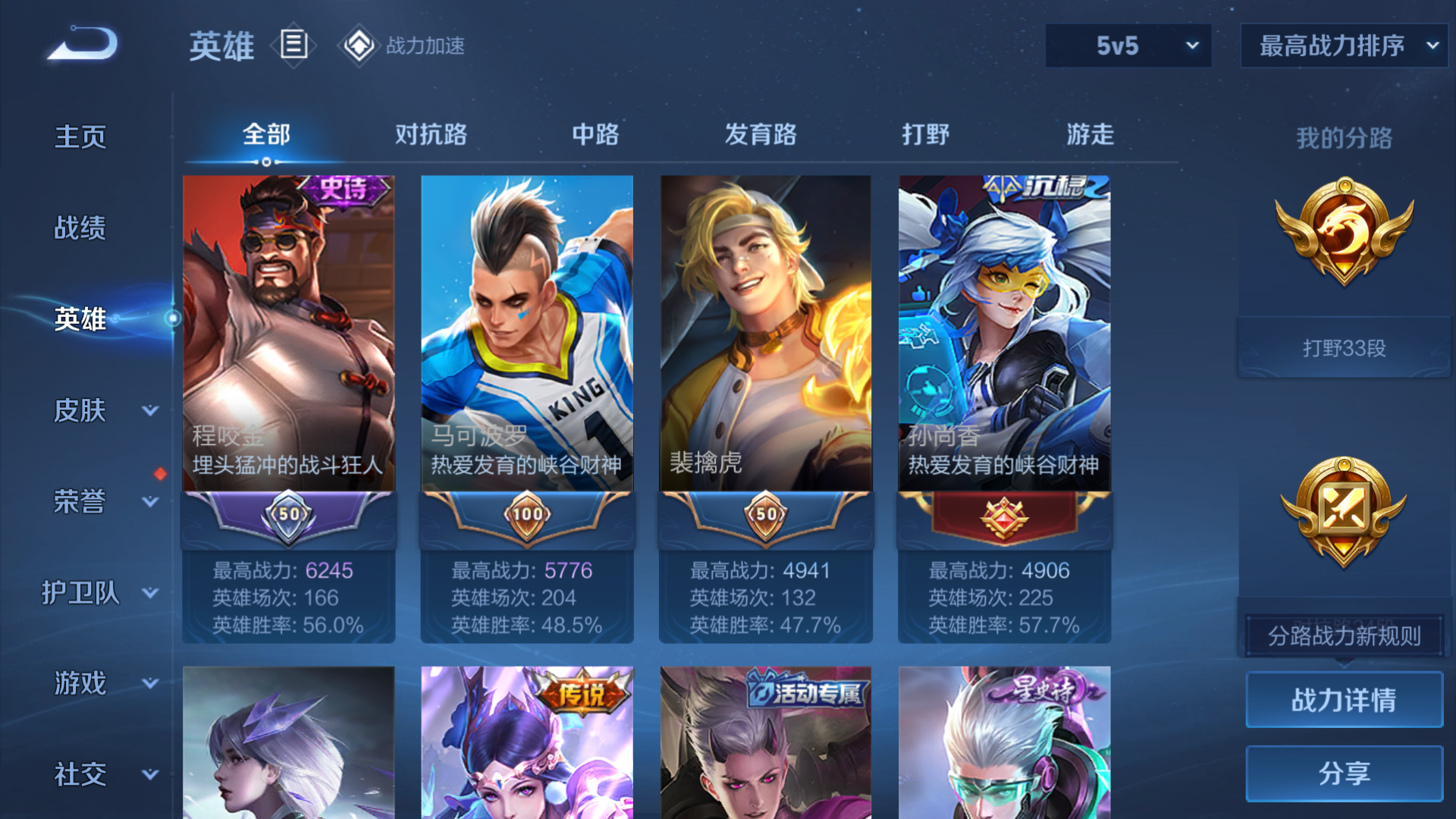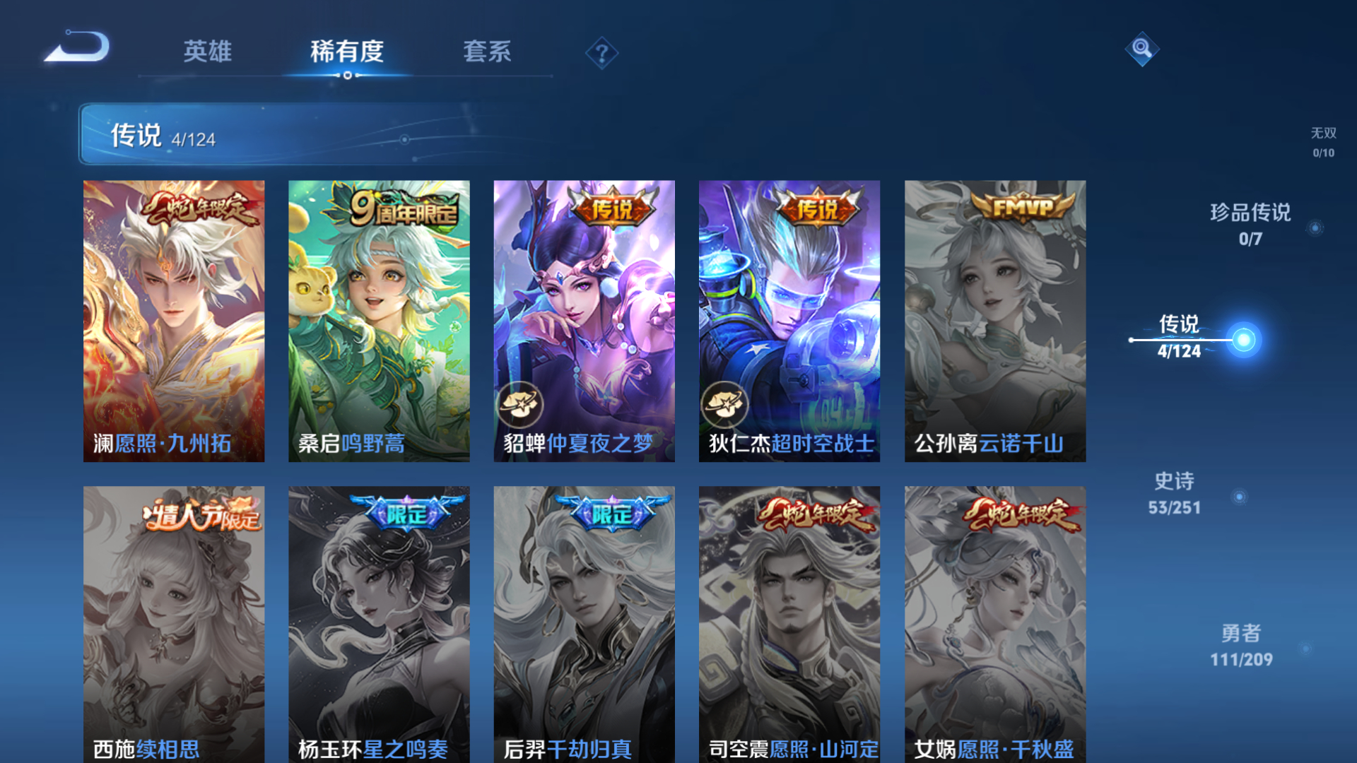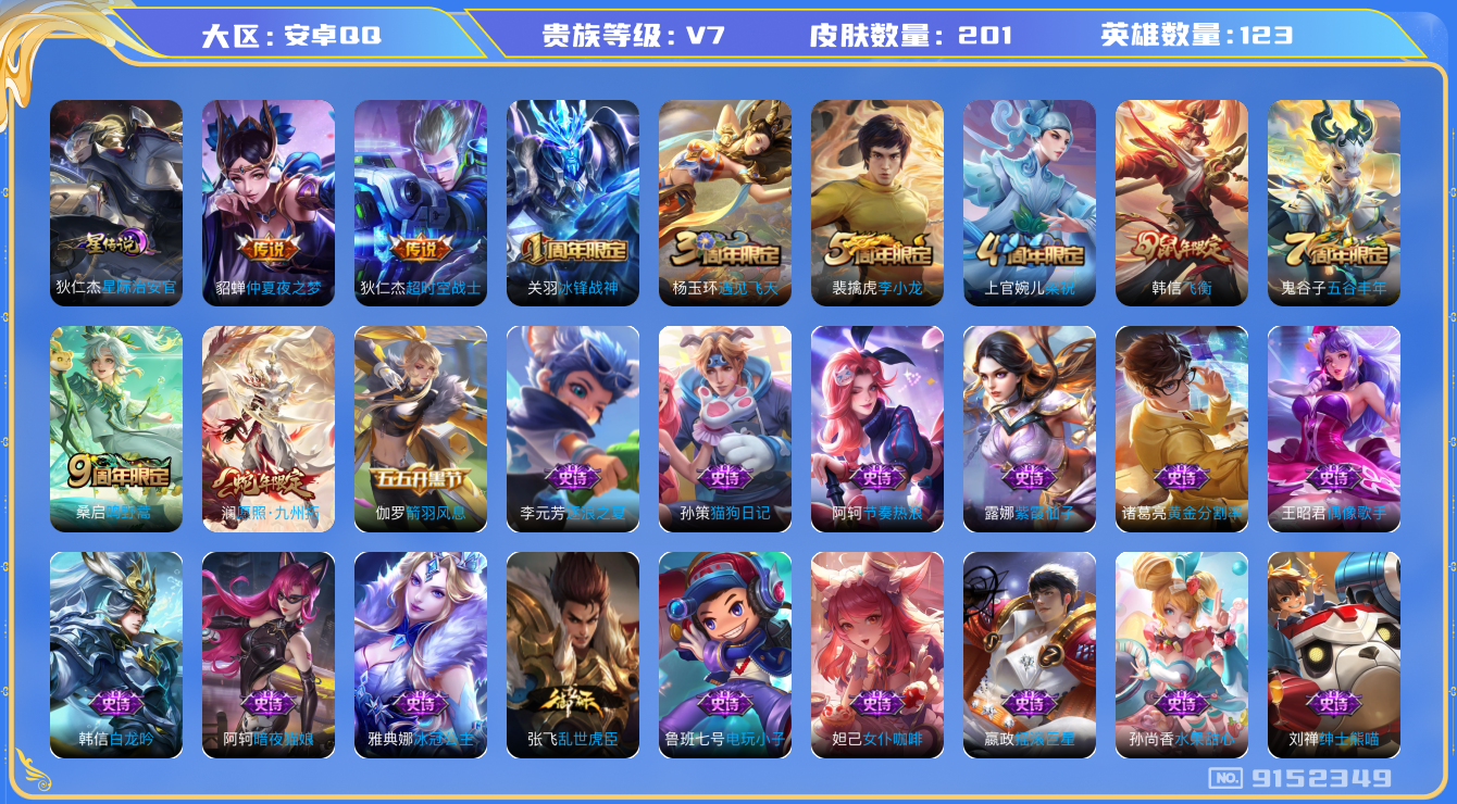 [9152349]实名: 不可修改 贵族等级: v7 英雄数: 123 皮肤数: 201 星传说: 星际治安官 传说皮: 仲夏夜之梦超时空战士-狄仁杰 限定皮: 冰锋战神遇见飞天李小龙梁祝飞衡五谷丰年鸣野蒿愿照·九州拓 亮点: 有1水晶 tt1121