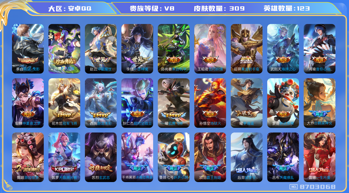 [8703068]荣耀水晶:鸣剑·曳影 珍品传说:时之奇旅-孙策 传说皮:李游龙清影小青龙黄金射手座地狱火仲夏夜之梦大飞蛾海洋之心末日机甲-孙尚香绿蚂蚱一念神魔淬星耀世冠军飞将云鹰飞将小将军音你心动-周瑜胖达荣荣乞巧织情超时空战士-狄仁杰 珍宝阁皮:胡桃夹子 限定皮:鸣野蒿至尊宝白虎志电光耗子凤求凰白切鸡凤凰于飞梅西白鹤梁神女神威电光马子瑞麟志木兰年限遇见飞天冰锋战神游园惊梦梁祝天狼狩猎者天狼溯光者李小龙玄武志苏烈年限永曜之星如梦令-嫦娥如梦令-后羿霸王别姬-项羽一生所爱大圣娶亲天魔缭乱青春决赛季冰霜恋舞曲乒乒小将蜜橘之夏热情桑巴神奇女侠 史诗皮:百相守梦-百里守约破空之剑紫霞仙子白龙吟黄金分割率特工魅影千年之狐冰冠公主魅语偶像歌手末日机甲-吕布猫狗日记-孙策乱世虎臣节奏热浪女仆咖啡摇滚巨星水果甜心绅士熊喵星夜王子心灵骇客功夫厨神德古拉伯爵暗隐猎兽者幽灵船长鬼剑武藏心灵战警天秀·启明舞动绿茵地狱岩魂繁星吟游呼啦呼啦缤纷独角兽乘风破浪逐浪之夏月团寄思水晶猎龙者曙光守护者箭羽风息金属风暴原初追逐者圣诞狂欢圣诞恋歌鹰眼统帅王者之锤暗夜贵公子魅力维加斯黎明之约