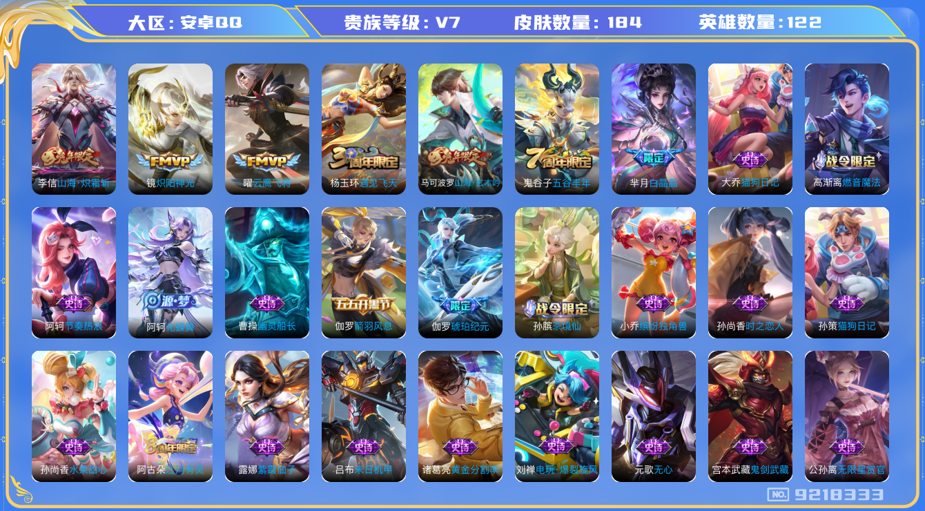 [9218333]v7 3传说 122英雄 184皮肤 可修改实名 传说皮:山海·炽霜斩李信年限云鹰飞将小将军炽阳神光 珍宝阁皮:胡桃夹子蔷薇恋人 限定皮:白晶晶遇见飞天五谷丰年山海·玄木吟马可年限 史诗皮:茶境仙化蝶舞琥珀纪元伽罗紫霞仙子黄金分割率特工魅影电玩·爆裂旋风无限星赏官晚萤冰冠公主蒙恬荣光圣徽高渐离燃音魔法百解令蒙犽江河有灵末日机甲-吕布猫狗日记-孙策猫狗日记-大乔时之恋人-孙尚香节奏热浪女仆咖啡水果甜心时之奇旅-安琪拉暗隐猎兽者幽灵船长鬼剑武藏心灵战警乐园奇幻夜纤云弄巧拒霜思缤纷独角兽逐浪之夏水晶猎龙者热力回旋箭羽风息金属风暴圣诞恋歌鹰眼统帅无心未来纪元-赵云