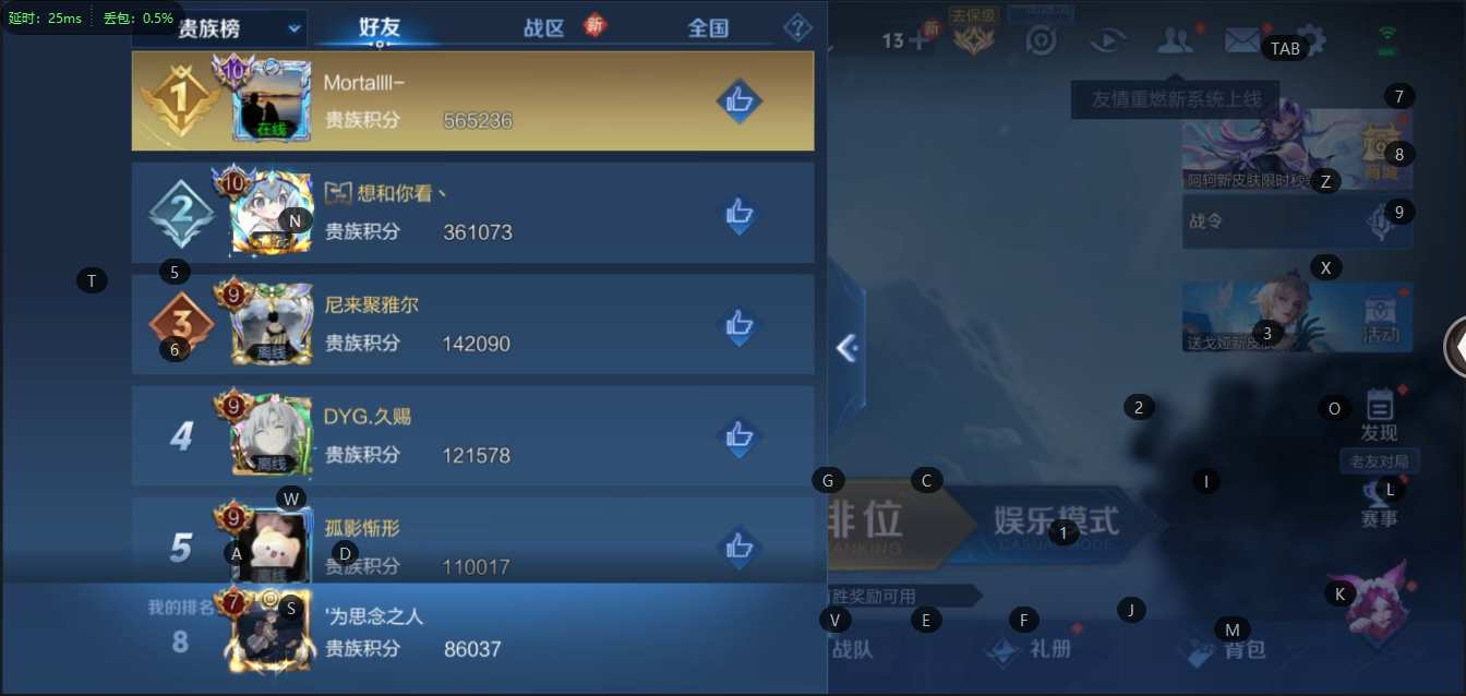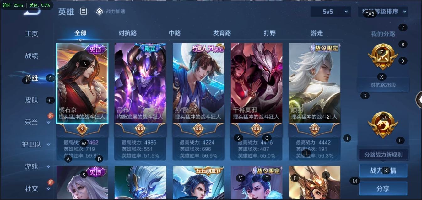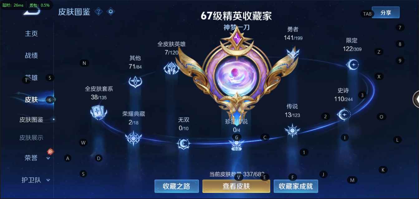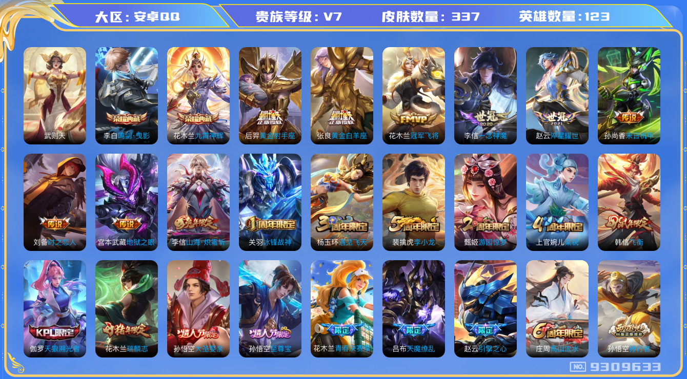 [9309633]贵族v7 荣耀典藏3 传说皮肤13 史诗皮肤110 皮肤数量337 皮肤价值:262688 英雄123 至尊星耀v