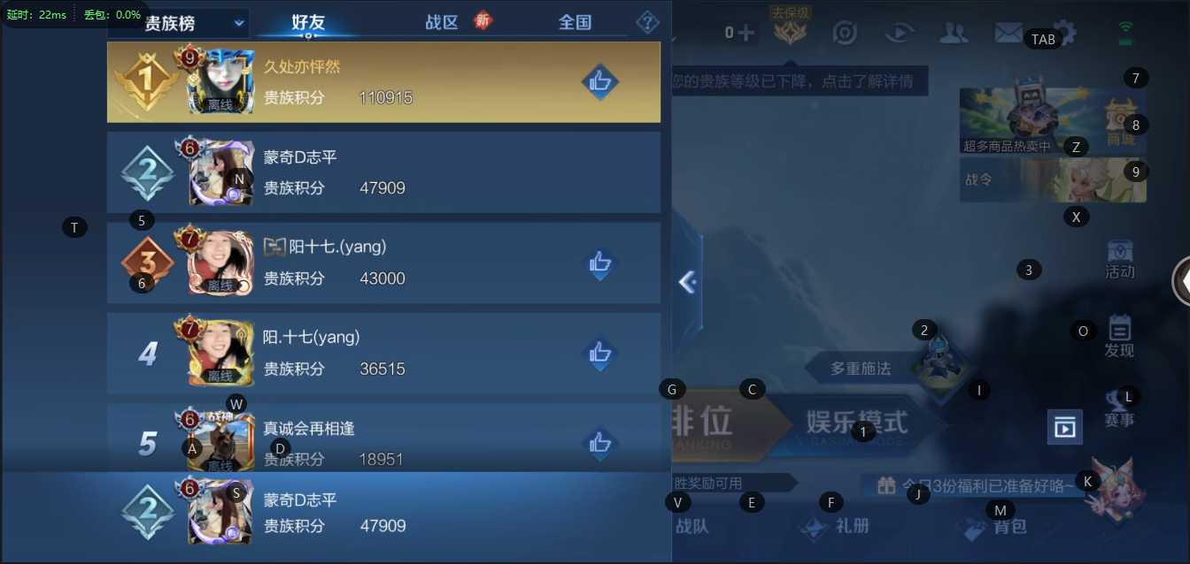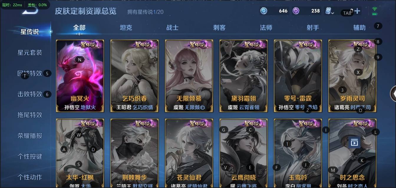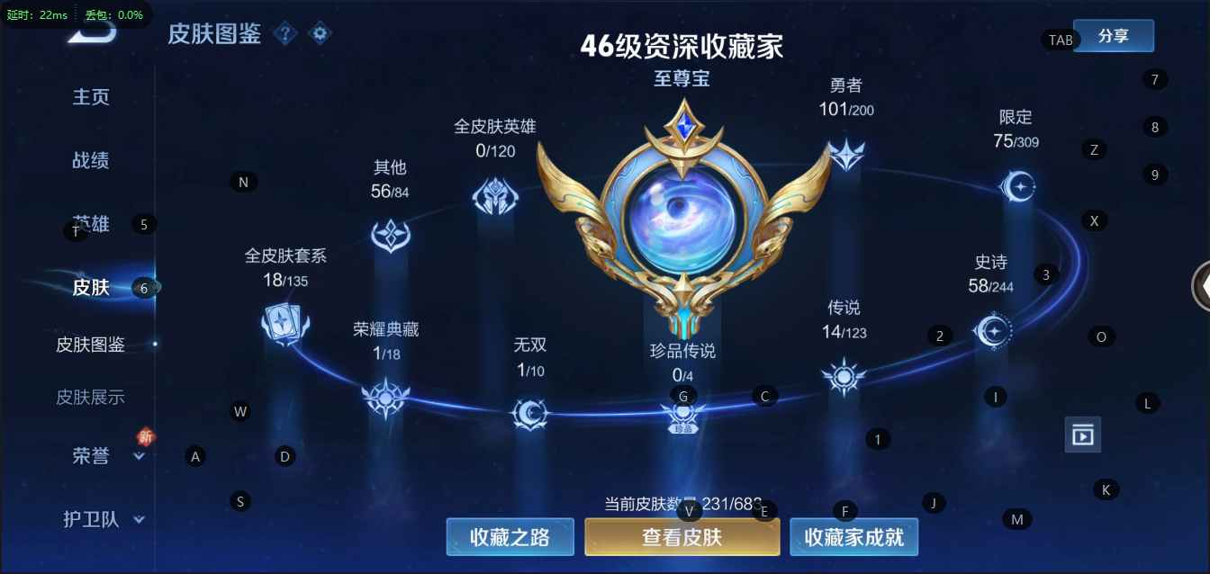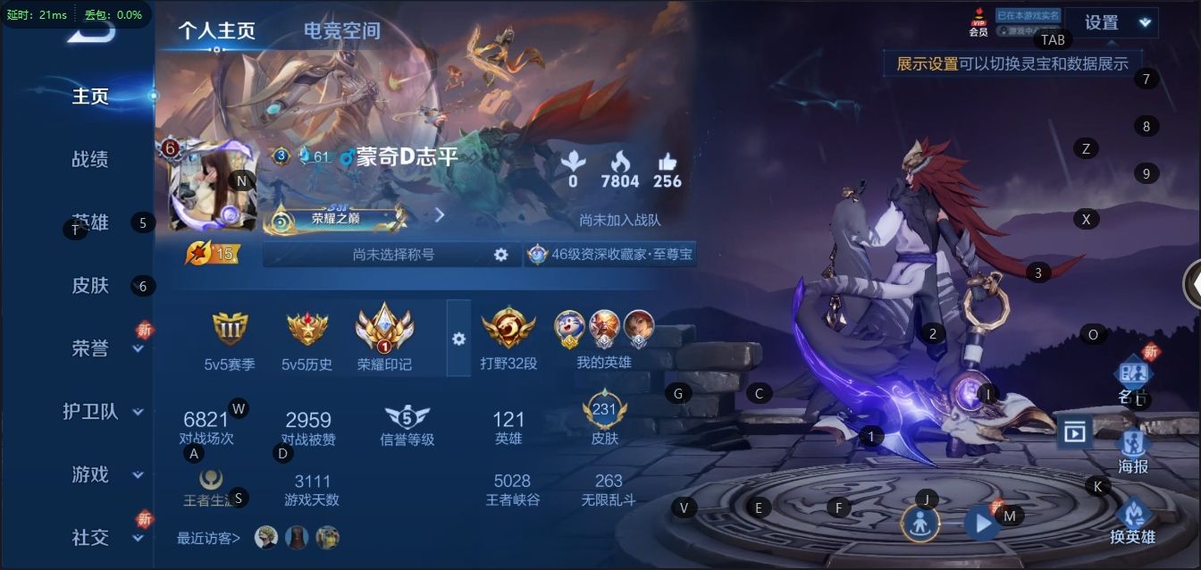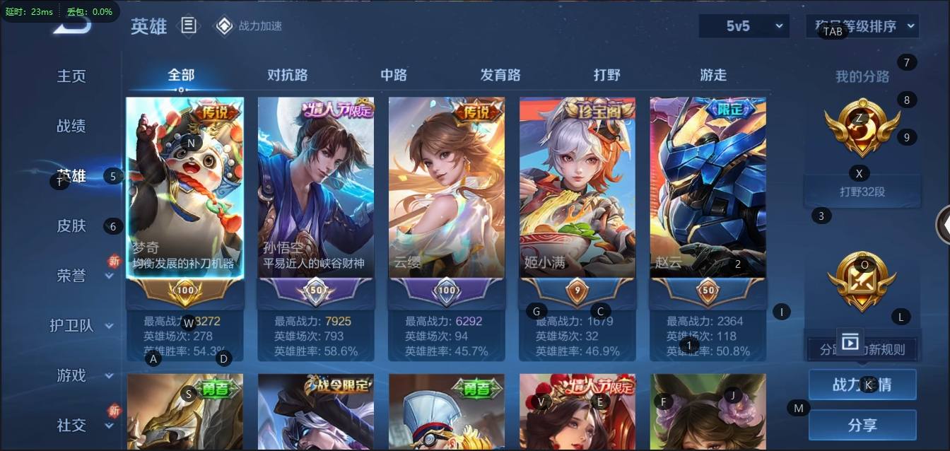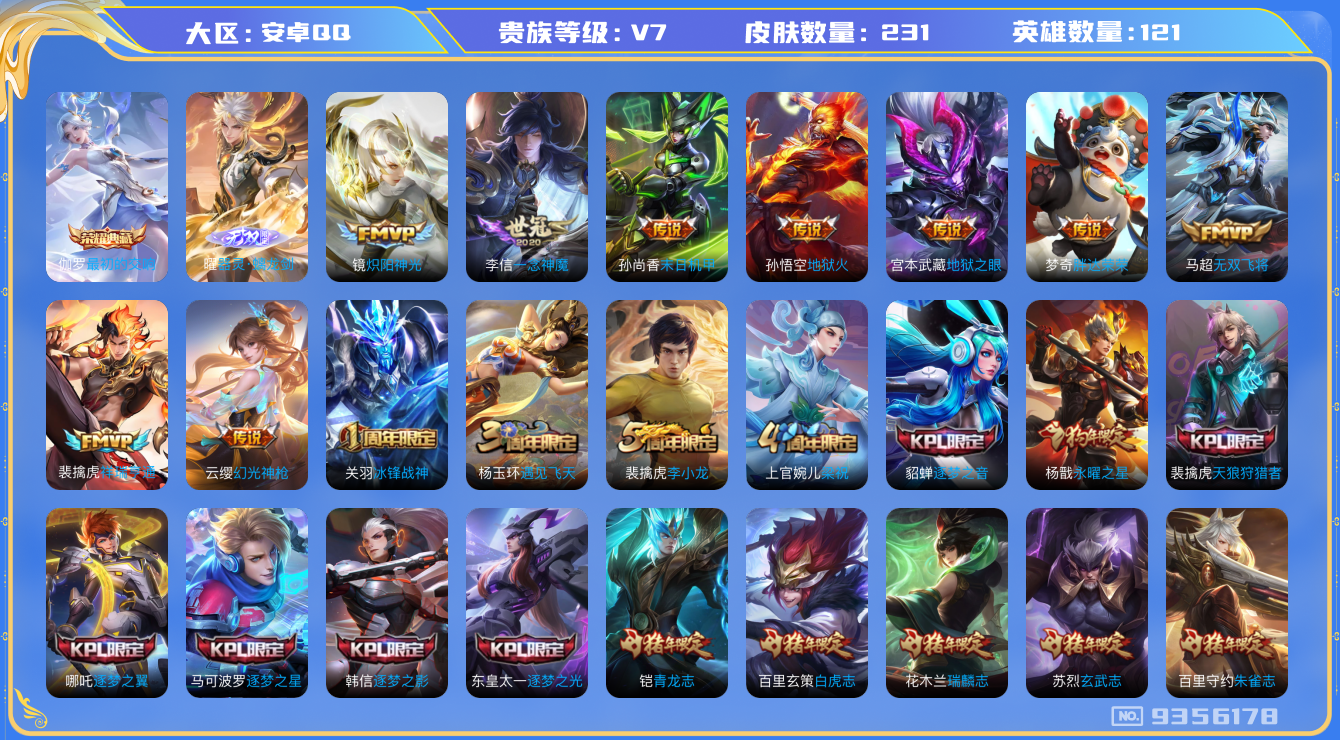 [9356178]贵族v7 荣耀典藏1 无双1 传说皮肤14 史诗皮肤58 皮肤数量231 皮肤价值:161918 英雄121 至尊星耀iv