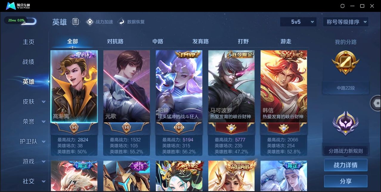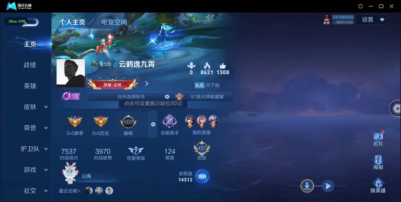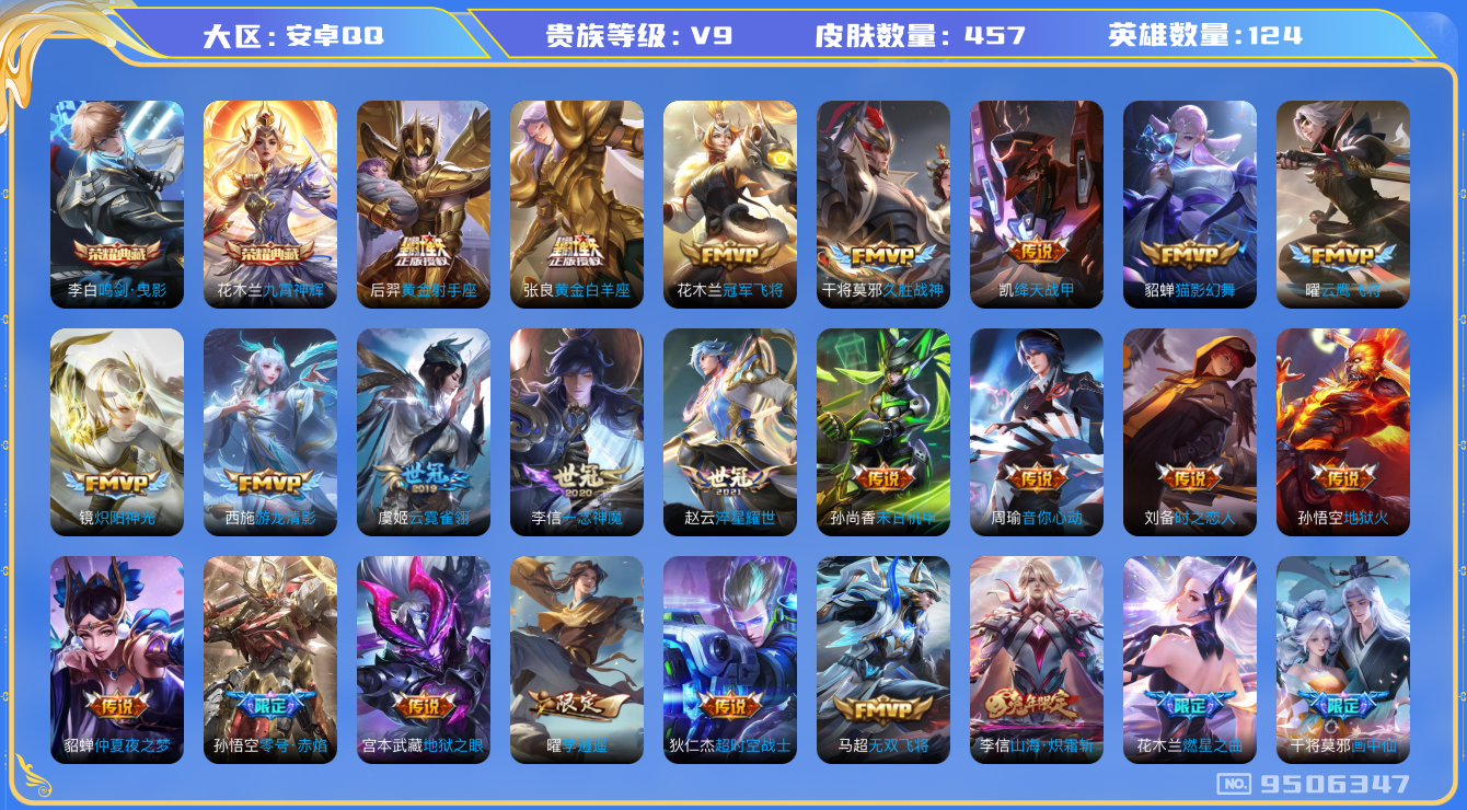 [9506347]贵族v9 荣耀典藏2 传说皮肤54 史诗皮肤148 皮肤数量457 皮肤价值:388304 英雄124 绝世王者