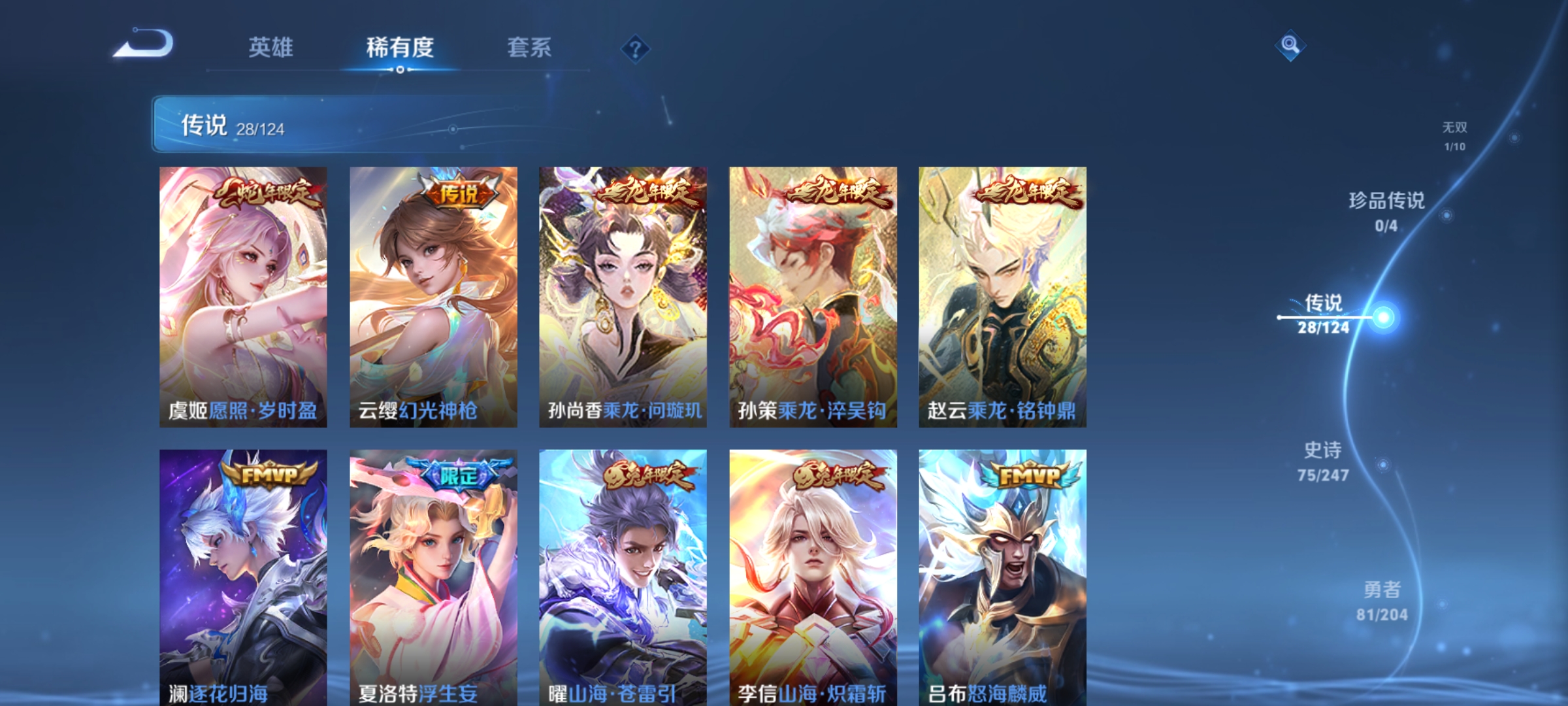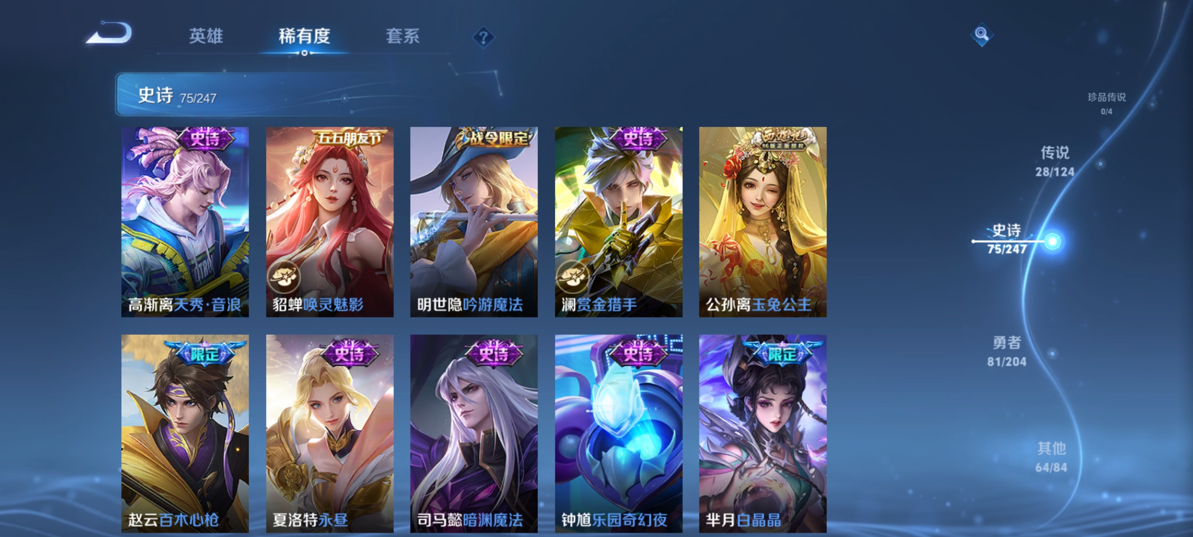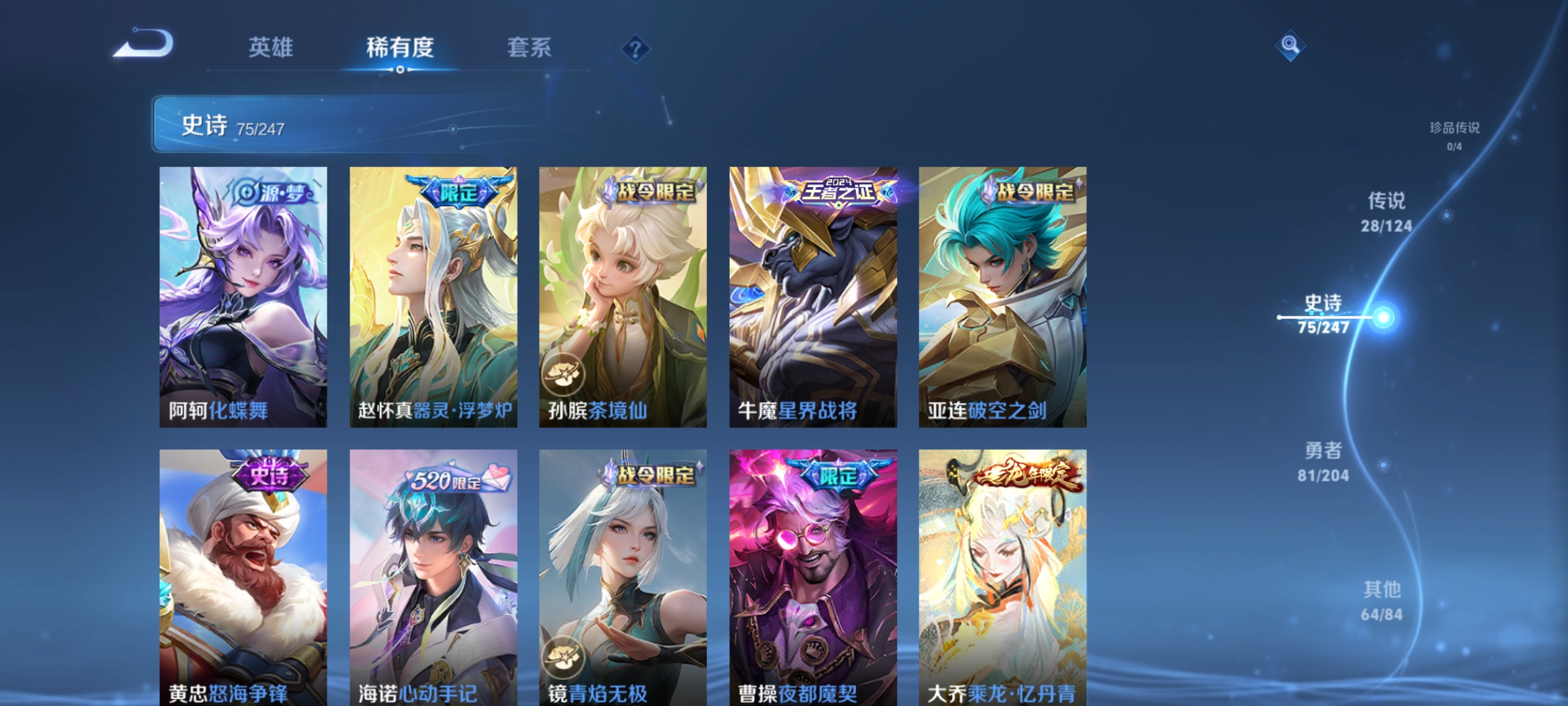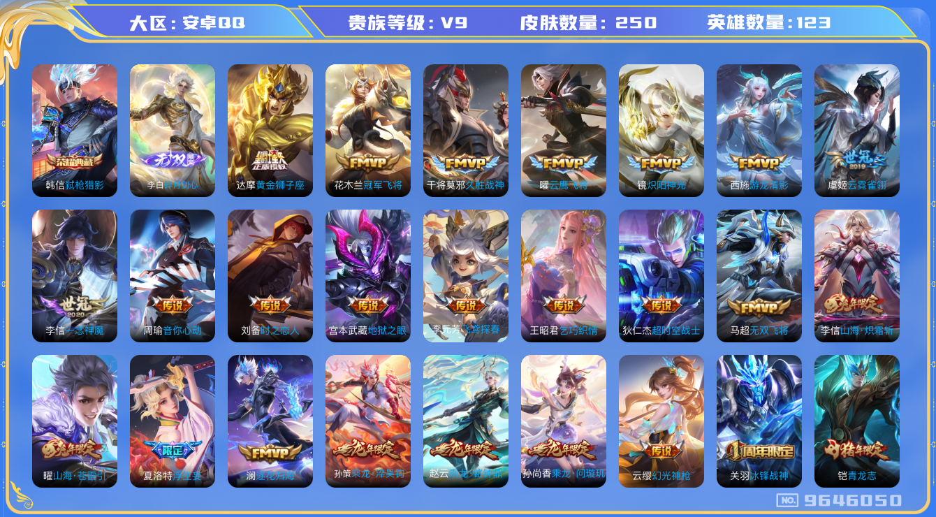 [9646050]韩信典藏李白无双龙年限定全武则天虞姬蛇年限久胜小将军孙尚香年限小青龙澜逐花归海玉兔公主白晶晶紫霞马可年限-不可二次-122英雄-250皮肤-1典藏-1无双-28传说-75史诗 游龙清影-西施 炽阳神光-镜 山海·苍雷引-曜 寅虎·赤拳-裴擒虎 山海·炽霜斩-李信 枫霜尽-橘右京 浮生妄-夏洛特 降魔-墨子 山海·玄木吟-马可波罗 冰锋战神-关羽 冰冠公主-雅典娜 白晶晶-芈月 街头霸王-韩信