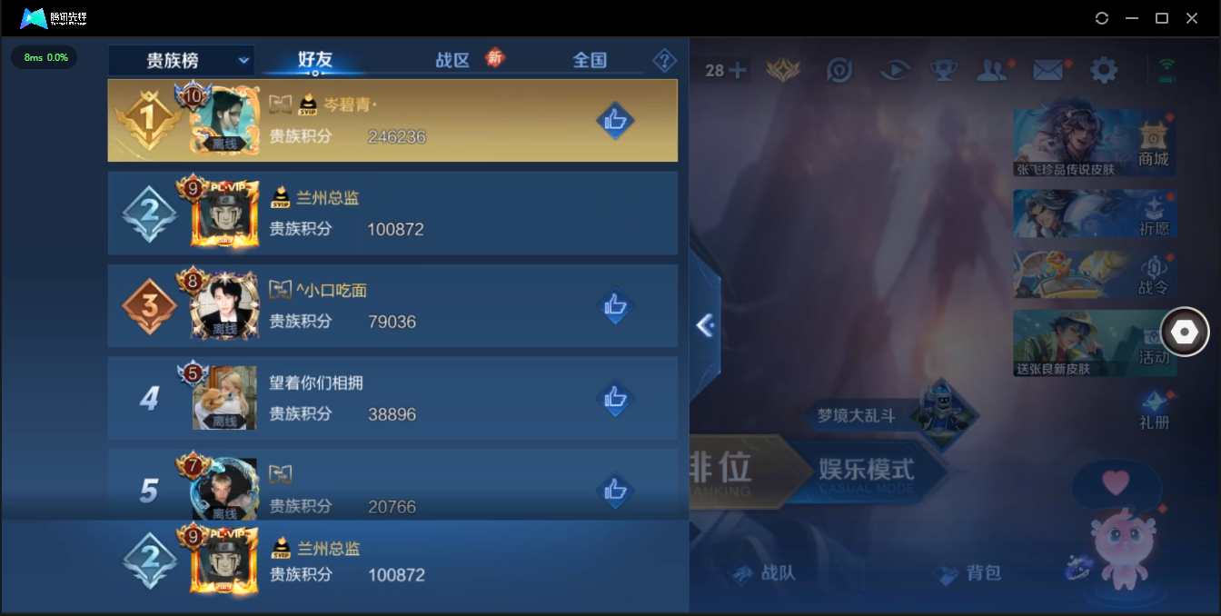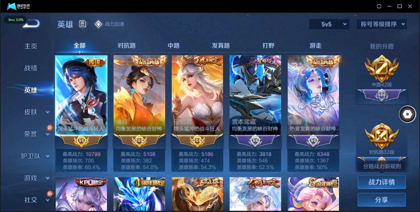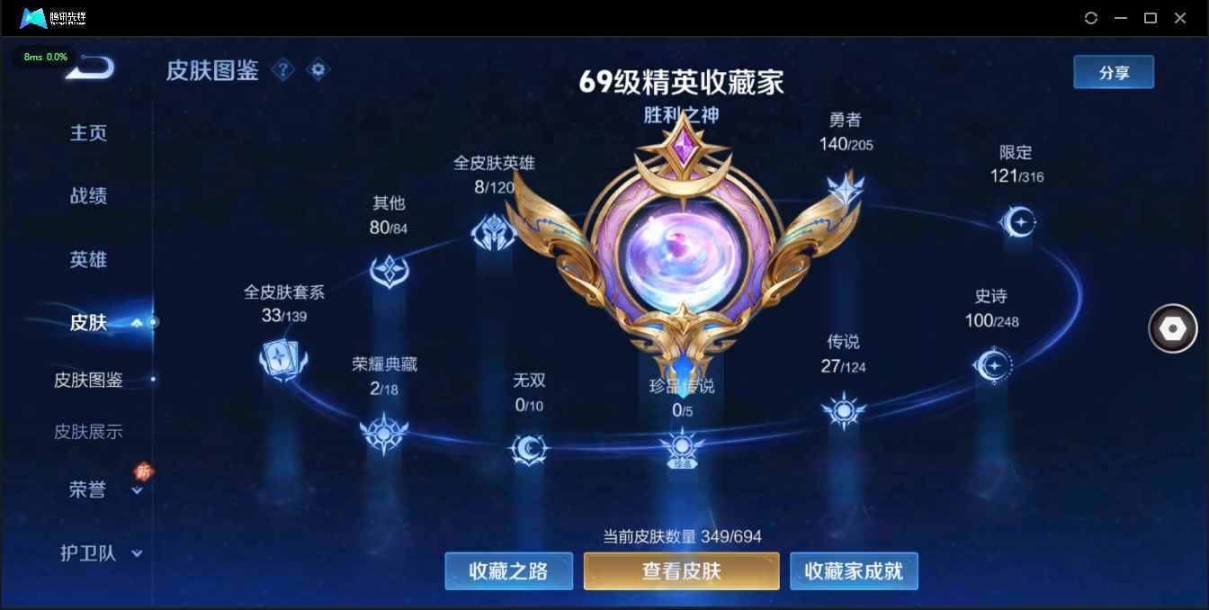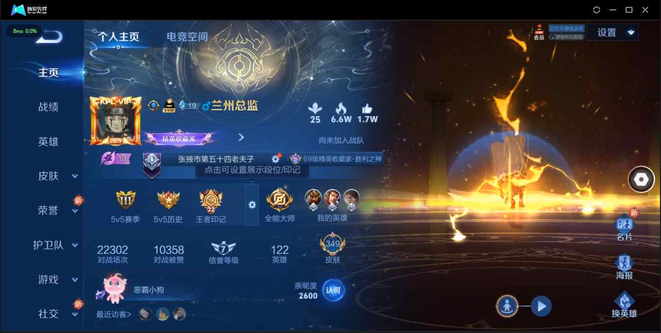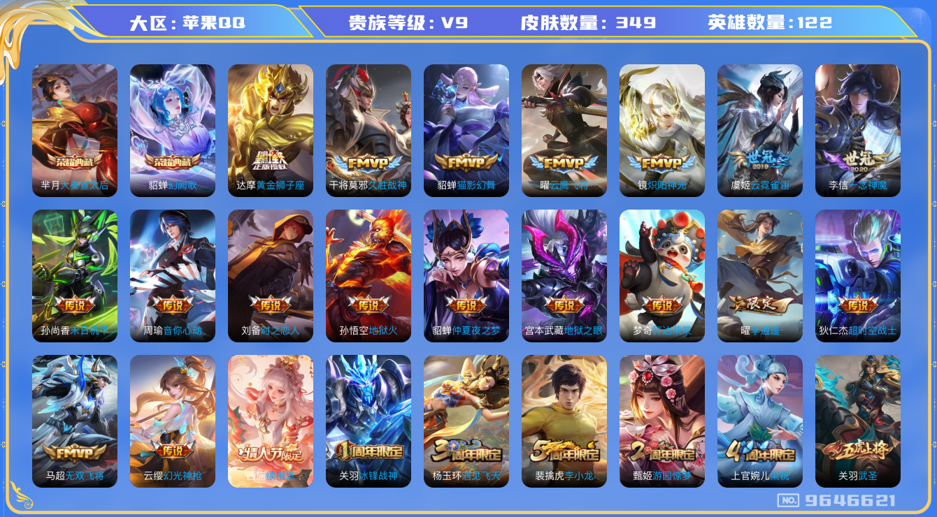 [9646621]贵族v9 荣耀典藏2 传说皮肤27 史诗皮肤100 皮肤数量349 皮肤价值:279922 英雄122 至尊星耀iii