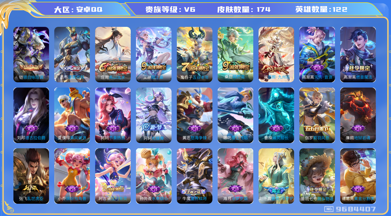 [9684407]v6 1典藏 2传说 122英雄 174皮肤 可修改实名 荣耀水晶:银白咏叹调倪克斯侍卫 珍宝阁皮:妄想食味女武神 限定皮:愿照·九州拓澜年限逐霄战戟陌上桑鸣野蒿高山流水五谷丰年 史诗皮:苍鳞隐世星界战将器灵·浮梦炉糖绘人间化蝶舞破空之剑蔬乡物语鲁班七号蒙犽顽岩魄怒海争锋黄金分割率特工魅影千年之狐浮梦罗烟晚萤高渐离燃音魔法百解令蒙犽江河有灵乱世虎臣节奏热浪修罗水果甜心绅士熊喵星夜王子心灵骇客功夫厨神德古拉伯爵暗隐猎兽者幽灵船长鬼剑武藏心灵战警地狱岩魂纤云弄巧拒霜思缤纷独角兽乘风破浪逐浪之夏水晶猎龙者箭羽风息金属风暴圣诞恋歌鹰眼统帅暗夜贵公子魅力维加斯黎明之约雪上飞焰天秀·音浪未来纪元-赵云