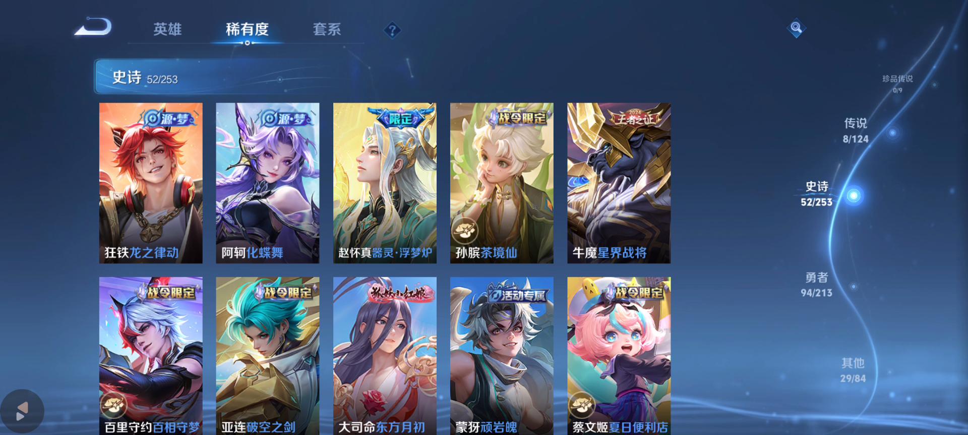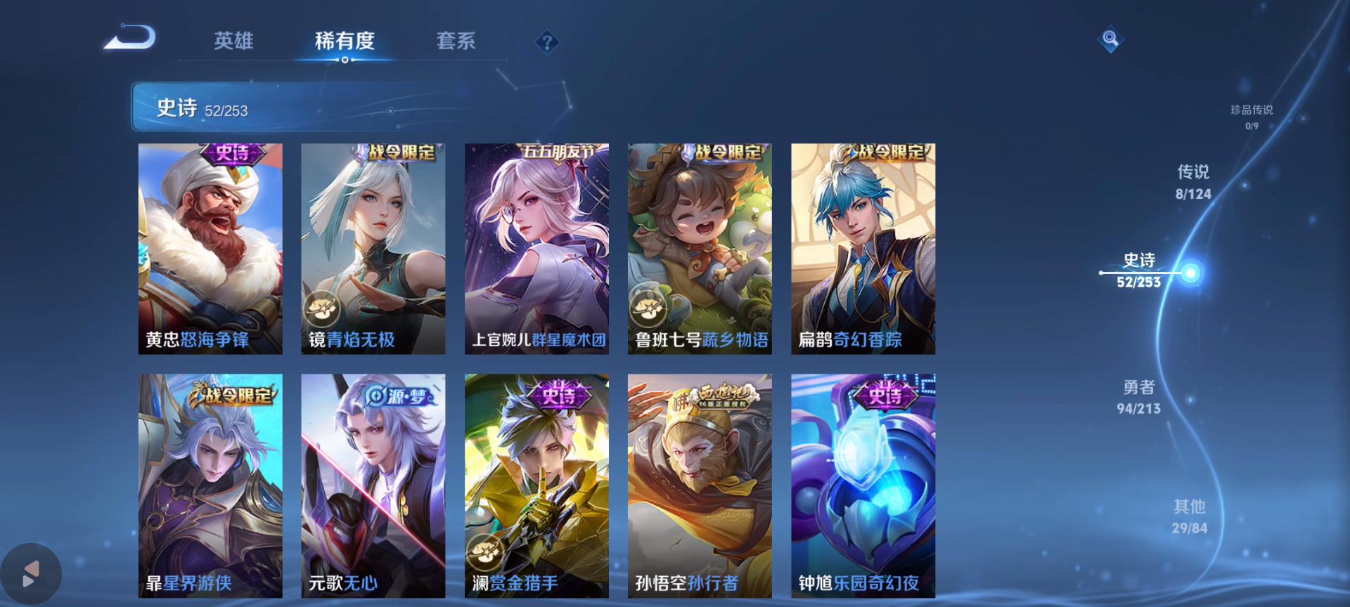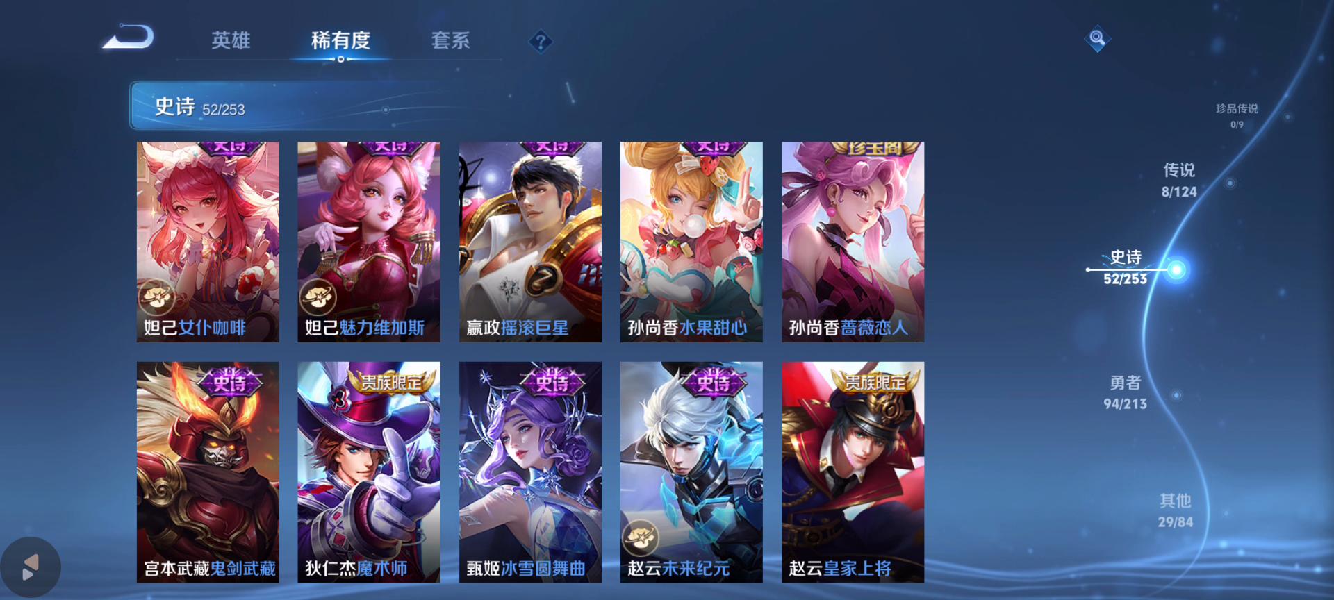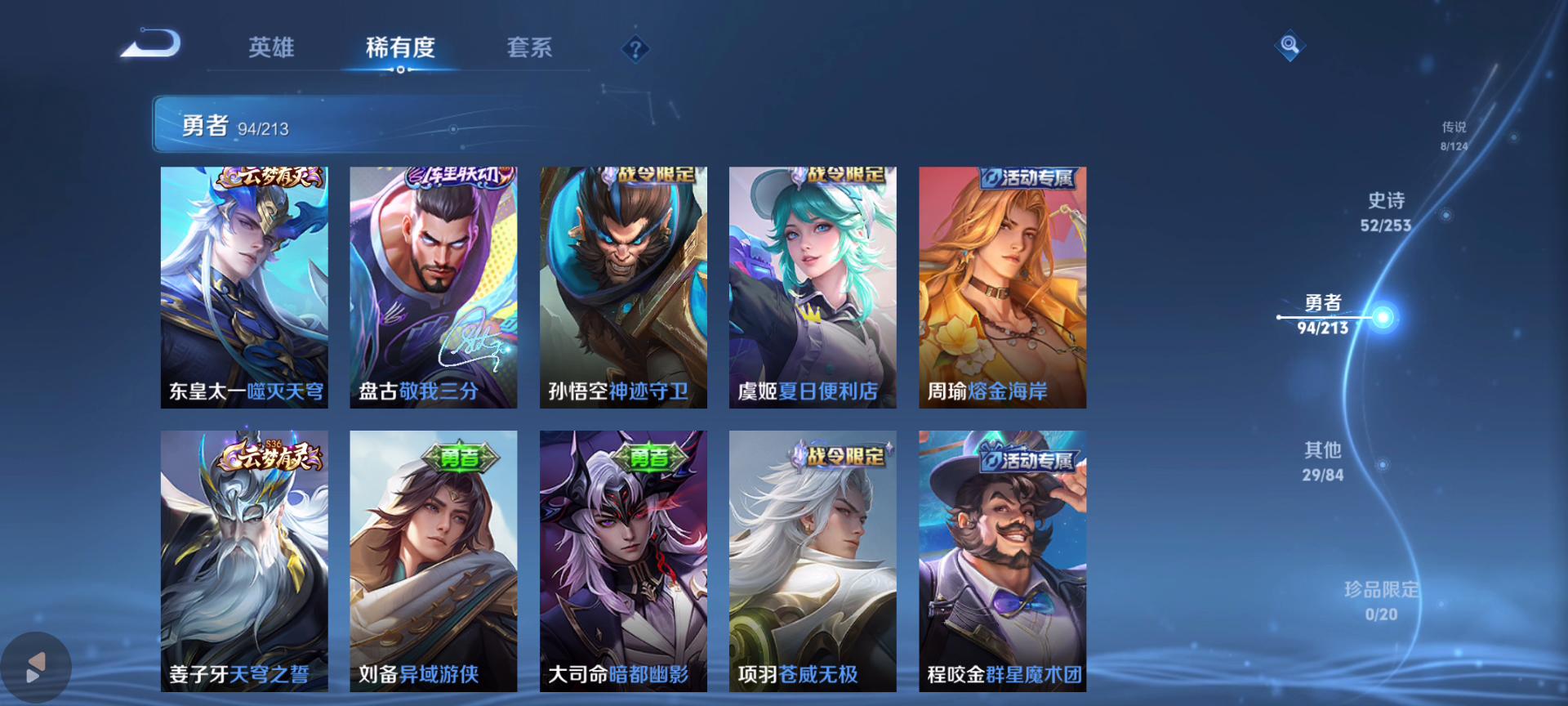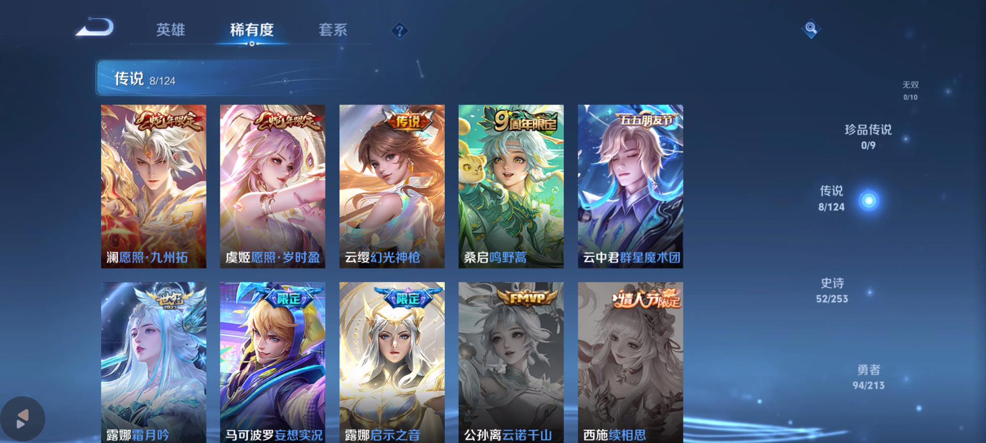 [9685847]【v7 5100场次 8传说 52史诗】183皮肤-123英雄【传说皮肤】 澜-愿照·九州拓 虞姬-愿照·岁时盈 马可波罗-妄想实况 云中君-群星魔术团 露娜-启示之音 露娜-霜月吟 云缨-幻光神呛 桑启-鸣野蒿【史诗皮肤】 大司命-东方月初 盘古-敬我三分 孙悟空-孙行者 阿轲-暗夜猫娘 上官婉儿-群星魔术团 鲁班七号-蔬乡物语 露娜-紫霞仙子 甄姬-冰雪圆舞曲 杨戬-天秀·启明 大乔-猫狗日记 阿轲-节奏热浪 铠-曙光守护者 百里守约-特工魅影 诸葛亮-黄金分割率 兰陵王-暗隐猎兽者 小乔-缤纷独角兽 夏侯惇-乘风破浪 花木兰-水晶猎龙者 吕布-末日机甲 李白-千年之狐 曹操-幽灵船长 妲己-魅力维加斯 孙尚香-水果甜心 妲己-女仆咖啡 刘邦-德古拉伯爵 雅典娜-冰冠公主 钟馗-乐园奇幻夜 宫本武藏-鬼剑武藏 墨子-金属风暴 嬴政-摇滚巨星 赵云-未来纪元 元歌-无心 云中君-纤云弄巧 狄仁杰-鹰眼统帅 孙尚香-蔷薇恋人 扁鹊-奇幻香踪 暃-星界游侠 狄仁杰-魔术师 赵云-皇家上将 ky5453 营地id:1754104200