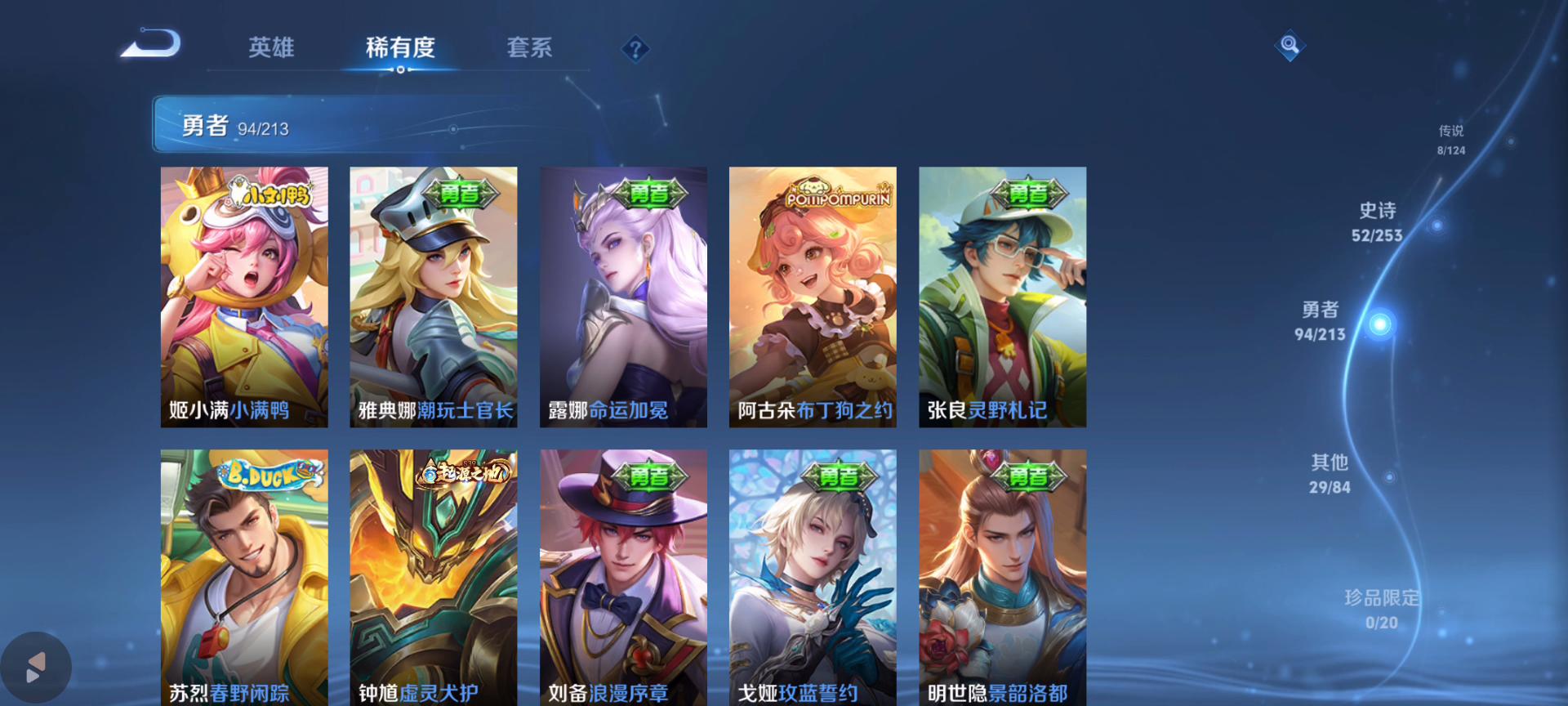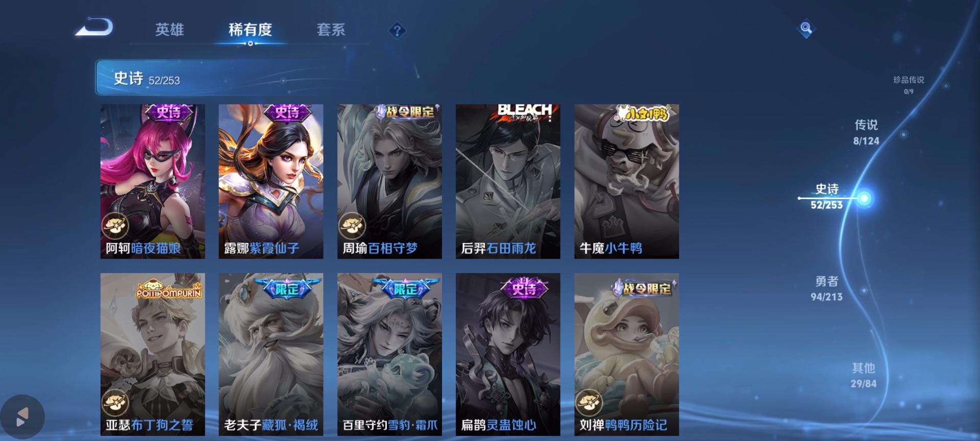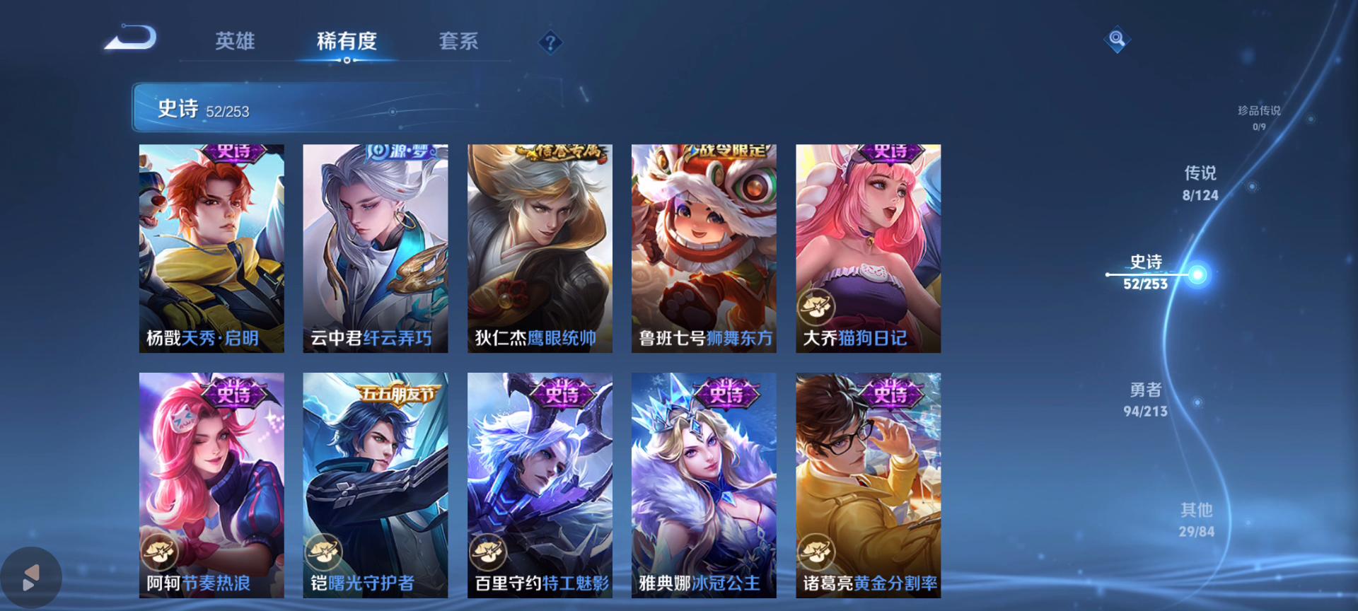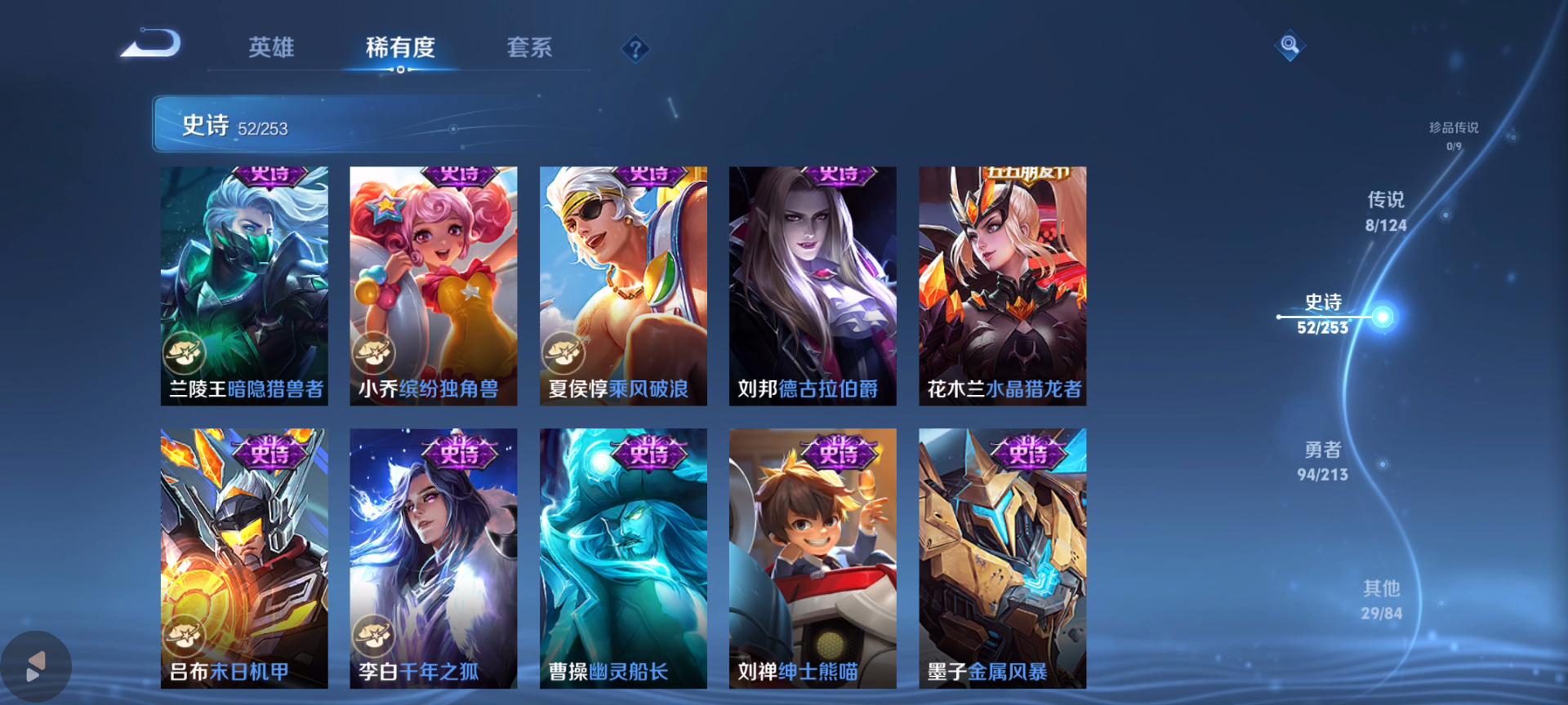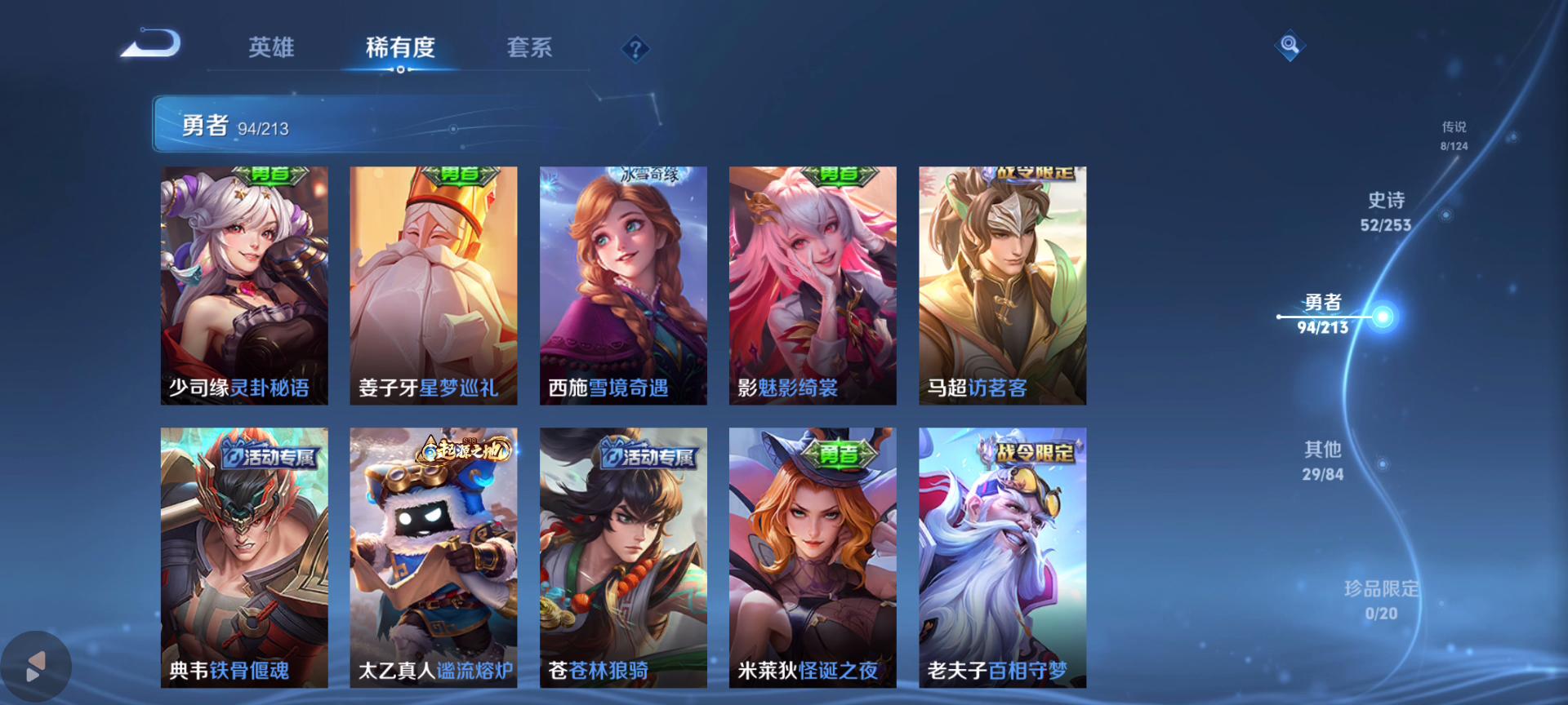 [9685847]【v7 5100场次 8传说 52史诗】183皮肤-123英雄【传说皮肤】 澜-愿照·九州拓 虞姬-愿照·岁时盈 马可波罗-妄想实况 云中君-群星魔术团 露娜-启示之音 露娜-霜月吟 云缨-幻光神呛 桑启-鸣野蒿【史诗皮肤】 大司命-东方月初 盘古-敬我三分 孙悟空-孙行者 阿轲-暗夜猫娘 上官婉儿-群星魔术团 鲁班七号-蔬乡物语 露娜-紫霞仙子 甄姬-冰雪圆舞曲 杨戬-天秀·启明 大乔-猫狗日记 阿轲-节奏热浪 铠-曙光守护者 百里守约-特工魅影 诸葛亮-黄金分割率 兰陵王-暗隐猎兽者 小乔-缤纷独角兽 夏侯惇-乘风破浪 花木兰-水晶猎龙者 吕布-末日机甲 李白-千年之狐 曹操-幽灵船长 妲己-魅力维加斯 孙尚香-水果甜心 妲己-女仆咖啡 刘邦-德古拉伯爵 雅典娜-冰冠公主 钟馗-乐园奇幻夜 宫本武藏-鬼剑武藏 墨子-金属风暴 嬴政-摇滚巨星 赵云-未来纪元 元歌-无心 云中君-纤云弄巧 狄仁杰-鹰眼统帅 孙尚香-蔷薇恋人 扁鹊-奇幻香踪 暃-星界游侠 狄仁杰-魔术师 赵云-皇家上将 ky5453 营地id:1754104200
