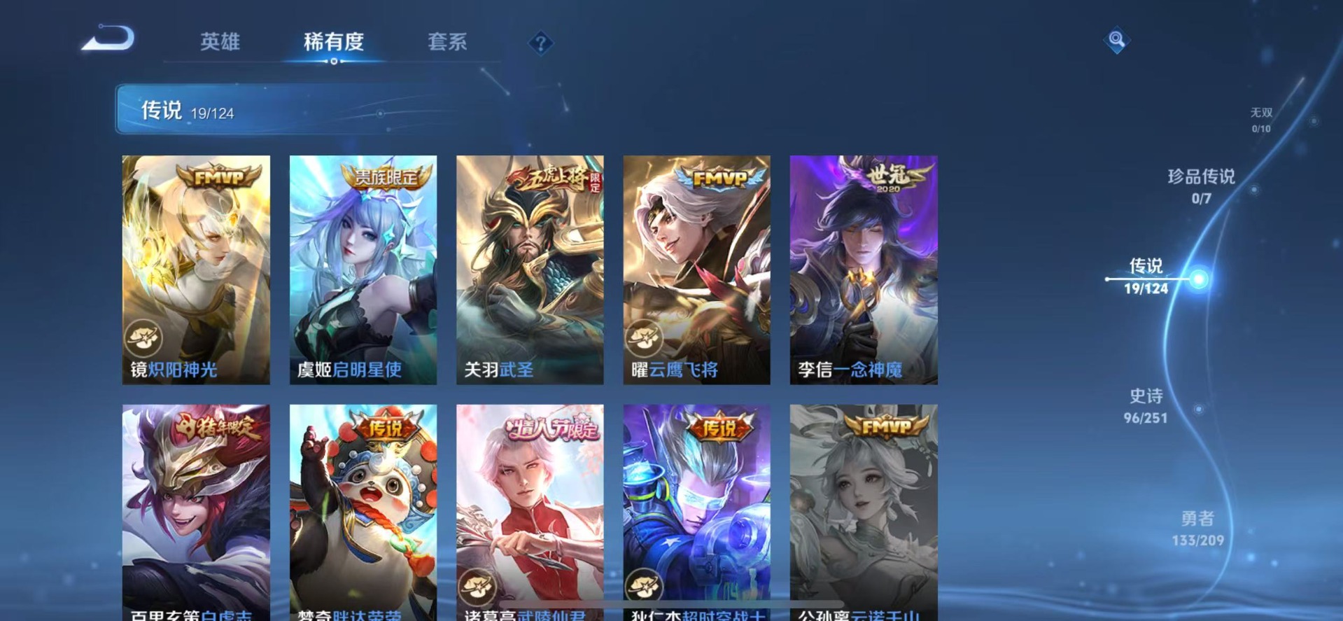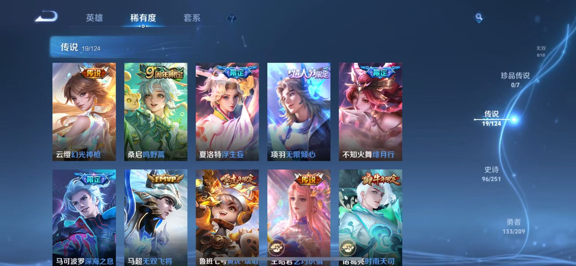 v8 1典藏 19传说 122英雄 307皮肤 可修改实名 女号 荣耀水晶:九霄神辉木兰典藏 传说皮:幻光神呛一念神魔云鹰飞将小将军炽阳神光无双飞将胖达荣荣乞巧织情超时空战士-狄仁杰浮生妄 珍宝阁皮:万物之道蔷薇恋人女武神 限定皮:逐霄战戟鸣野蒿至尊宝白虎志电光耗