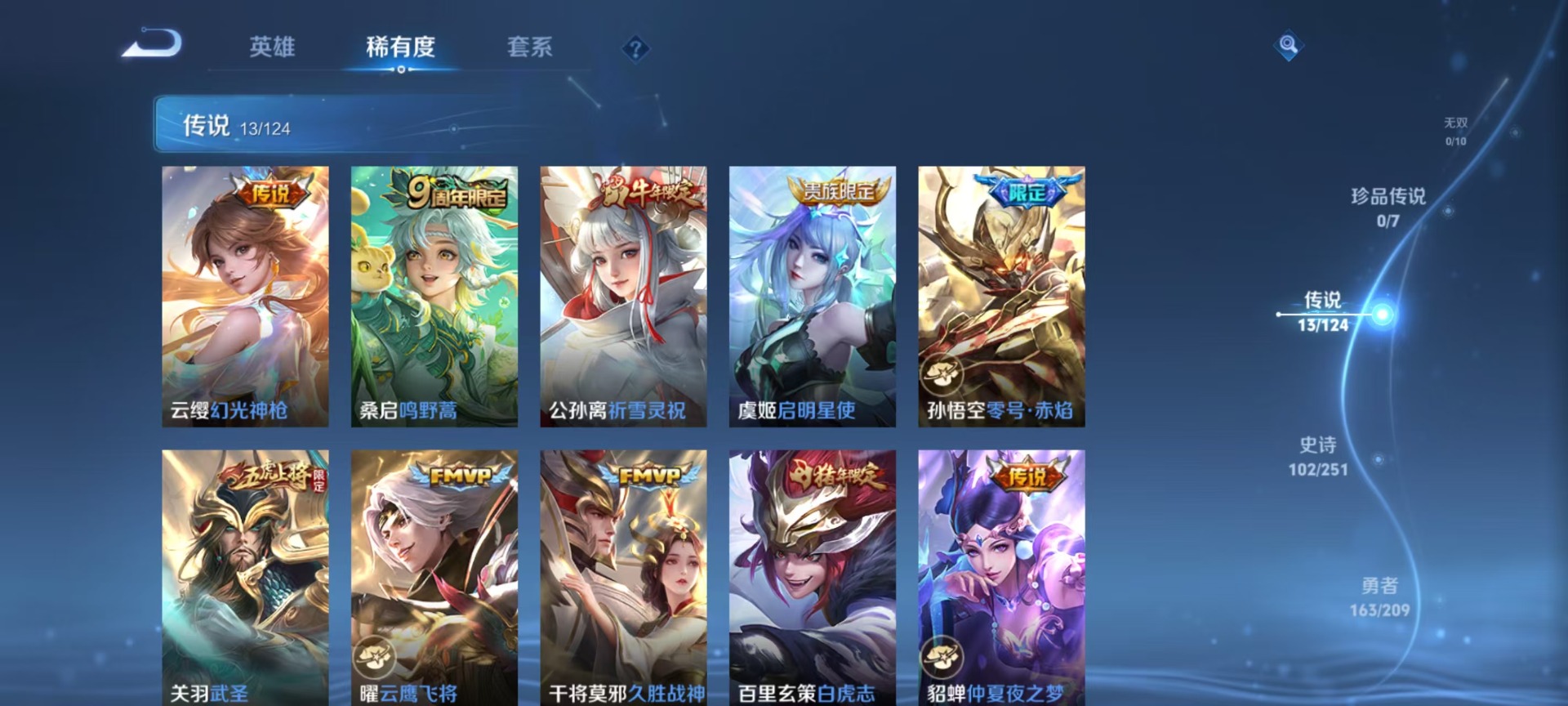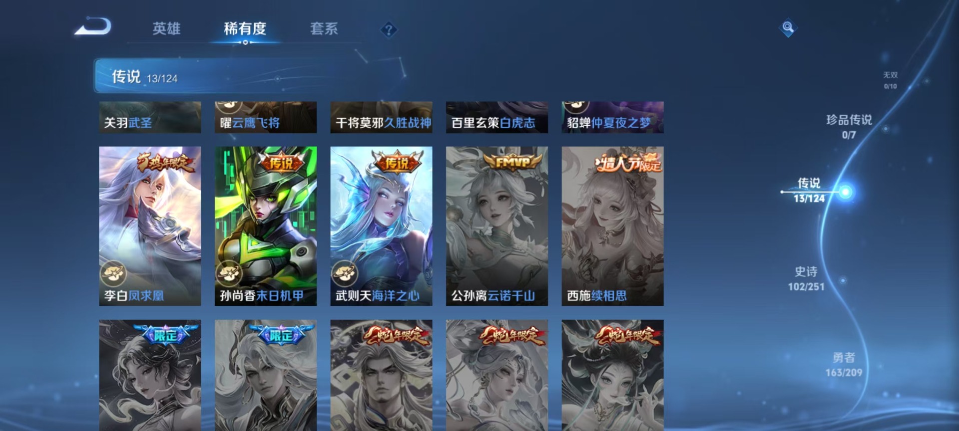 v8 1典藏 13传说 125英雄 360皮肤 典藏英雄武则天 可修改实名 女号 荣耀水晶:拾光映像瑶典藏 传说皮:幻光神呛零号·赤焰仲夏夜之梦大飞蛾海洋之心末日机甲-孙尚香绿蚂蚱久胜战神云鹰飞将小将军 珍宝阁皮:妄想食味优雅恋人女武神 限定皮:逐霄战戟鸣野蒿白虎