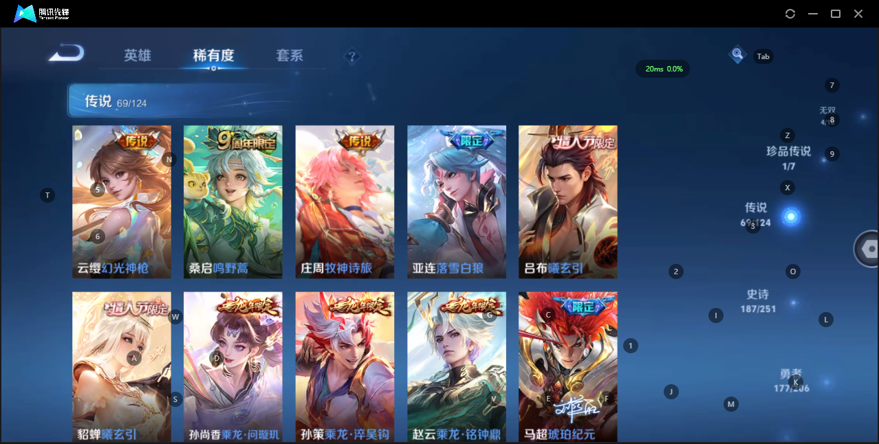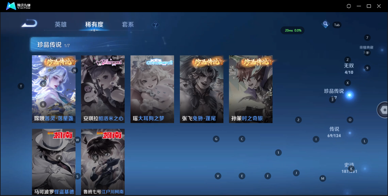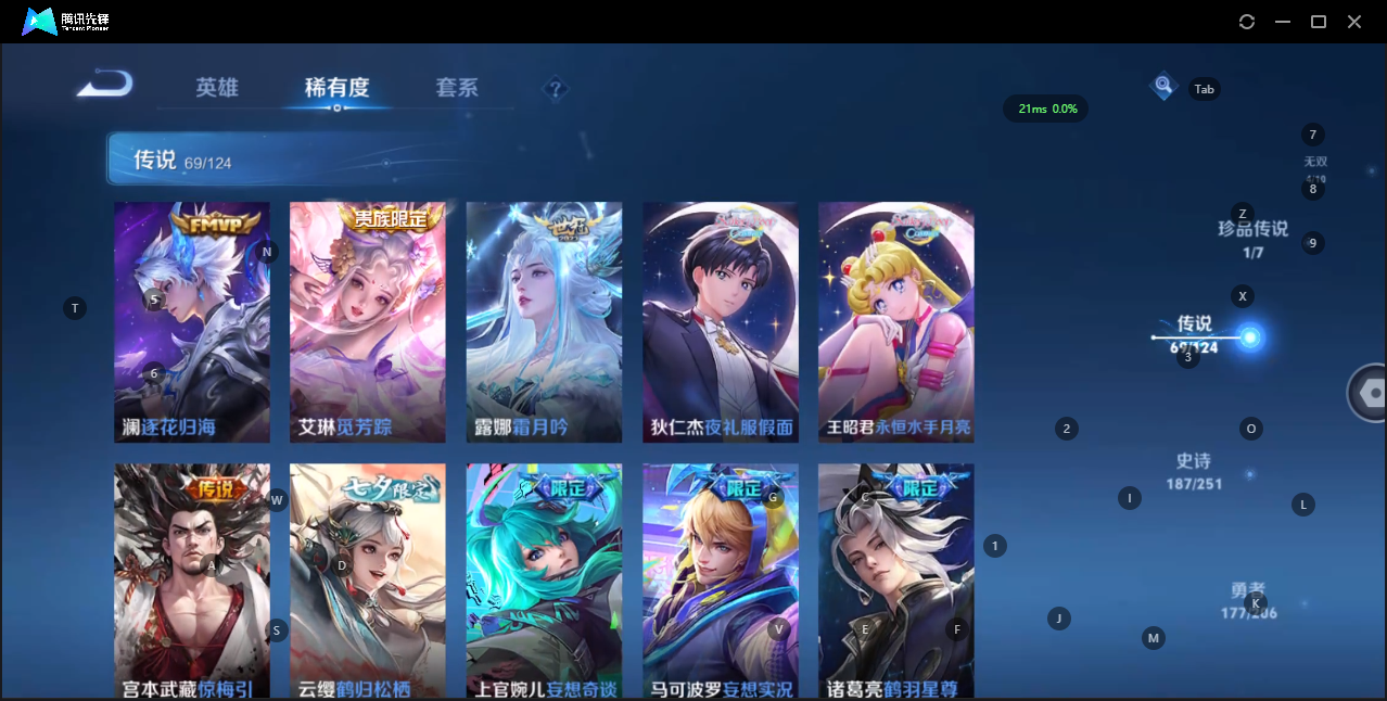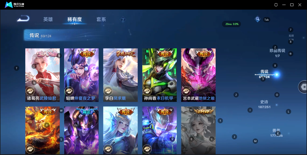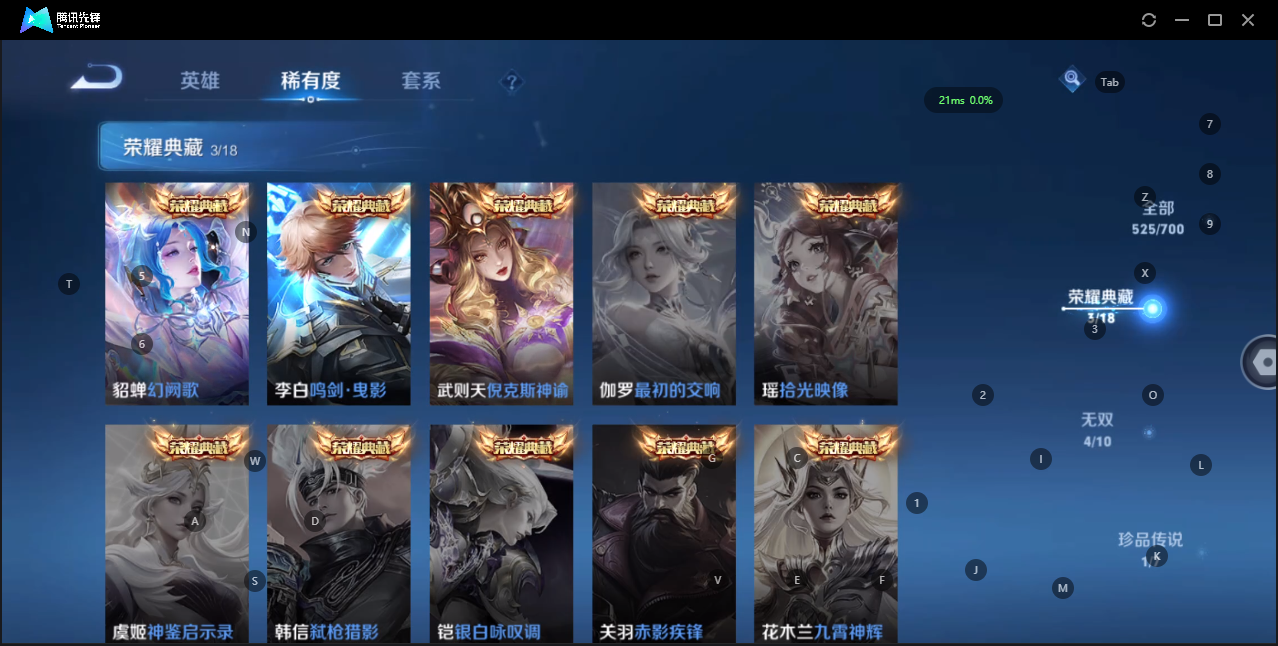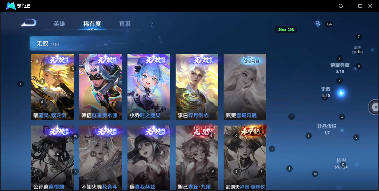 v10 3典藏 4无双 1珍品传说 69传说 125英雄 525皮肤 典藏英雄武则天 可修改实名 荣耀水晶:鸣剑·曳影幻阙歌貂蝉典藏倪克斯神谕宇宙婆娘 无双皮:器灵·螭龙剑韩信群星魔术团韩信无双小乔时之魔女小乔无双碎月剑心李白无双 珍品传说:器灵·落星盏 传说皮:牧神诗