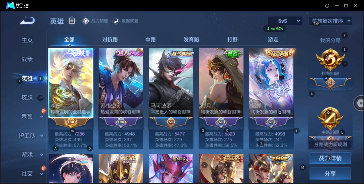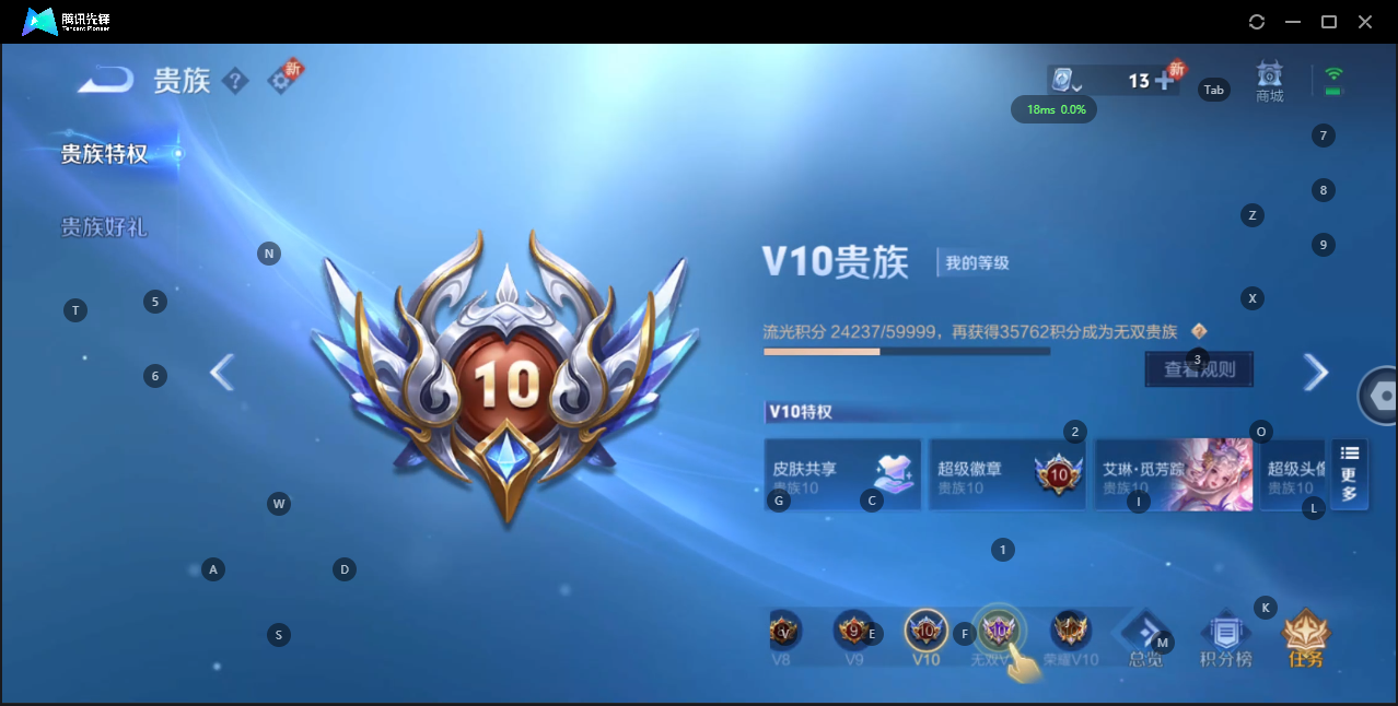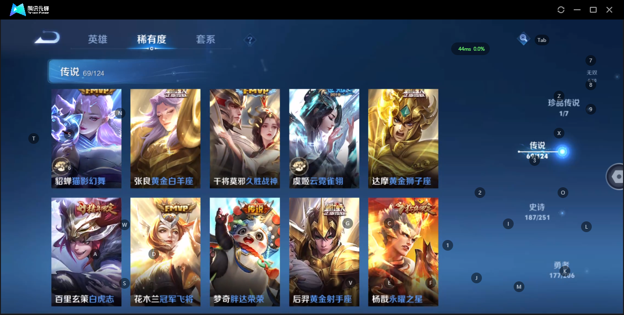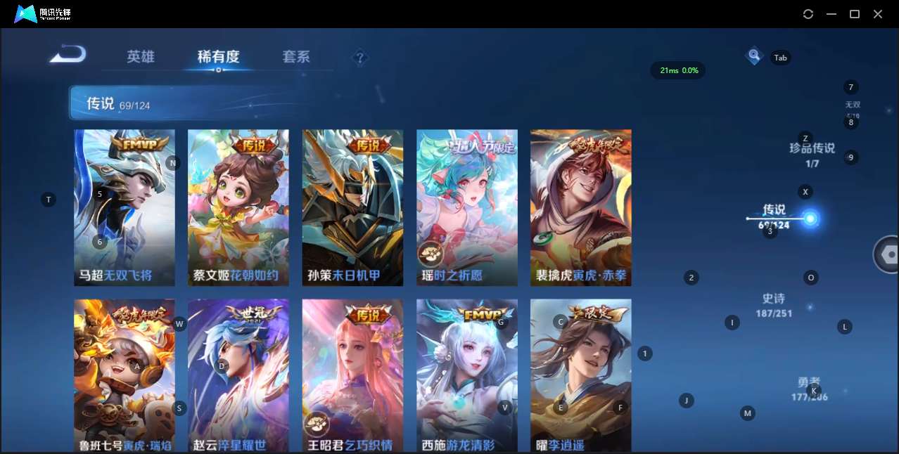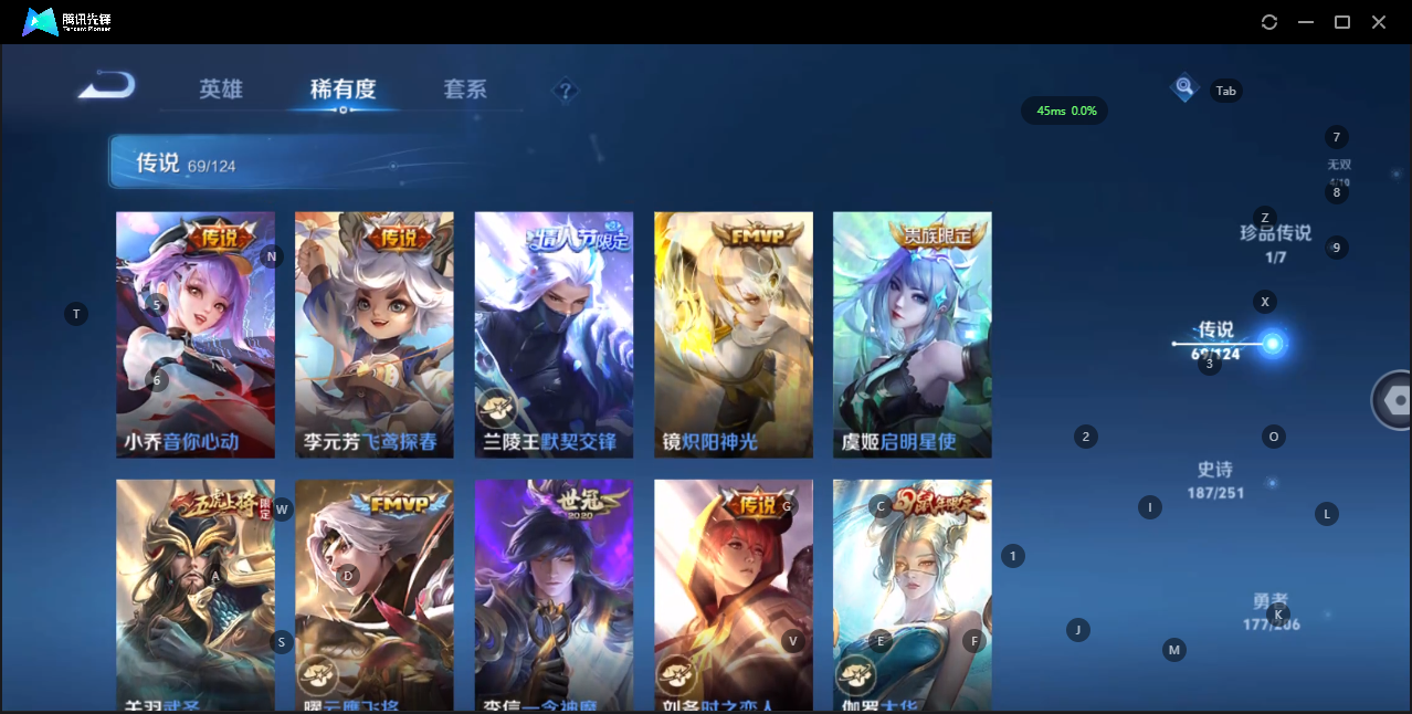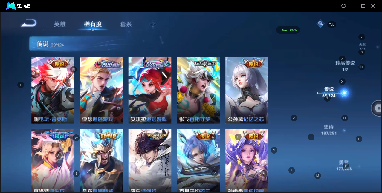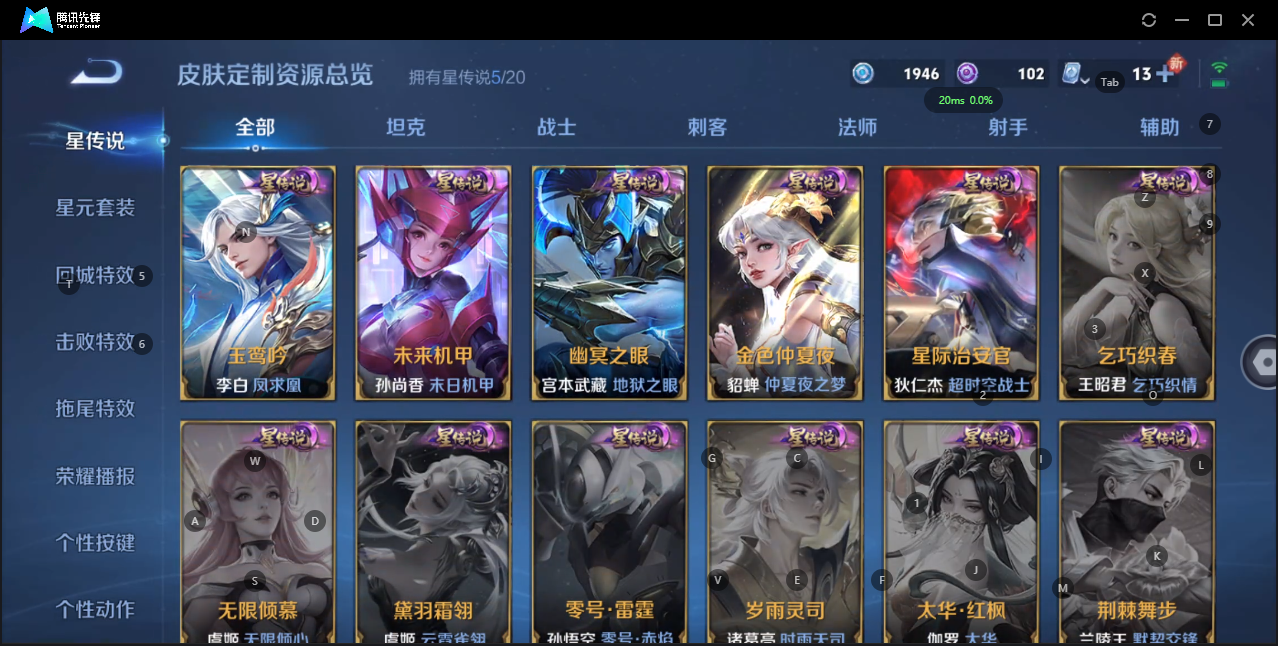 v10 3典藏 4无双 1珍品传说 69传说 125英雄 525皮肤 典藏英雄武则天 可修改实名 荣耀水晶:鸣剑·曳影幻阙歌貂蝉典藏倪克斯神谕宇宙婆娘 无双皮:器灵·螭龙剑韩信群星魔术团韩信无双小乔时之魔女小乔无双碎月剑心李白无双 珍品传说:器灵·落星盏 传说皮:牧神诗