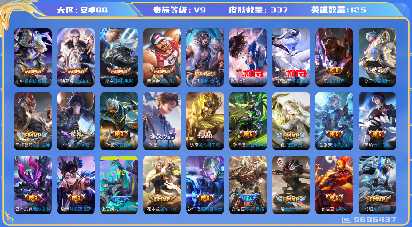 [9696437]v9 4典藏 3珍品传说 32传说 125英雄 337皮肤 典藏英雄武则天 可修改实名 荣耀水晶:鸣剑·曳影银白咏叹调倪克斯侍卫星域神启倪克斯贼亮活力突击 珍品传说:江户川柯南怪盗基德兔狲·蓬尾 传说皮:幻光神呛黄金狮子座零号·赤焰地狱火仲夏夜之梦大飞蛾海洋之心地狱之眼末日机甲-孙尚香绿蚂蚱云霓雀翎一念神魔淬星耀世冠军飞将久胜战神云鹰飞将小将军炽阳神光无双飞将音你心动-周瑜飞鸢探春绛天战甲鸡嘴战神超时空战士-狄仁杰末日机甲-孙策挚爱之约碎云妄想奇谈 珍宝阁皮:妄想食味 限定皮:逐霄战戟鸣野蒿至尊宝凤求凰白切鸡武陵仙君小桃花傲雪梅呛补天神威电光马子影龙天霄遇见飞天高山流水匿光决锋者五谷丰年游园惊梦逐梦之翼逐梦之影朱雀志守约年限如梦令-后羿孙行者猪悟能匿光追影者时之祈愿-云中君百木心呛玉兔公主启示之音深海之息深海大菠萝时之奇旅-妲己 史诗皮:布丁狗之誓百相守梦-百里守约星界战将茶境仙化蝶舞鸭鸭历险记-刘禅破空之剑龙之律动怒海争锋雪豹·霜爪紫霞仙子苍穹之光白龙吟黄金分割率特工魅影千年之狐永昼暗夜猫娘龙骑士小龙虾真我赫兹百里守约魅语晚萤偶像歌手青蛇高渐离燃音魔法江河有灵末日机甲-吕布猫狗日记-孙策猫狗日记-大乔节奏热浪修罗女仆咖啡摇滚巨星水果甜心绅士熊喵天才门将星夜王子心灵骇客时之奇旅-安琪拉功夫厨神德古拉伯爵暗隐猎兽者幽灵船长鬼剑武藏暗渊魔法心灵战警乐园奇幻夜天秀·启明舞动绿茵地狱岩魂拒霜思缤纷独角兽乘风破浪逐浪之夏水晶猎龙者曙光守护者唤灵魅影箭羽风息金属风暴原初追逐者圣诞狂欢鹰眼统帅王者之锤暗夜贵公子魅力维加斯黎明之约赏金猎手奇遇舞章无心未来纪元-赵云