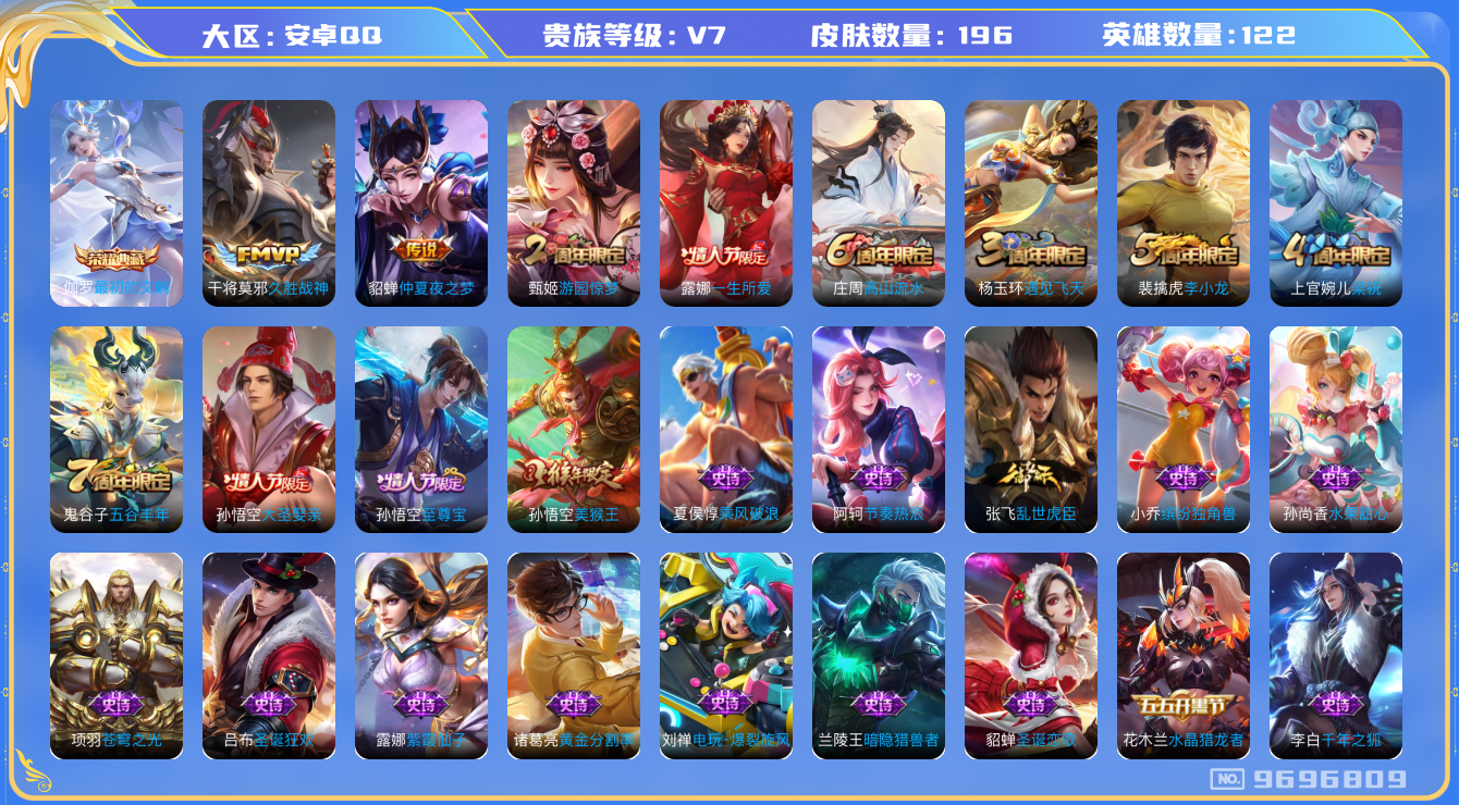 [9696809]v7 1典藏 2传说 122英雄 196皮肤 可修改实名 荣耀水晶:最初的交响伽罗典藏 传说皮:仲夏夜之梦大飞蛾久胜战神 珍宝阁皮:蔷薇恋人玩趣恶龙 限定皮:至尊宝遇见飞天高山流水五谷丰年游园惊梦梁祝李小龙一生所爱大圣娶亲美猴王 史诗皮:紫霞仙子苍穹之光白龙吟黄金分割率特工魅影千年之狐电玩·爆裂旋风龙骑士小龙虾蒙恬荣光圣徽乱世虎臣节奏热浪女仆咖啡水果甜心星夜王子心灵骇客暗隐猎兽者舞动绿茵缤纷独角兽乘风破浪水晶猎龙者原初追逐者圣诞狂欢圣诞恋歌鹰眼统帅魅力维加斯黎明之约