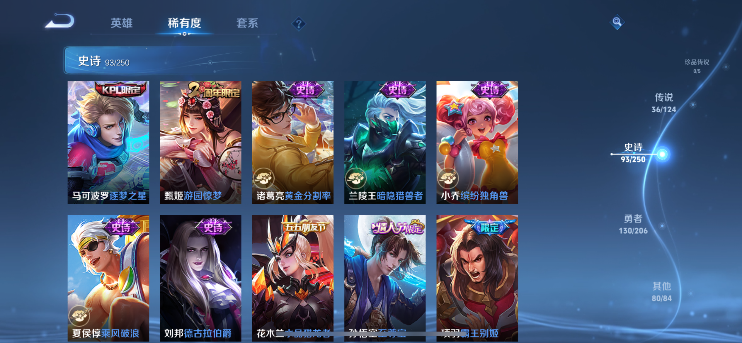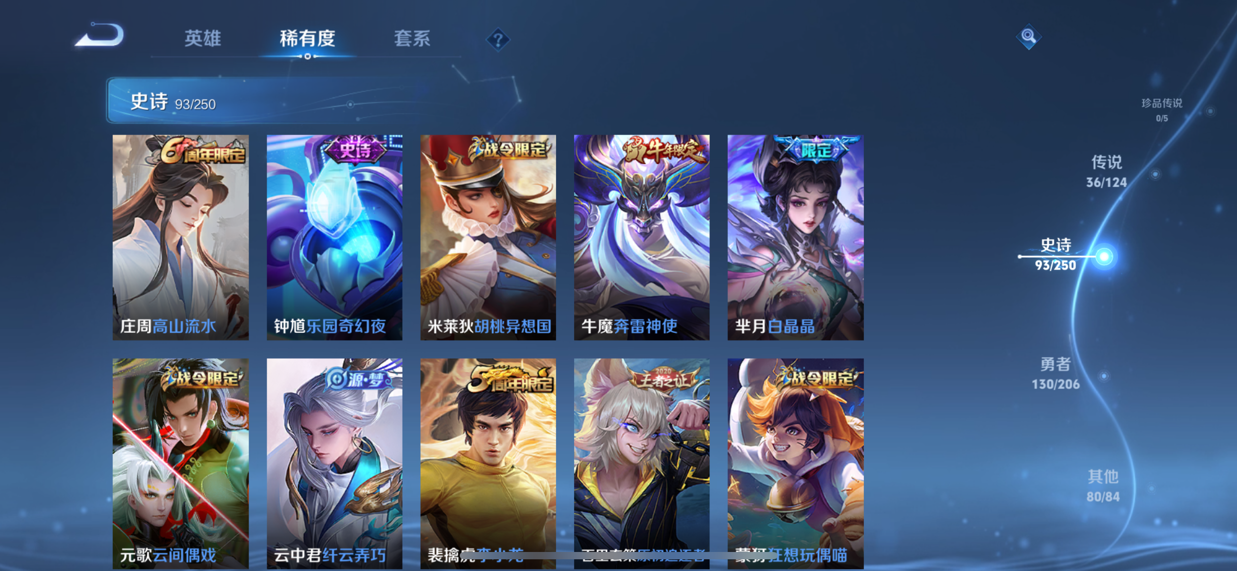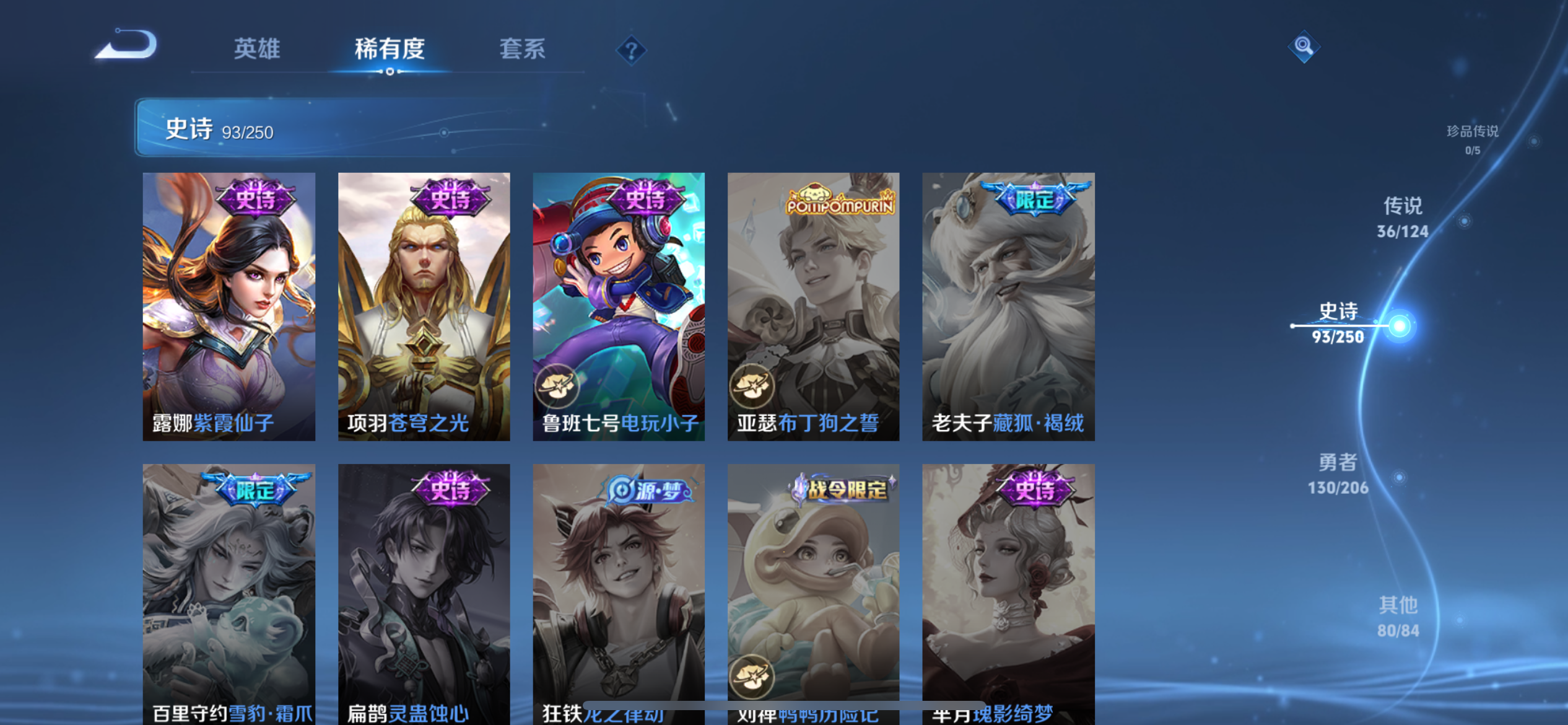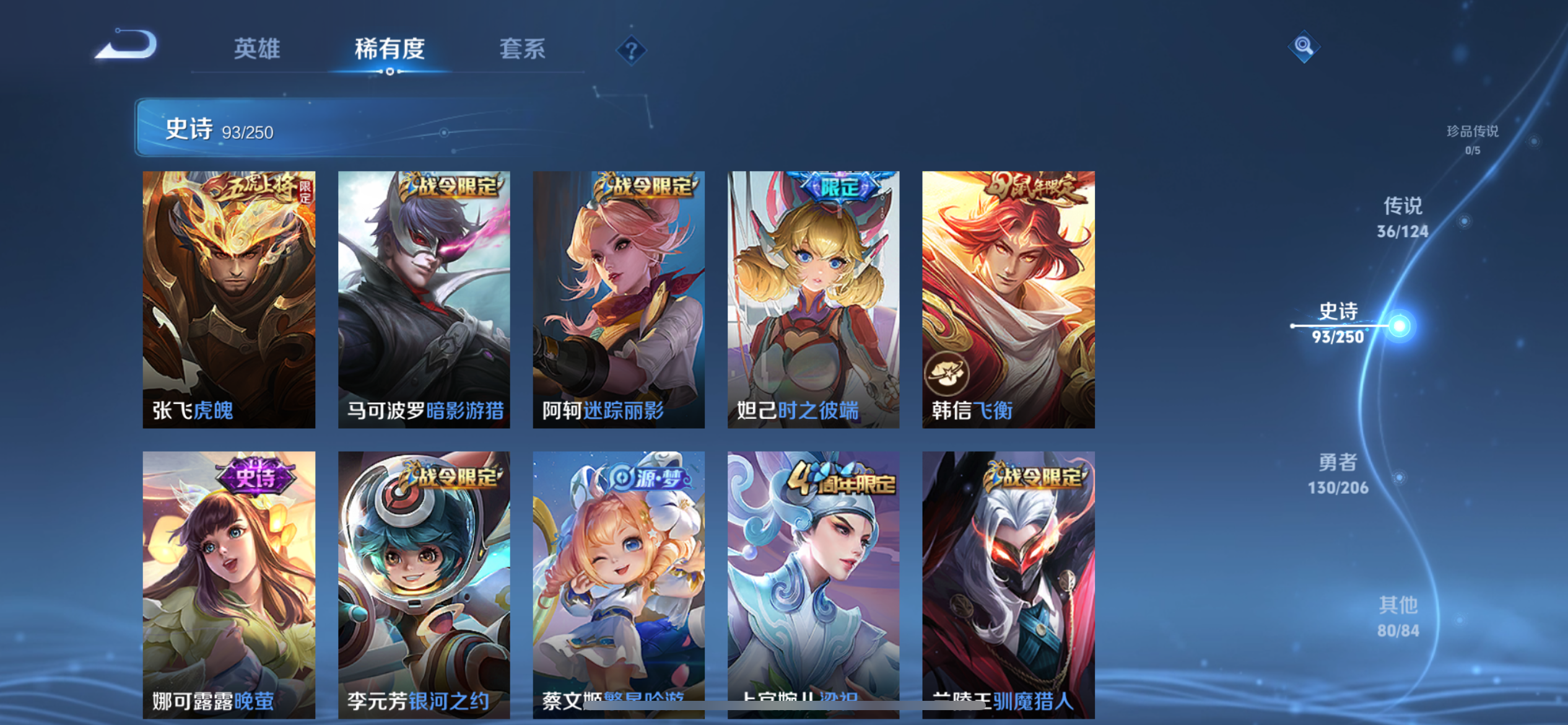九霄小将军狗年限定全白晶晶紫霞至尊宝马可年限-可二次-123英雄-340皮肤-1典藏-36传说-93史诗 炽阳神光-镜 绯月行-不知火舞 天魔缭乱-吕布 山海·炽霜斩-李信 齐天大圣-孙悟空 遇见神鼓-吕布 武圣-关羽 百相守梦-张飞 浮生妄-夏洛特 凤求凰-李白 时雨天司-诸葛亮 山