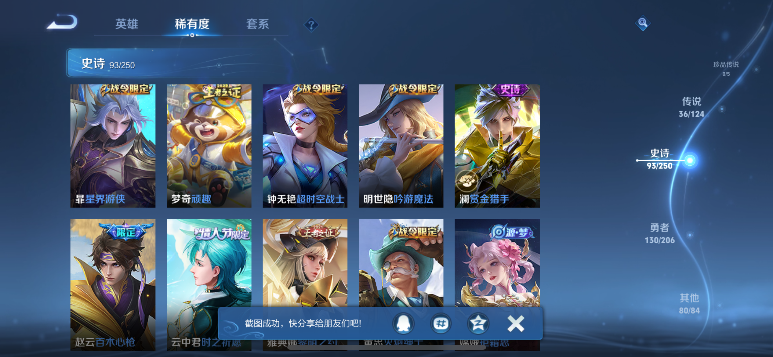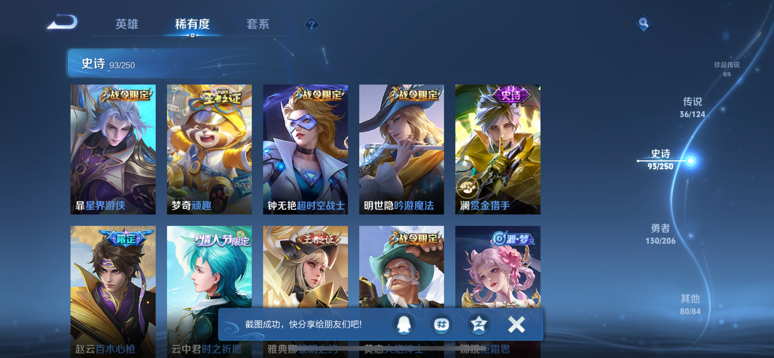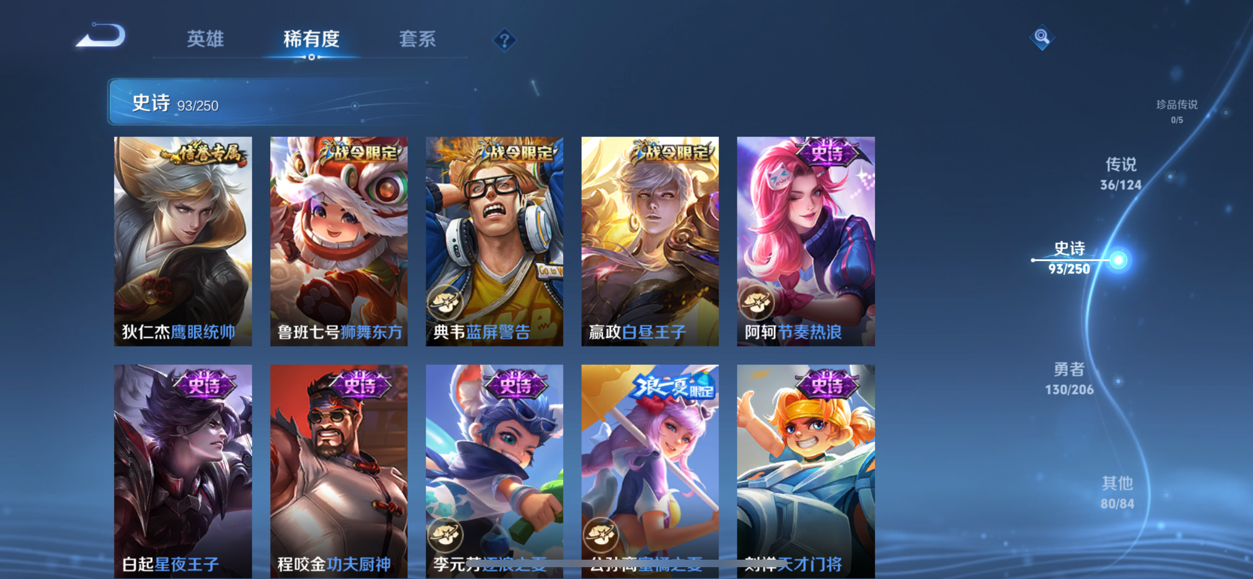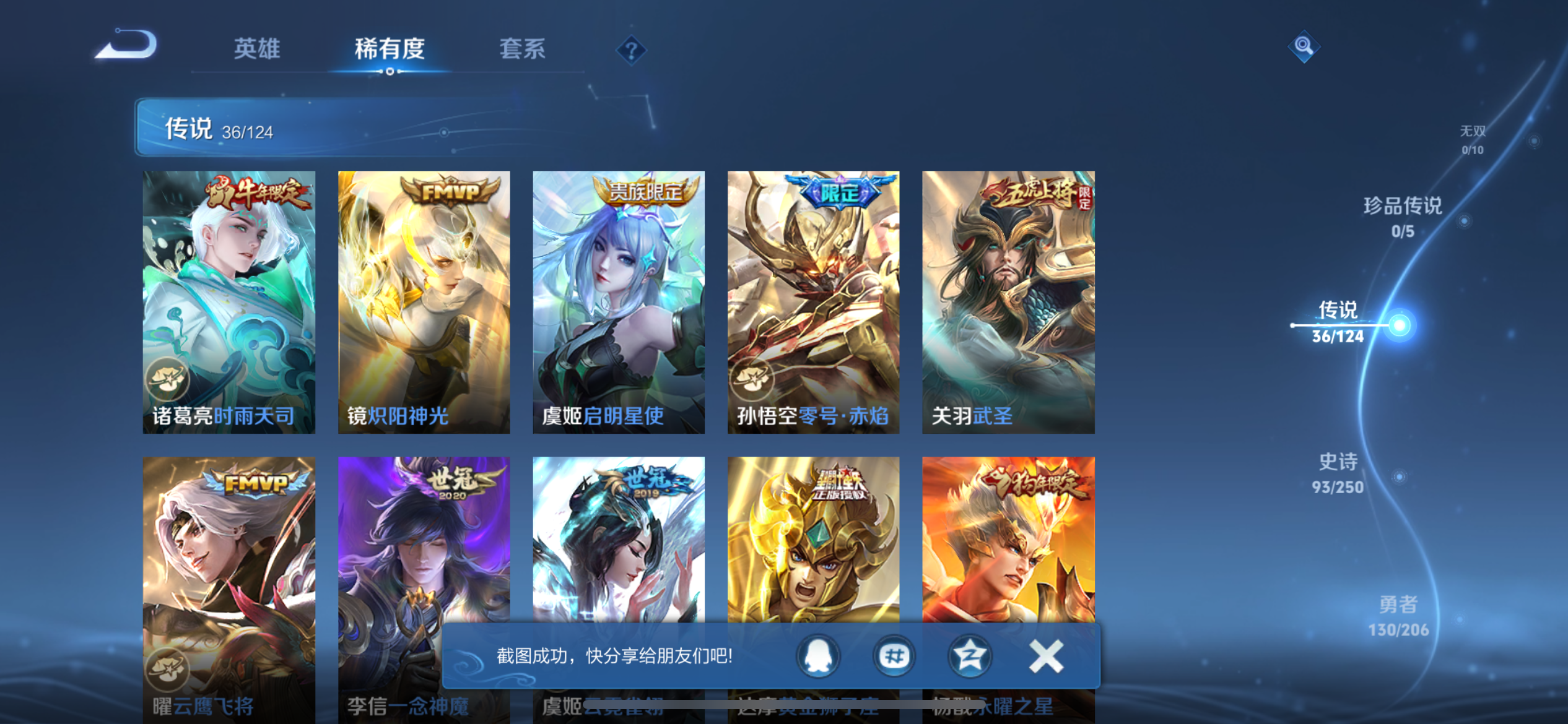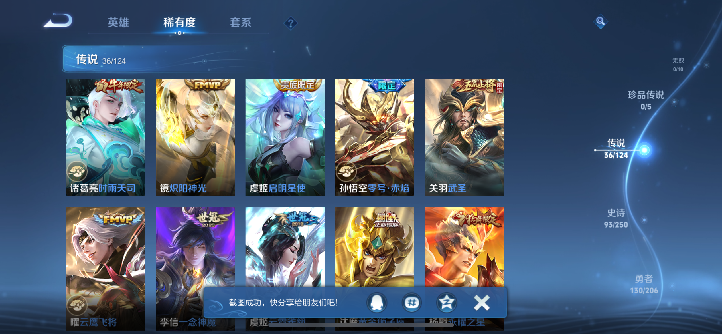 九霄小将军狗年限定全白晶晶紫霞至尊宝马可年限-可二次-123英雄-340皮肤-1典藏-36传说-93史诗 炽阳神光-镜 绯月行-不知火舞 天魔缭乱-吕布 山海·炽霜斩-李信 齐天大圣-孙悟空 遇见神鼓-吕布 武圣-关羽 百相守梦-张飞 浮生妄-夏洛特 凤求凰-李白 时雨天司-诸葛亮 山