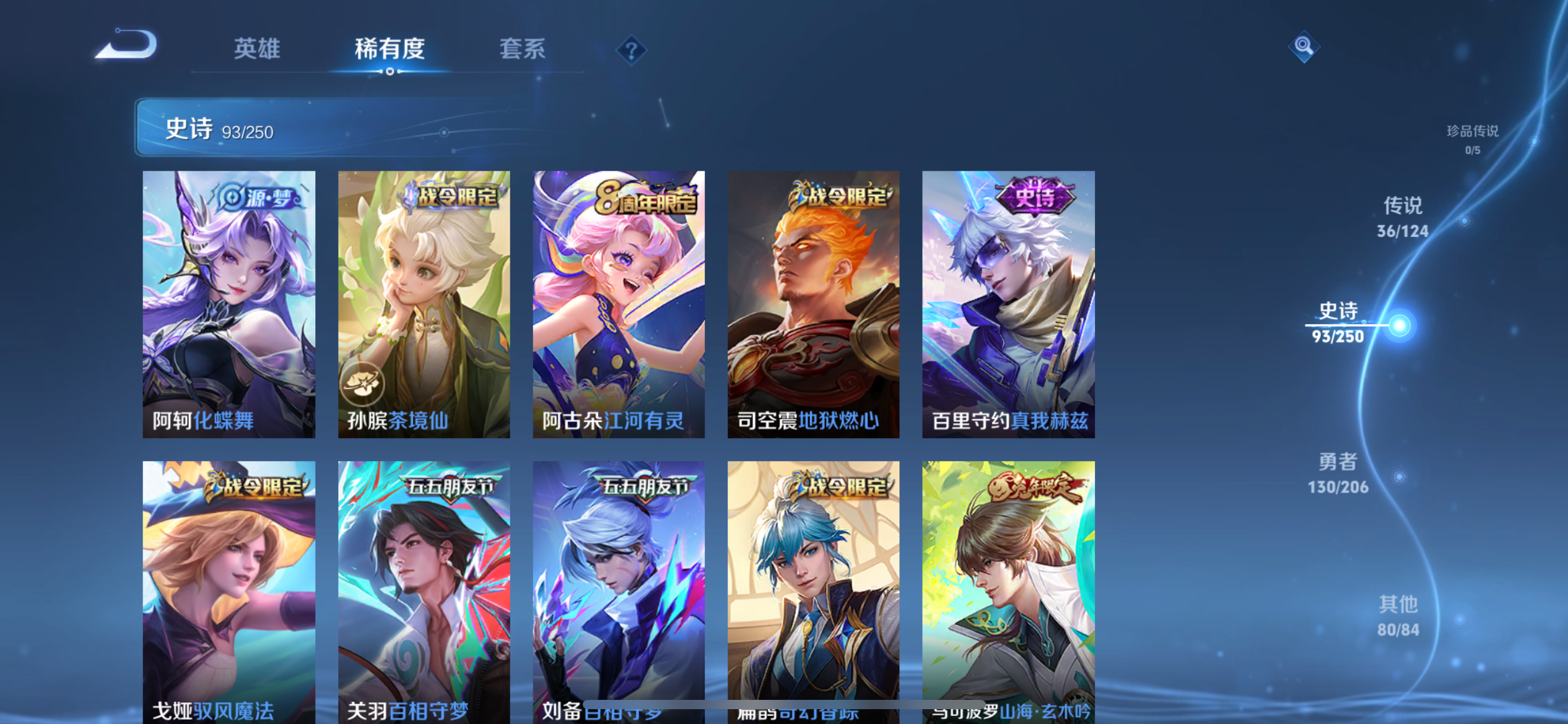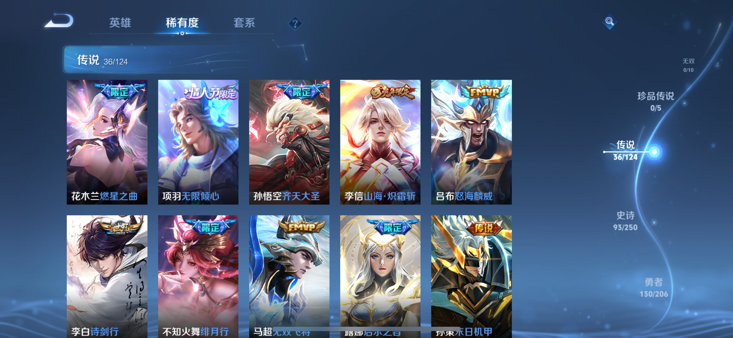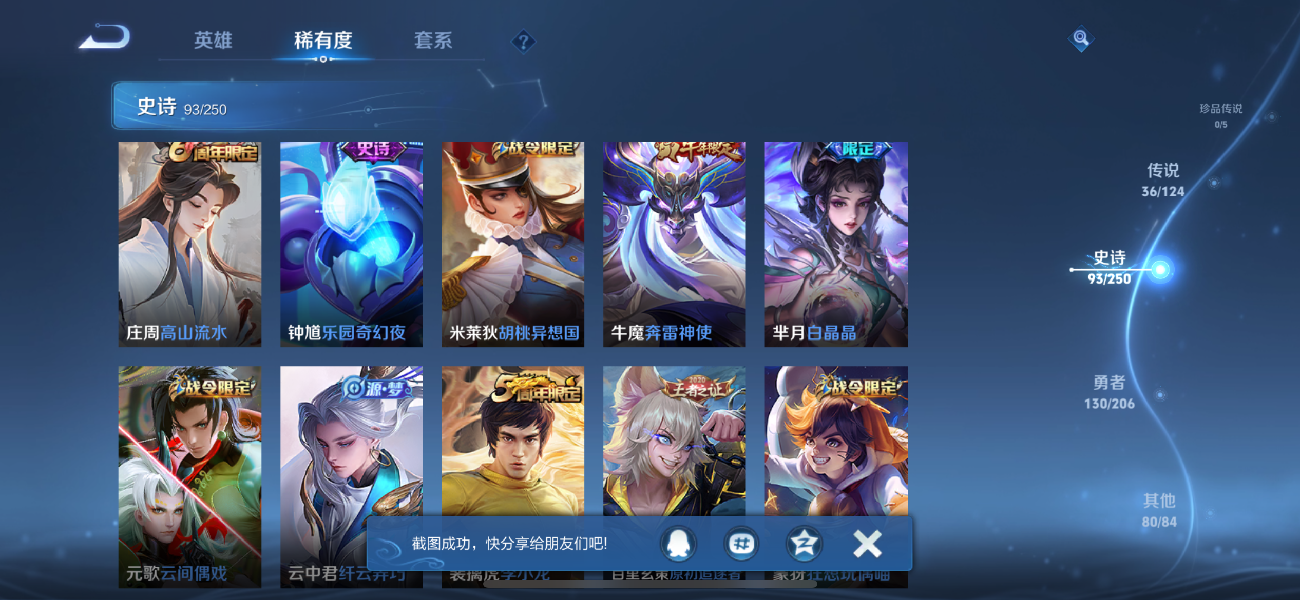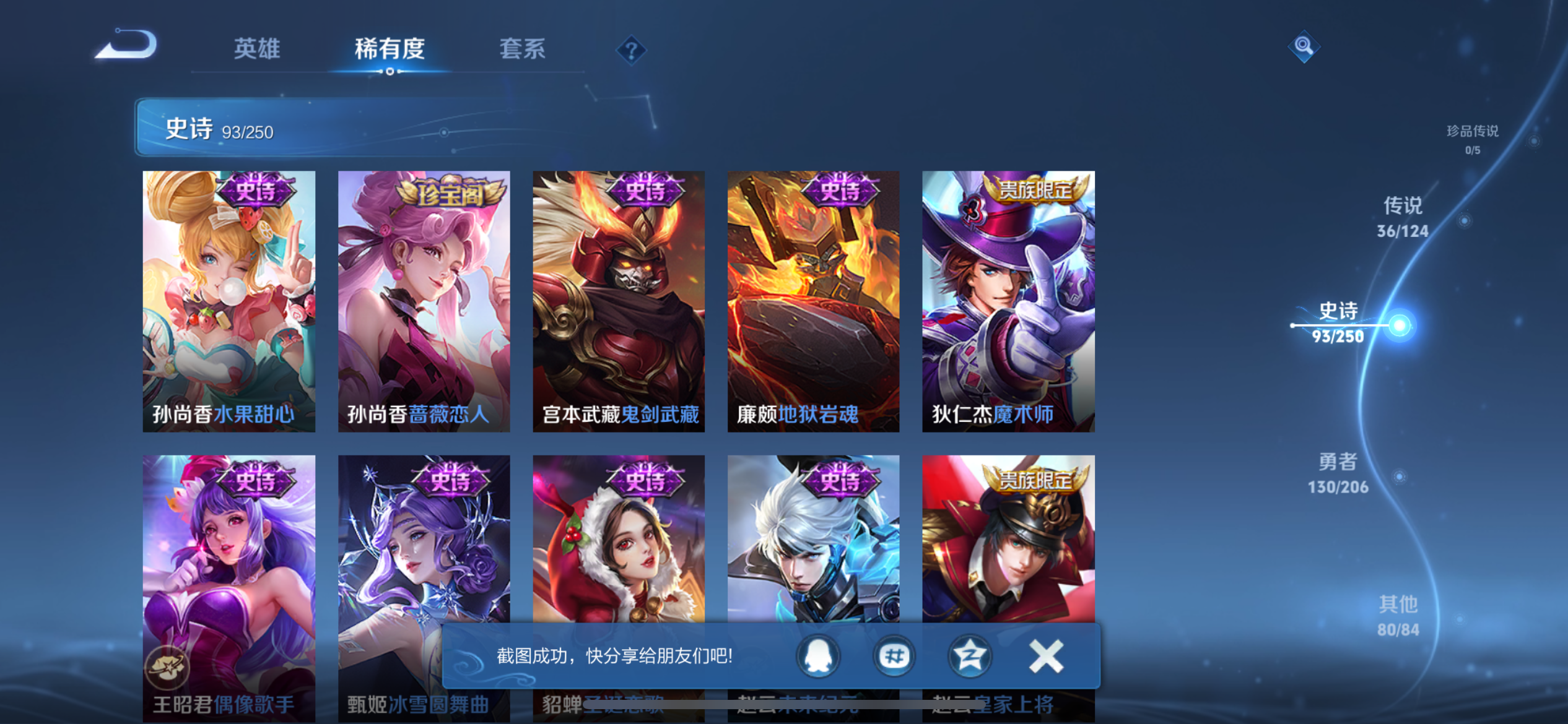 九霄小将军狗年限定全白晶晶紫霞至尊宝马可年限-可二次-123英雄-340皮肤-1典藏-36传说-93史诗 炽阳神光-镜 绯月行-不知火舞 天魔缭乱-吕布 山海·炽霜斩-李信 齐天大圣-孙悟空 遇见神鼓-吕布 武圣-关羽 百相守梦-张飞 浮生妄-夏洛特 凤求凰-李白 时雨天司-诸葛亮 山