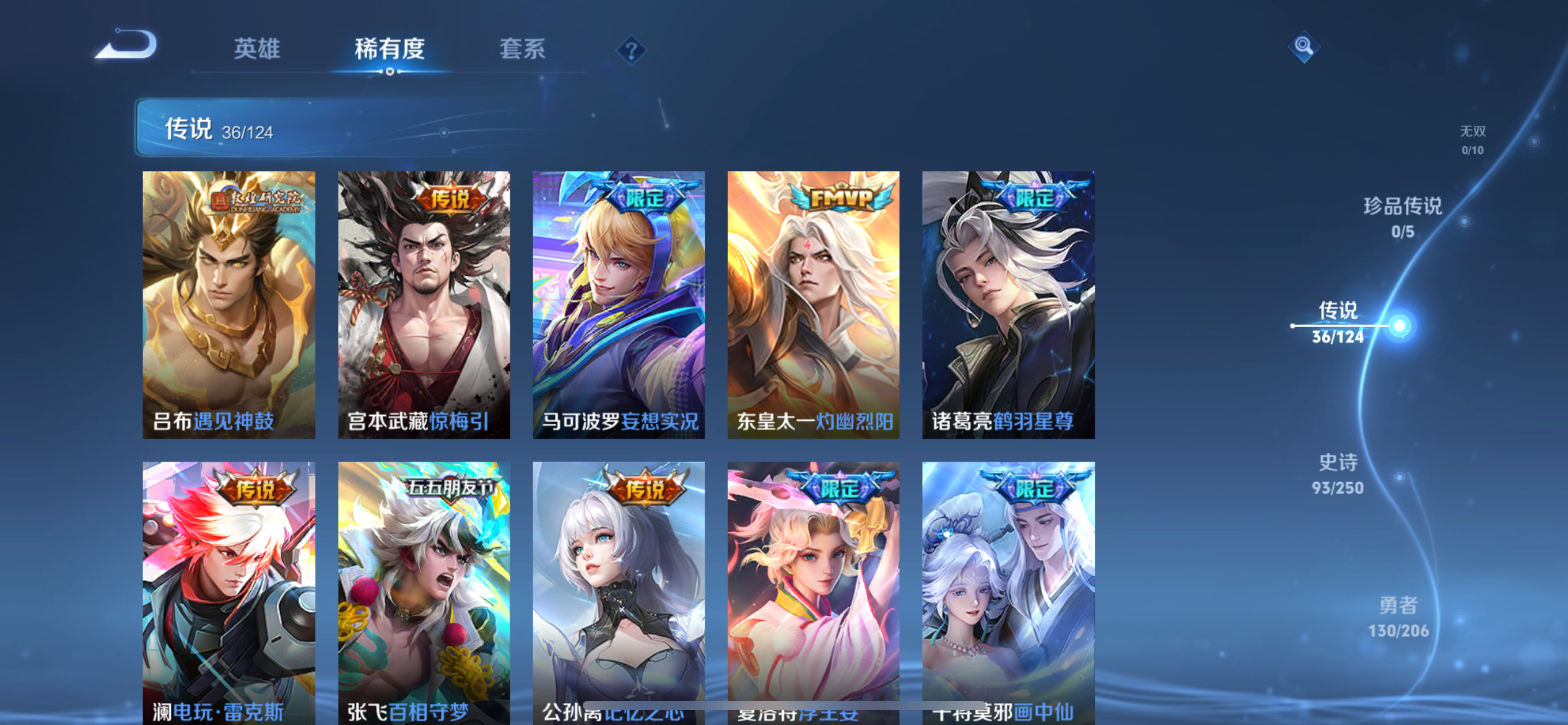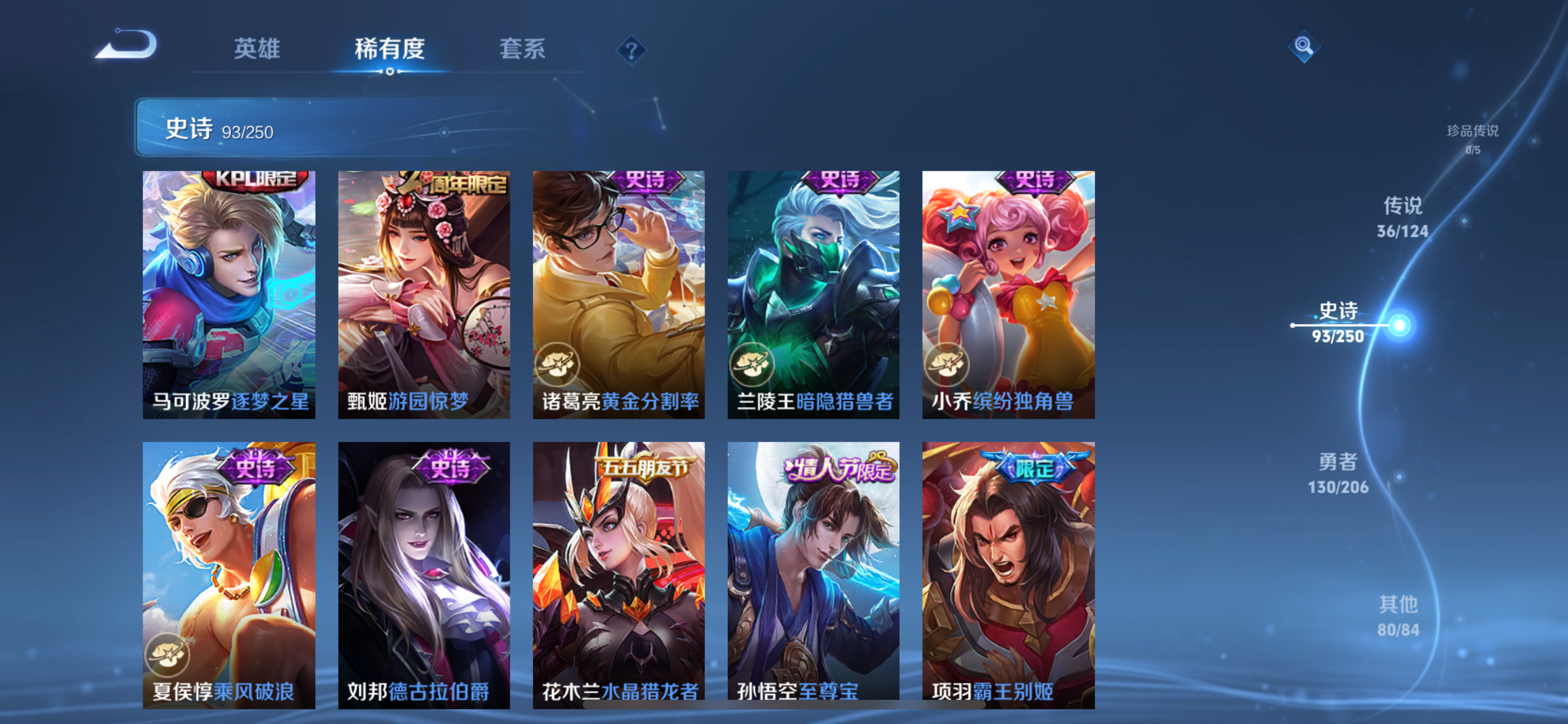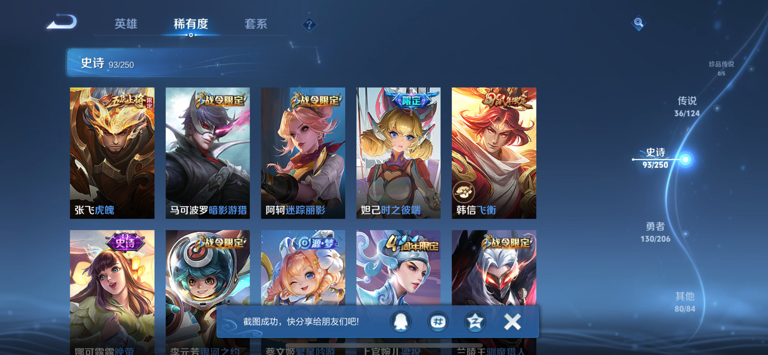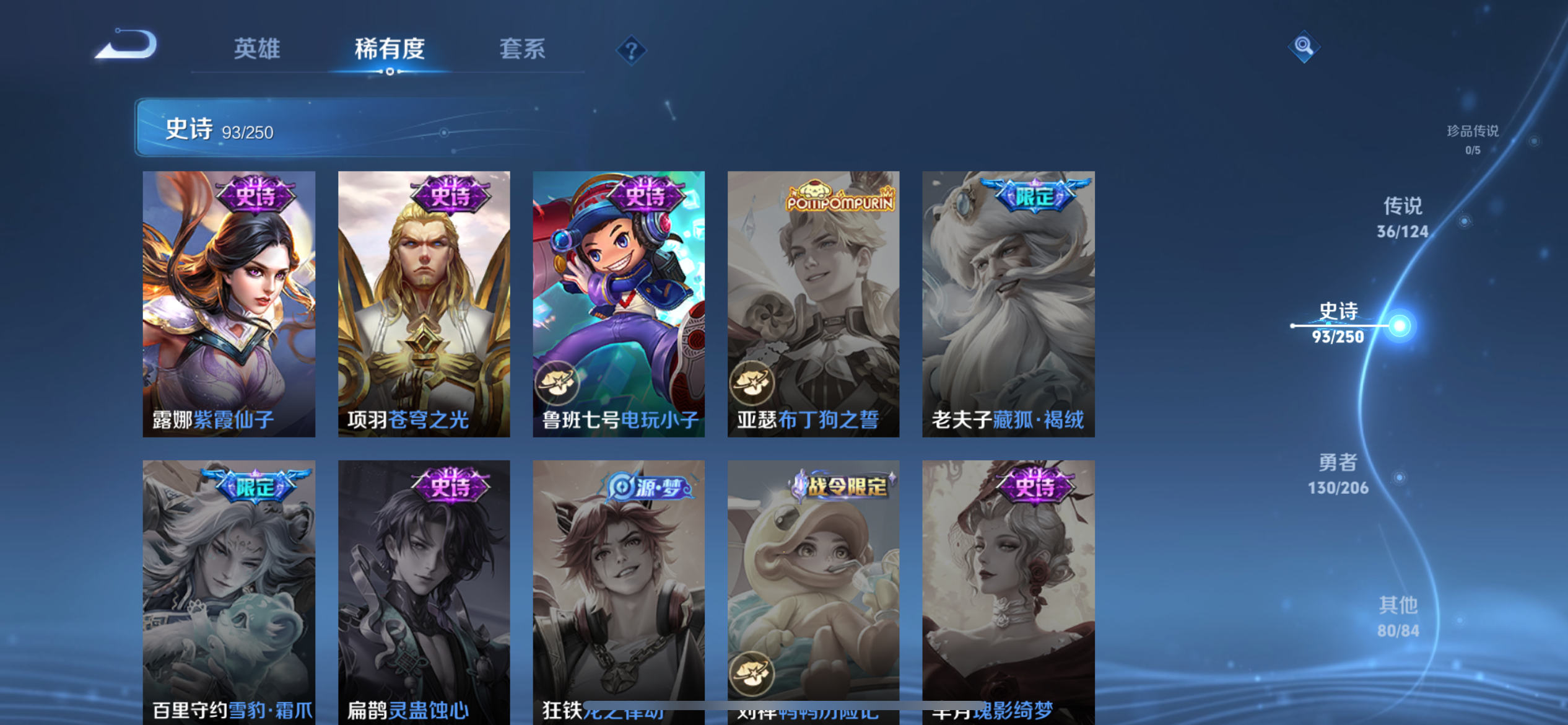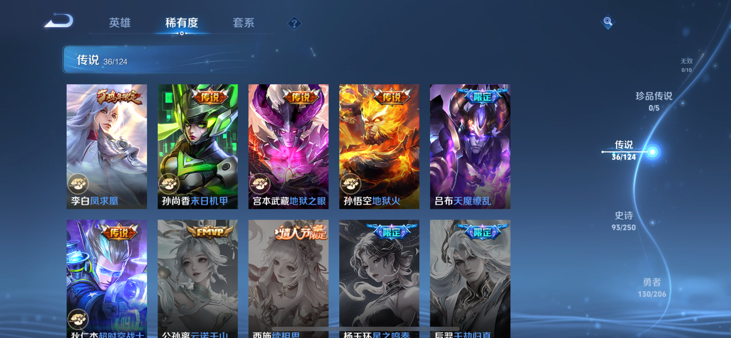 九霄小将军狗年限定全白晶晶紫霞至尊宝马可年限-可二次-123英雄-340皮肤-1典藏-36传说-93史诗 炽阳神光-镜 绯月行-不知火舞 天魔缭乱-吕布 山海·炽霜斩-李信 齐天大圣-孙悟空 遇见神鼓-吕布 武圣-关羽 百相守梦-张飞 浮生妄-夏洛特 凤求凰-李白 时雨天司-诸葛亮 山