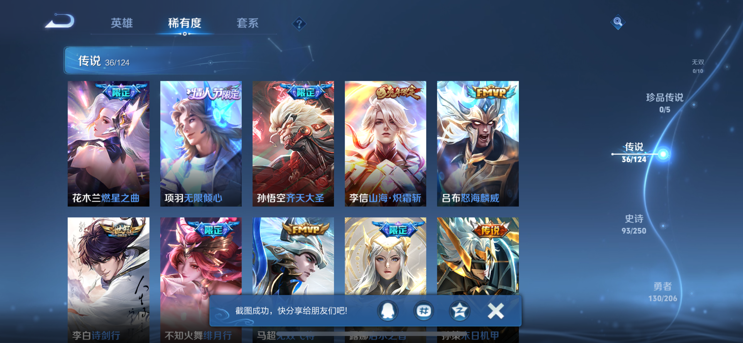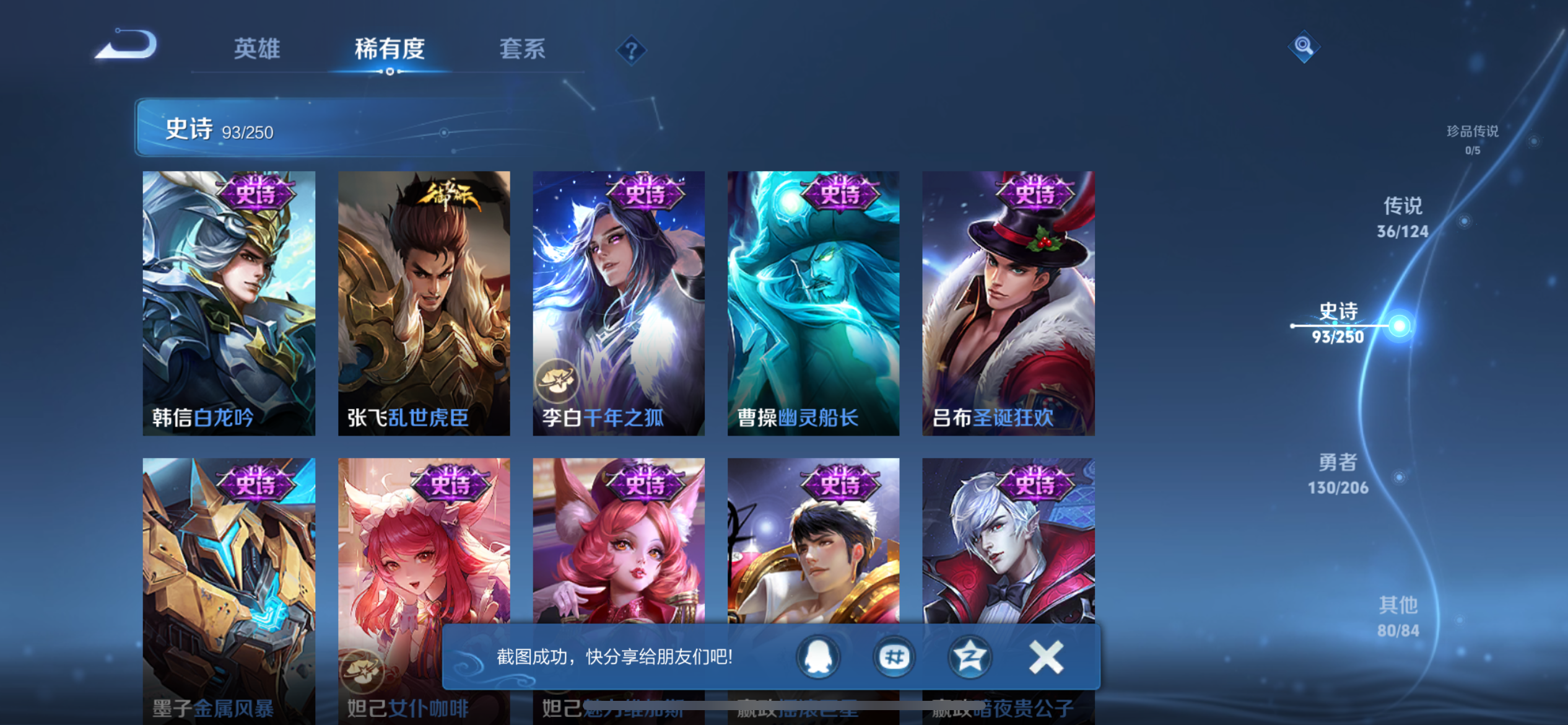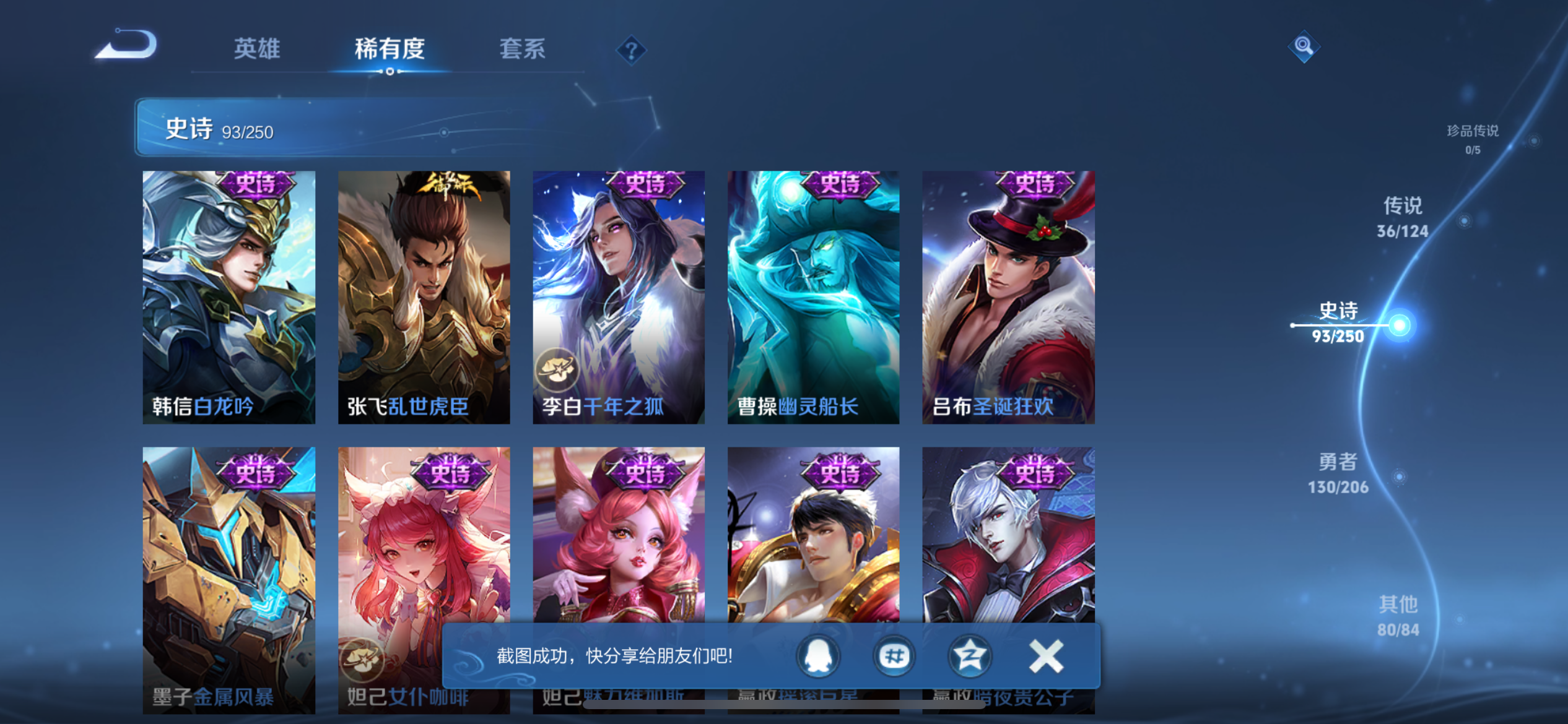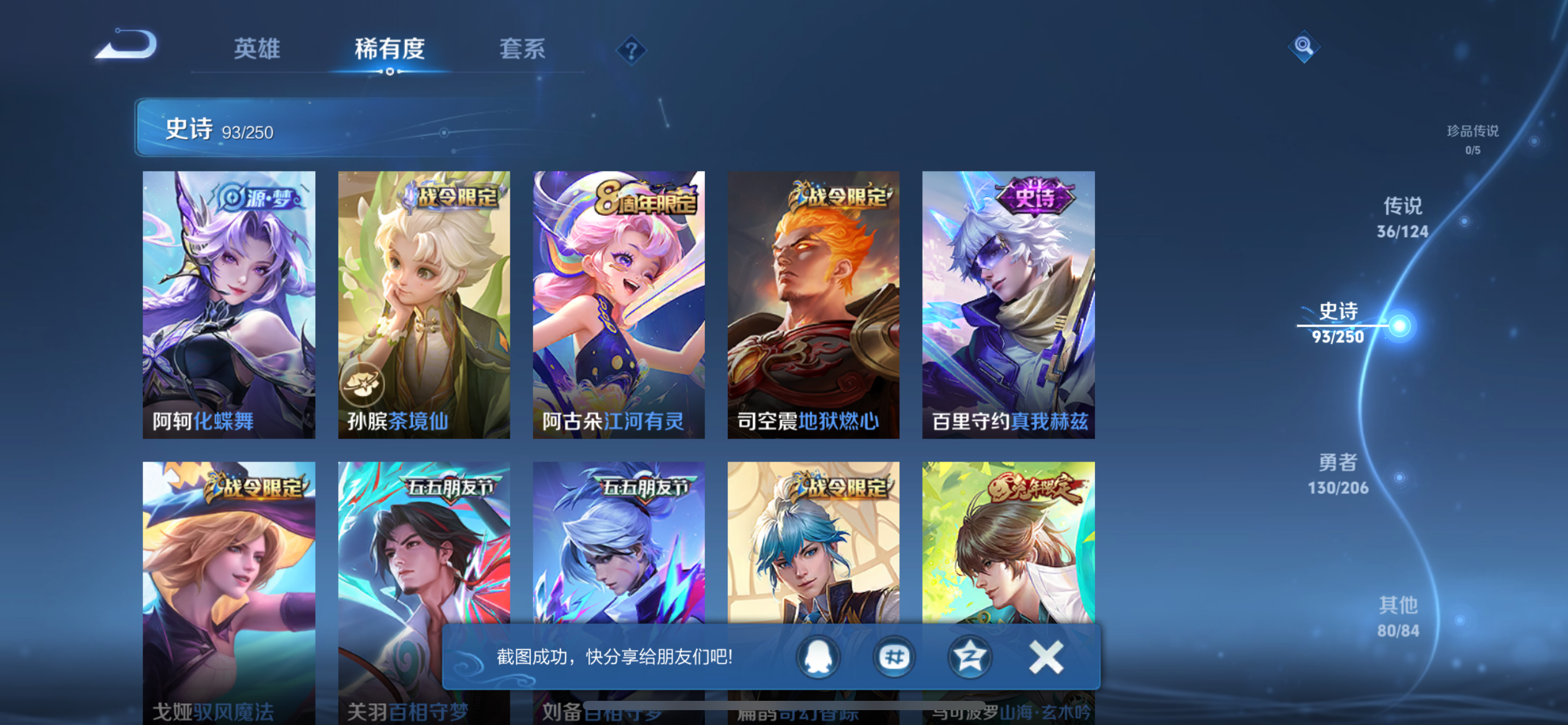 九霄小将军狗年限定全白晶晶紫霞至尊宝马可年限-可二次-123英雄-340皮肤-1典藏-36传说-93史诗 炽阳神光-镜 绯月行-不知火舞 天魔缭乱-吕布 山海·炽霜斩-李信 齐天大圣-孙悟空 遇见神鼓-吕布 武圣-关羽 百相守梦-张飞 浮生妄-夏洛特 凤求凰-李白 时雨天司-诸葛亮 山