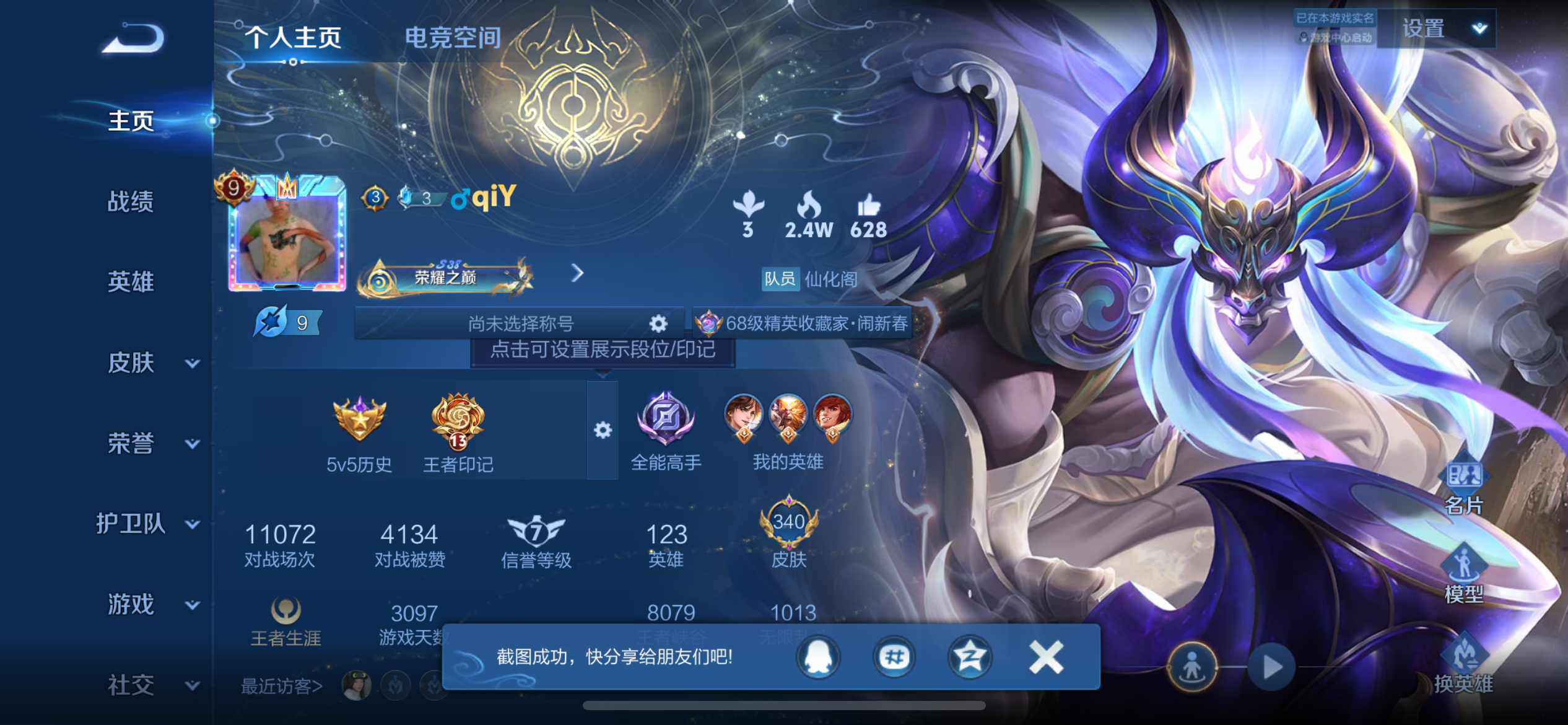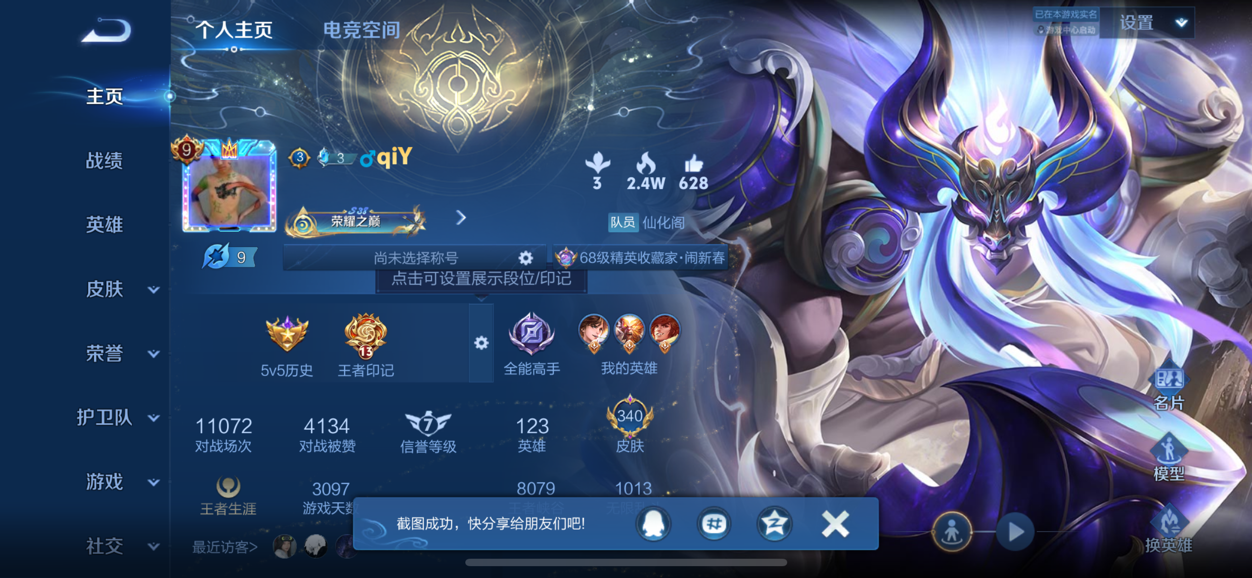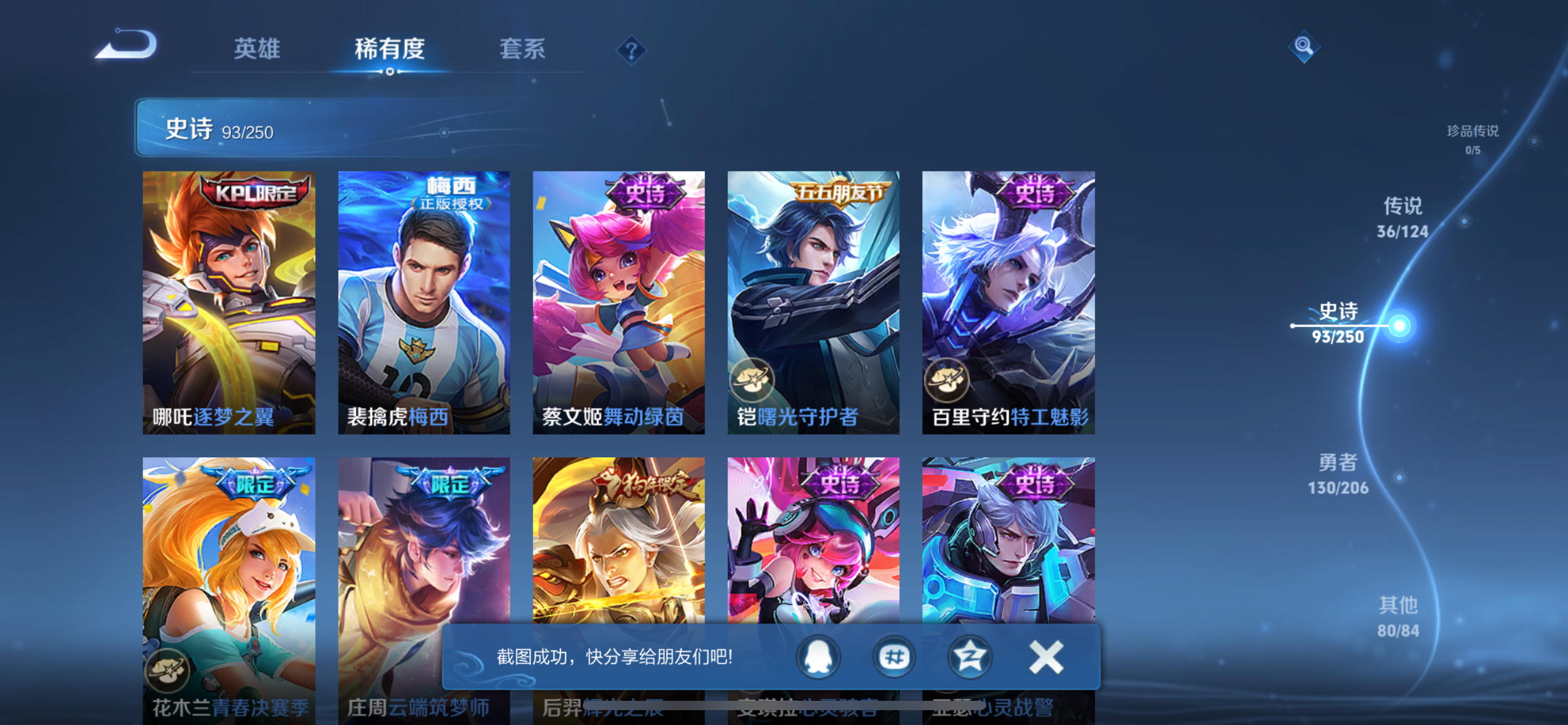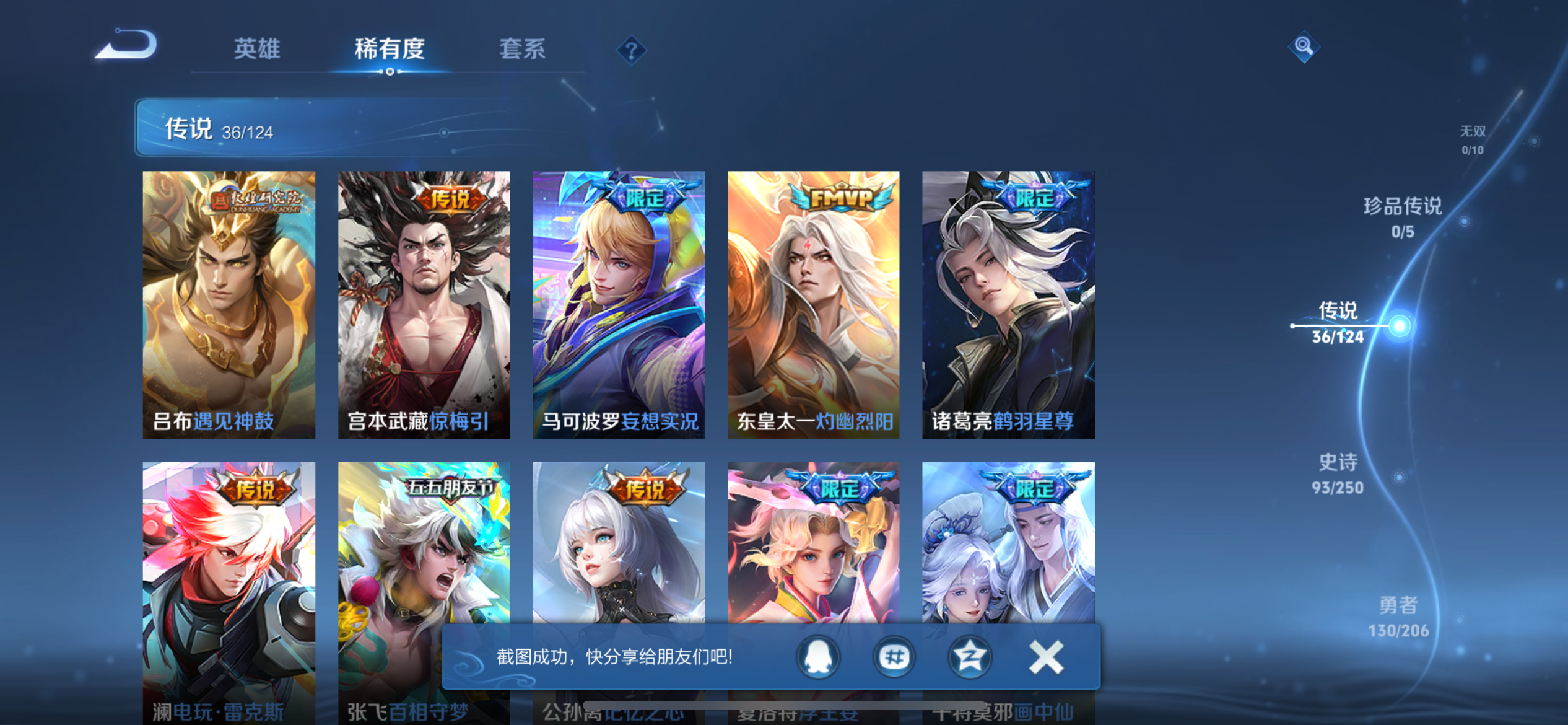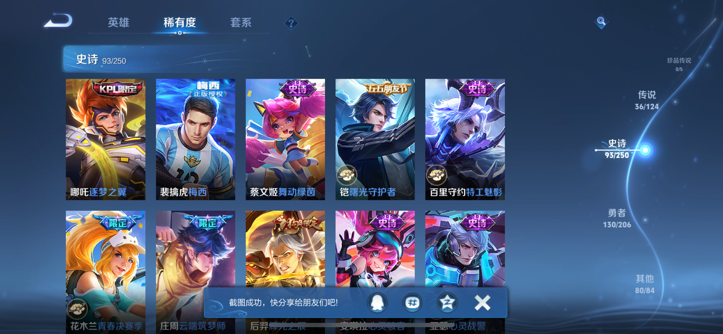 九霄小将军狗年限定全白晶晶紫霞至尊宝马可年限-可二次-123英雄-340皮肤-1典藏-36传说-93史诗 炽阳神光-镜 绯月行-不知火舞 天魔缭乱-吕布 山海·炽霜斩-李信 齐天大圣-孙悟空 遇见神鼓-吕布 武圣-关羽 百相守梦-张飞 浮生妄-夏洛特 凤求凰-李白 时雨天司-诸葛亮 山