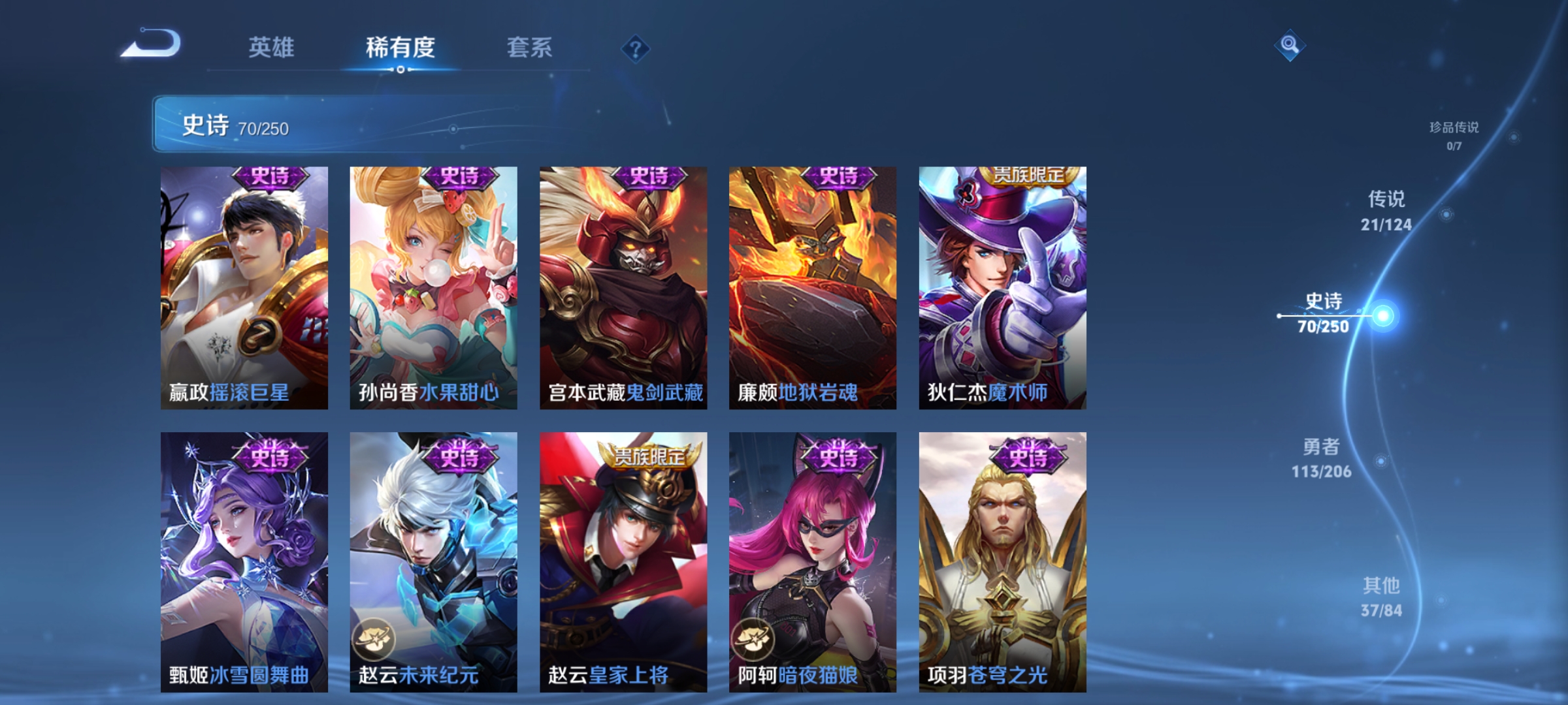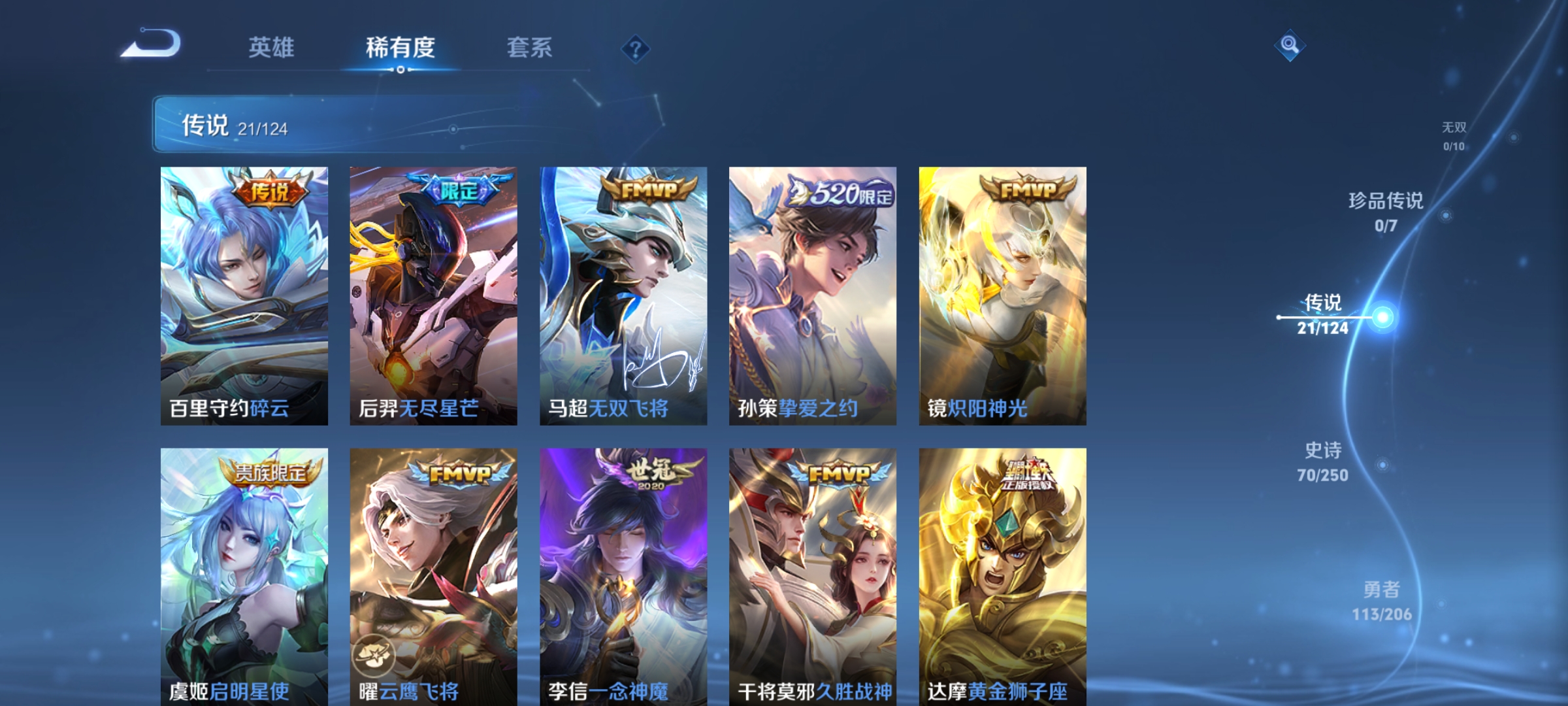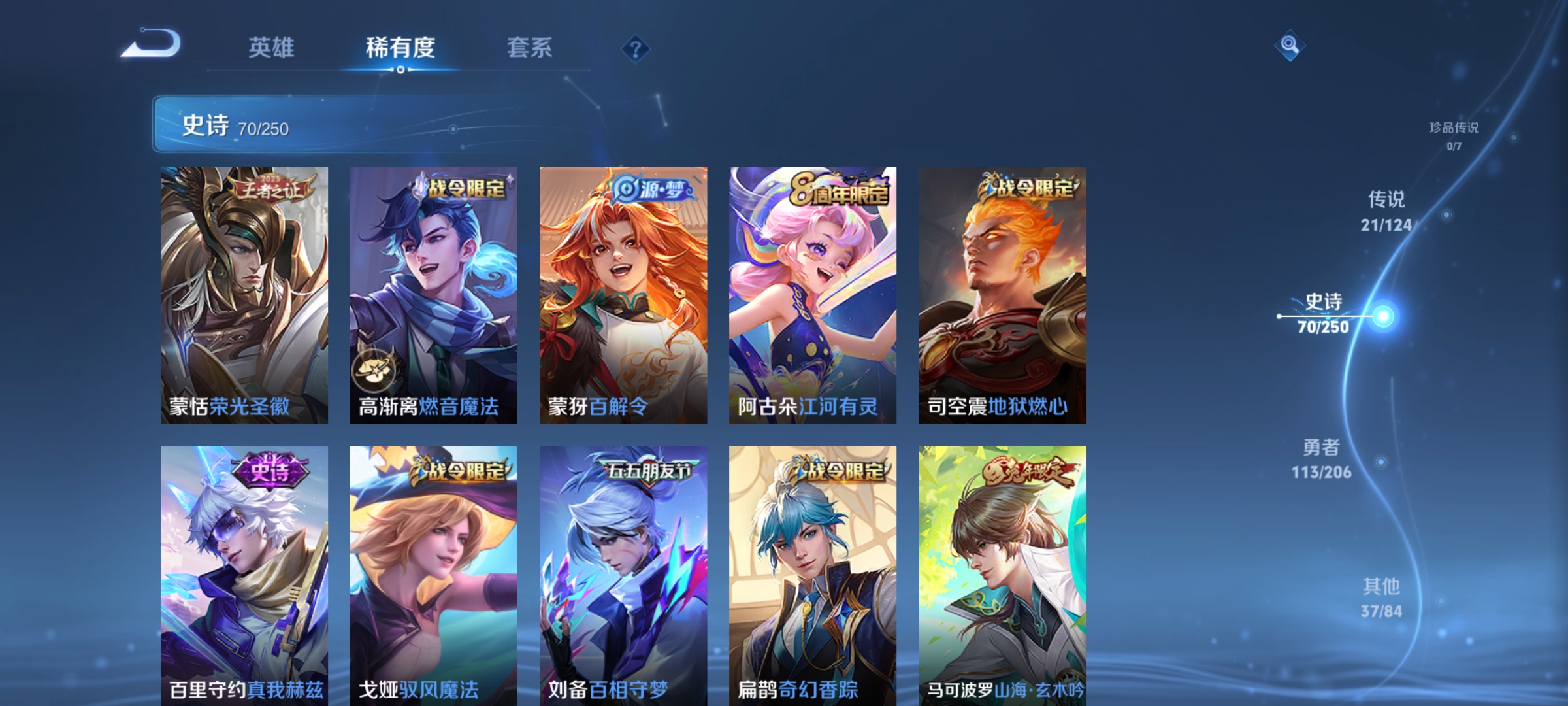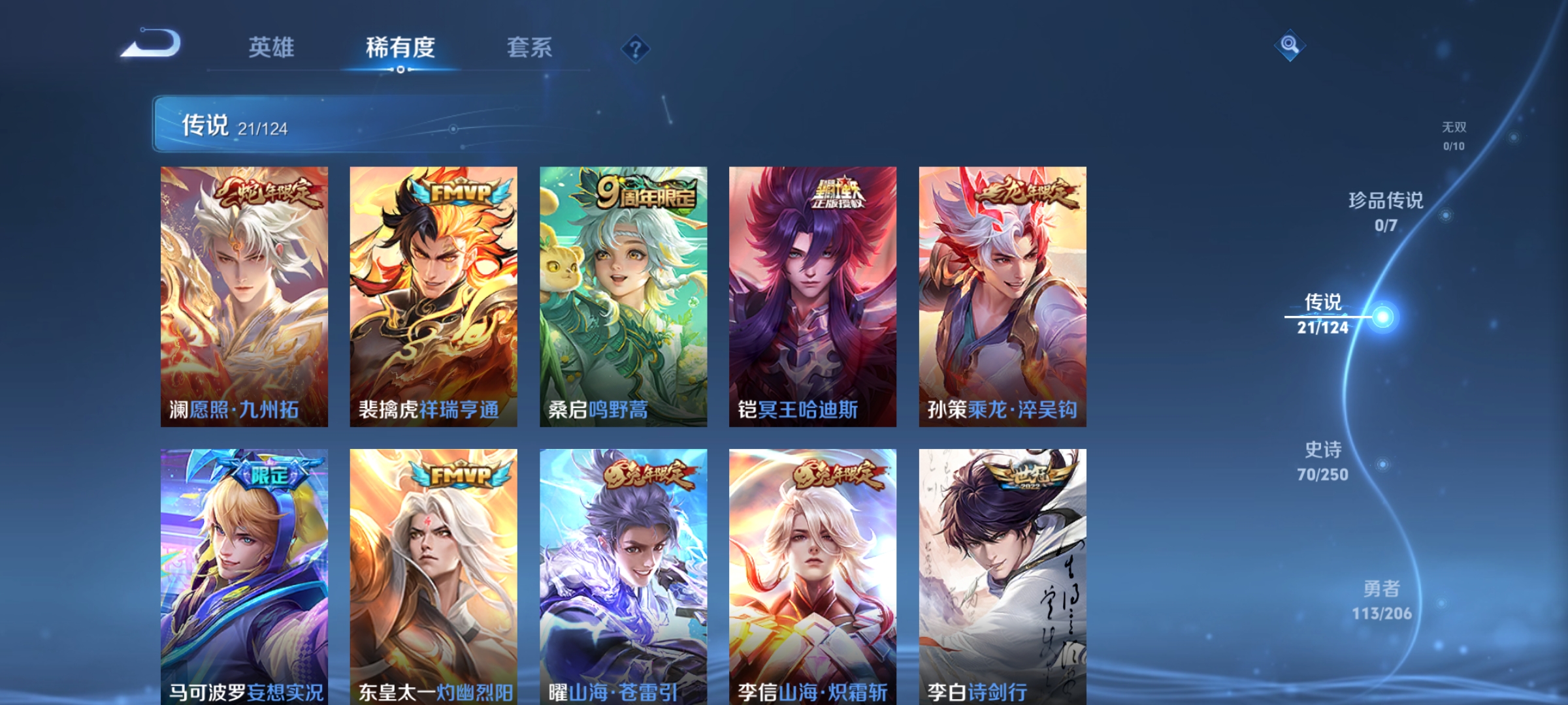铠典藏澜蛇年限久胜小将军仲夏夜马可年限-可二次-123英雄-242皮肤-1典藏-21传说-69史诗 炽阳神光-镜 山海·苍雷引-曜 山海·炽霜斩-李信 无尽星芒-后羿 山海·玄木吟-马可波罗 岱宗-典韦 冰冠公主-雅典娜 百相守梦-刘备