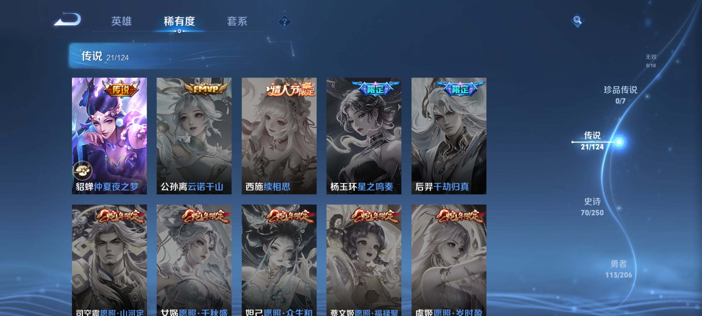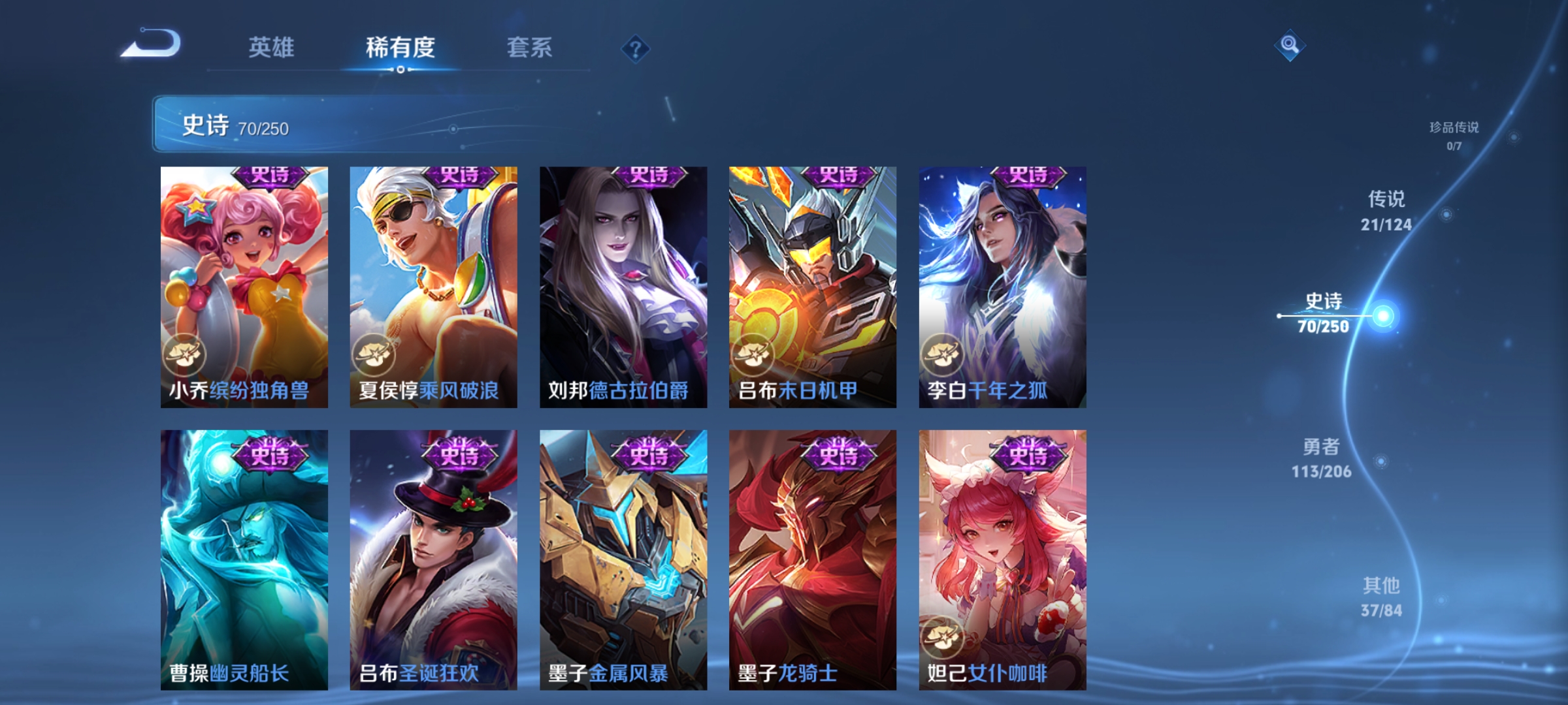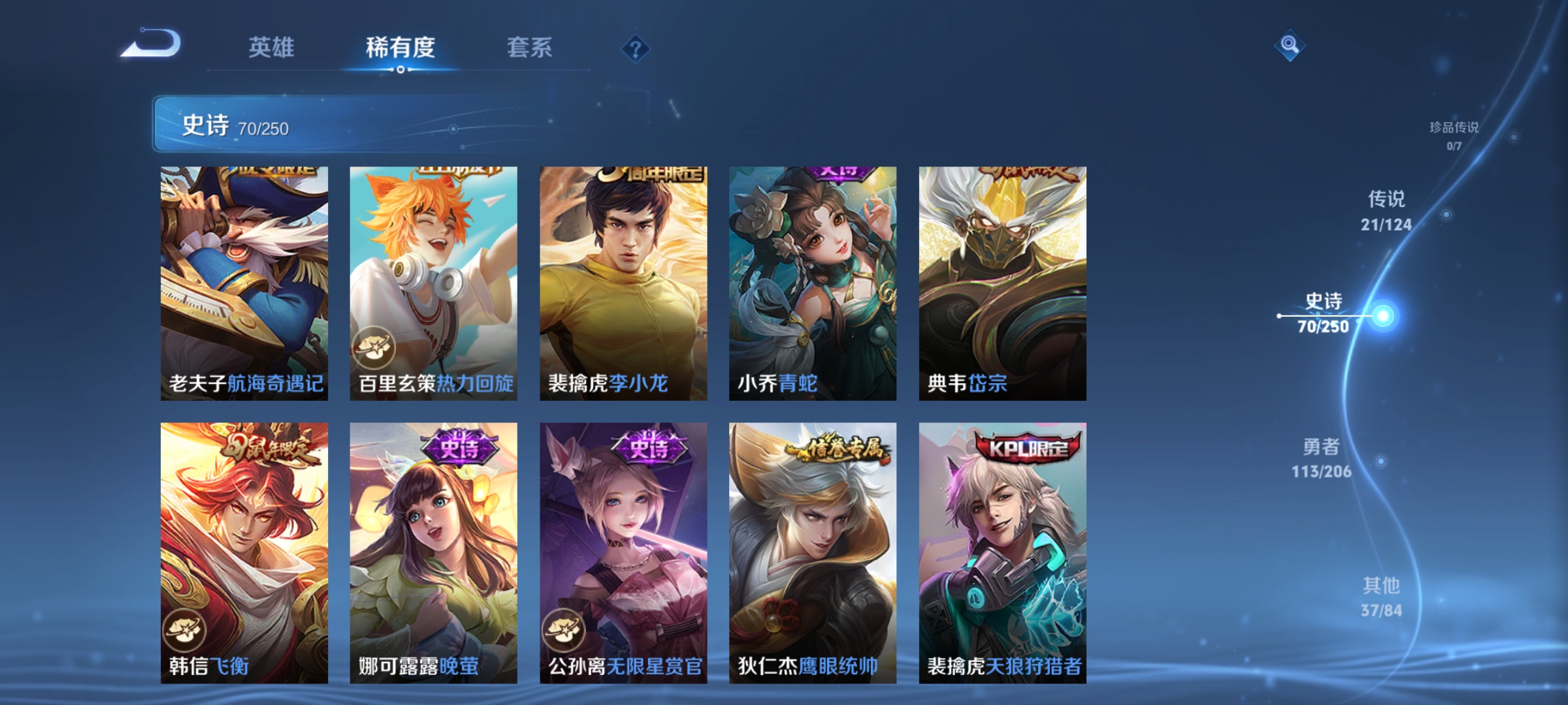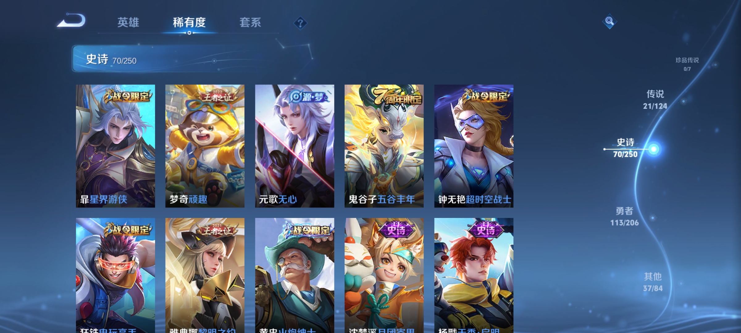 铠典藏澜蛇年限久胜小将军仲夏夜马可年限-可二次-123英雄-242皮肤-1典藏-21传说-69史诗 炽阳神光-镜 山海·苍雷引-曜 山海·炽霜斩-李信 无尽星芒-后羿 山海·玄木吟-马可波罗 岱宗-典韦 冰冠公主-雅典娜 百相守梦-刘备