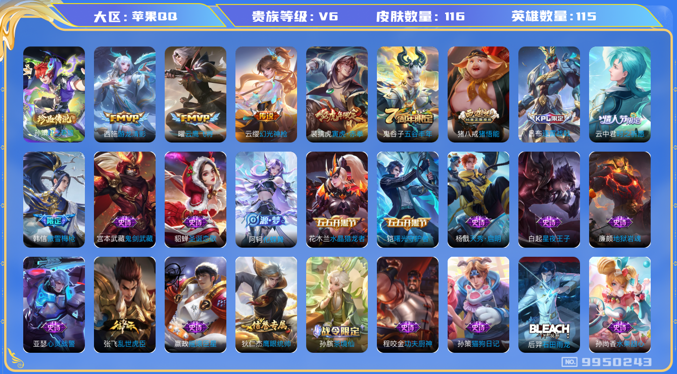 [9950243]v6 1珍品传说 4传说 115英雄 116皮肤 可修改实名 珍品传说:时之奇旅-孙策 传说皮:幻光神呛游龙清影小青龙云鹰飞将小将军 珍宝阁皮:女武神 限定皮:逐霄战戟傲雪梅呛五谷丰年猪悟能寅虎·赤拳老虎年限时之祈愿-云中君 史诗皮:百相守梦-百里守约茶境仙化蝶舞石田雨龙黄金分割率猫狗日记-孙策乱世虎臣女仆咖啡摇滚巨星水果甜心天才门将星夜王子功夫厨神鬼剑武藏心灵战警天秀·启明地狱岩魂逐浪之夏水晶猎龙者曙光守护者金属风暴圣诞狂欢圣诞恋歌鹰眼统帅未来纪元-赵云
