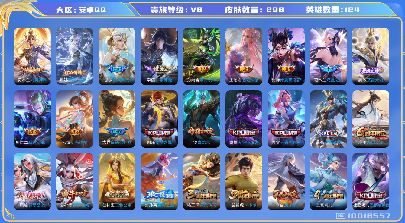 [10018557]v8 1典藏 1珍品传说 16传说 124英雄 298皮肤 可修改实名 荣耀水晶:九霄神辉木兰典藏 珍品传说:器灵·落星盏 传说皮:幻光神呛玄雷天君仲夏夜之梦大飞蛾末日机甲-孙尚香绿蚂蚱一念神魔乞巧织情超时空战士-狄仁杰炽翼辉光娃娃菜牛角包燃星之曲 珍宝阁皮:优雅恋人蔷薇恋人 限定皮:愿照·岁时盈虞姬年限逐霄战戟鸣野蒿白虎志电光耗子凤求凰白切鸡白鹤梁神女至美·乘鲤谣遇见飞天高山流水五谷丰年青龙志铠年限武圣梁祝逐梦之翼天狼溯光者天狼征服者祈雪灵祝雪兔子天狼绘梦者李小龙朱雀志守约年限霸王别姬-虞姬真爱至上猪悟能大圣娶亲引擎之心蜜橘之夏玉兔公主 史诗皮:紫霞仙子苍穹之光电玩小子小书包黄金分割率特工魅影千年之狐电玩·爆裂旋风冰冠公主江河有灵高渐离燃音魔法偶像歌手晚萤白蛇暗夜猫娘无限星赏官魅语龙骑士小龙虾末日机甲-吕布猫狗日记-孙策猫狗日记-大乔时之恋人-孙尚香乱世虎臣节奏热浪修罗女仆咖啡摇滚巨星水果甜心绅士熊喵星夜王子心灵骇客功夫厨神德古拉伯爵暗隐猎兽者幽灵船长鬼剑武藏心灵战警舞动绿茵地狱岩魂纤云弄巧繁星吟游呼啦呼啦拒霜思缤纷独角兽乘风破浪逐浪之夏水晶猎龙者箭羽风息金属风暴圣诞狂欢圣诞恋歌鹰眼统帅暗夜贵公子魅力维加斯未来纪元-赵云