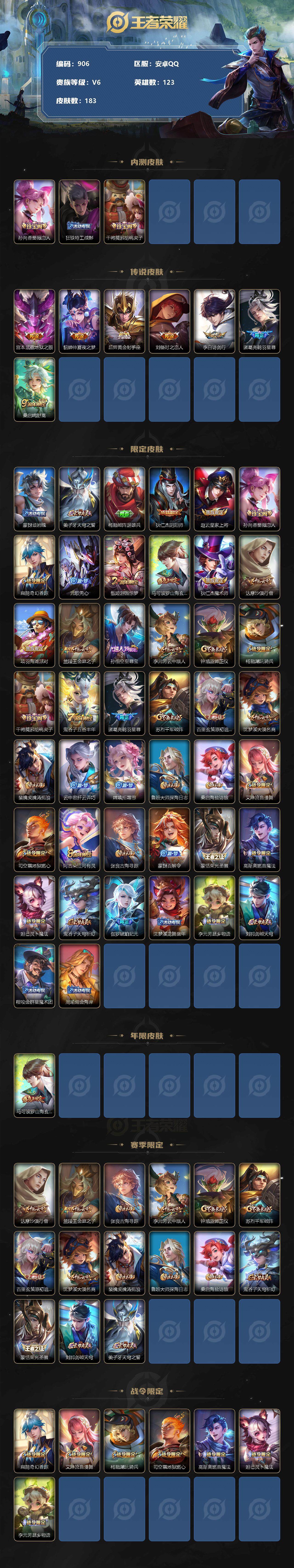 【商品标题】:安卓q-v6-最强王者段位-123英雄-183皮肤-0典藏-0无双-0珍品传说-7传说-50史诗 【内测皮肤】:孙尚香蔷薇恋人,狂铁特工战影,干将莫邪胡桃夹子 【传说皮肤】:宫本武藏地狱之眼,貂蝉仲夏夜之梦,后羿黄金射手座,刘备时之恋人,李白诗剑行,诸葛亮鹤羽星尊,桑启鸣野蒿 【限定皮肤】:蒙犽顽岩魄,姜子牙天穹之誓,杨戬破阵退雄兵,狄仁杰阴阳师,赵云皇家上将,孙尚香蔷薇恋人,扁鹊奇幻香踪,元歌无心,甄姬游园惊梦,马可波罗山海玄木吟,狄仁杰魔术师,达摩沙漠行僧,项羽海滩派对,兰陵王金庭之子,孙悟空至尊宝,李元芳云中旅人,钟馗驱傩正仪,杨戬潮玩骑兵,干将莫邪胡桃夹子,鬼谷子五谷丰年,诸葛亮鹤羽星尊,苏烈千军破阵,百里玄策原初追逐者,沈梦溪大漠名商,裴擒虎擒涛扼浪,云中君纤云弄巧,嫦娥拒霜思,鲁班大师探海日志,桑启海盐诗旅,艾琳流音漫舞,司空震地狱燃心,阿古朵江河有灵,张良古海寻踪,蒙犽百解令,蒙恬荣光圣徽,高渐离燃音魔法,妲己灵卜魔法,鬼谷子天穹祈灯,伽罗琥珀纪元,沈梦溪龙舞盛年,李元芳蔬乡物语,刘邦剑破天穹,程咬金群星魔术团,周瑜熔金海岸 【年限皮肤】:马可波罗山海玄木吟 【赛季限定】:达摩沙漠行僧,兰陵王金庭之子,张良古海寻踪,李元芳云中旅人,钟馗驱傩正仪,苏烈千军破阵,百里玄策原初追逐者,沈梦溪大漠名商,裴擒虎擒涛扼浪,鲁班大师探海日志,桑启海盐诗旅,鬼谷子天穹祈灯,蒙恬荣光圣徽,刘邦剑破天穹,姜子牙天穹之誓 【战令限定】:扁鹊奇幻香踪,艾琳流音漫舞,杨戬潮玩骑兵,司空震地狱燃心,高渐离燃音魔法,妲己灵卜魔法,李元芳蔬乡物语 【史诗皮肤】:阿轲暗夜猫娘,赵云皇家上将,甄姬冰雪圆舞曲,狄仁杰魔术师,廉颇地狱岩魂,宫本武藏鬼剑武藏,孙尚香蔷薇恋人,孙尚香水果甜心,嬴政摇滚巨星,妲己女仆咖啡,墨子龙骑士,墨子金属风暴,吕布圣诞狂欢,吕布末日机甲,孙悟空至尊宝,花木兰水晶猎龙者,刘邦德古拉伯爵,夏侯惇乘风破浪,兰陵王暗隐猎兽者,诸葛亮黄金分割率,甄姬游园惊梦,百里守约特工魅影,李元芳逐浪之夏,白起星夜王子,孙策猫狗日记,大乔猫狗日记,狄仁杰鹰眼统帅,孙尚香时之恋人,百里玄策原初追逐者,云中君纤云弄巧,钟馗乐园奇幻夜,嫦娥拒霜思,貂蝉唤灵魅影,鬼谷子五谷丰年,元歌无心,马可波罗山海玄木吟,扁鹊奇幻香踪,刘禅电玩爆裂旋风,百里守约真我赫兹,司空震地狱燃心,阿古朵江河有灵,蒙犽百解令,妲己灵卜魔法,高渐离燃音魔法,蒙恬荣光圣徽,伽罗琥珀纪元,蒙犽顽岩魄,牛魔星界战将,孙膑茶境仙,阿轲化蝶舞,刘禅鸭鸭历险记,狂铁龙之律动 【其他皮肤】:曹操决胜大满贯,杨戬破阵退雄兵,兰陵王幻夜行动,亚连破局者,海月王牌新星,钟无艳聚星闪耀,墨子进击墨子号,宫本武藏万象初新,宫本武藏未来纪元,韩信教廷特使,韩信街头霸王,安琪拉玩偶对对碰,蒙恬蔚蓝守将,典韦黄金武士,苏烈坚韧之力,牛魔西部大镖客,赵怀真太极少年,刘备汉昭烈帝,刘备纽约教父,吕布野性能量,鲁班大师乓乓大师,妲己少女阿狸,孙膑归虚梦演,赵云白执事,赵云忍炎影,亚瑟死亡骑士,甄姬花好人间,狂铁特工战影,钟无艳海滩丽影,米莱狄契约魔法,达摩大发明家,达摩拳王,后羿阿尔法小队,哪吒次元突破,王昭君幻想奇妙夜,露娜哥特玫瑰,老夫子功夫老勺,李元芳妄想特派,戈娅危途狂花,猪八戒潮玩探月行,张飞五福同心,太乙真人劲辣红锅,姜子牙炽热元素使,姜子牙时尚教父,明世隐虹云星官,扁鹊化身博士,扁鹊救世之瞳,大乔守护之力,蒙犽胡桃狂想曲,关羽龙腾万里,白起乐园追猎者,白起白色死神,莱西奥西部游侠,诸葛亮掌控之力,沈梦溪鲨炮海盗猫,朵莉亚金色潮汐,亚瑟鸿运当头,沈梦溪龙舞盛年,李元芳蔬乡物语,钟无艳春野之旅,盘古经纬探寻者,程咬金群星魔术团,周瑜熔金海岸 【营地id】:1834991342