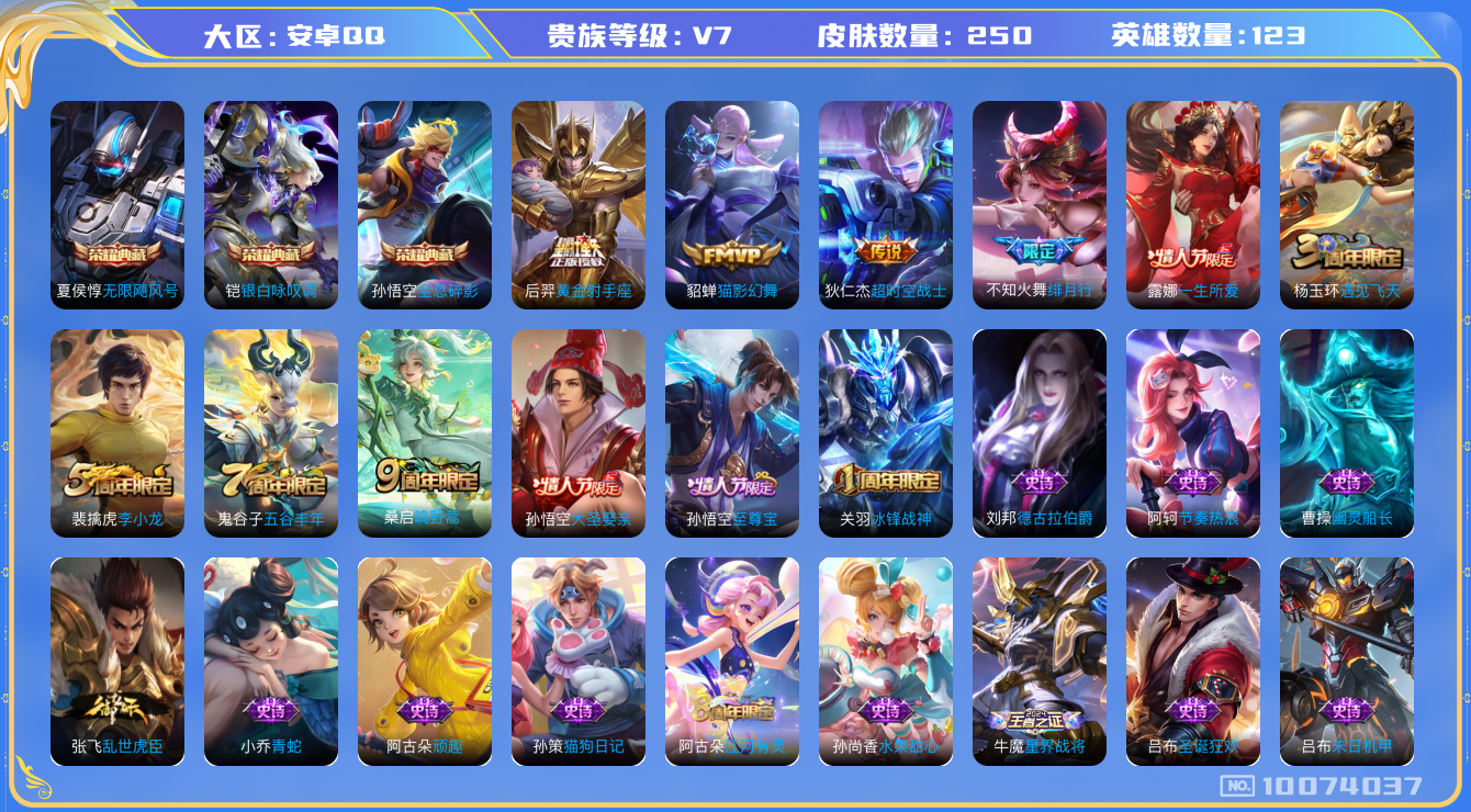 [10074037]v7 3典藏 5传说 123英雄 250皮肤 可修改实名 荣耀水晶:银白咏叹调倪克斯侍卫全息碎影猴子典藏无限飓风号高达 传说皮:黄金射手座猫影幻舞超时空战士-狄仁杰 珍宝阁皮:优雅恋人玩趣恶龙 限定皮:鸣野蒿至尊宝绯月行遇见飞天五谷丰年冰锋战神李小龙一生所爱大圣娶亲 史诗皮:星界战将白龙吟黄金分割率特工魅影千年之狐青蛇电玩·爆裂旋风冰冠公主江河有灵蒙恬荣光圣徽偶像歌手末日机甲-吕布猫狗日记-孙策乱世虎臣节奏热浪女仆咖啡摇滚巨星水果甜心绅士熊喵星夜王子心灵骇客功夫厨神德古拉伯爵暗隐猎兽者幽灵船长鬼剑武藏心灵战警舞动绿茵逐浪之夏金属风暴圣诞狂欢圣诞恋歌鹰眼统帅魅力维加斯黎明之约顽趣-阿古朵未来纪元-赵云