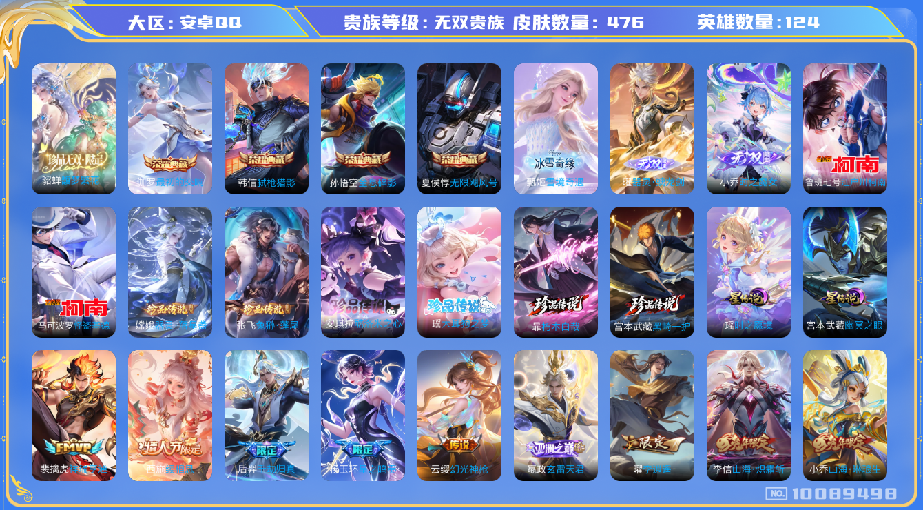 [10089498]实名: 可修改 贵族等级: 无双贵族 英雄数: 124 皮肤数: 476 荣耀水晶: 无限飓风号全息碎影弑呛猎影最初的交响 无双皮: 小乔时之魔女雪境奇遇-甄姬器灵·螭龙剑 珍品传说: 江户川柯南怪盗基德器灵·落星盏兔狲·蓬尾酷洛米之心大耳狗之梦朽木白哉黑崎一护 星传说: 时之愿境幽冥之眼 传说皮: 黄金狮子座黄金射手座云鹰飞将绛天战甲黄金白羊座猫影幻舞久胜战神炽阳神光一念神魔云霓雀翎末日机甲-孙尚香地狱火零号·赤焰地狱之眼音你心动-周瑜胖达荣荣李乞巧织情时之恋人-刘备淬星耀世末日机甲-孙策挚爱之约无双飞将音你闪耀碎云神器·狴犴令山海·炽霜斩山海·琳琅生山海·苍雷引炽翼辉光燃星之曲画中仙浮生妄记忆之芯鹤羽星尊灼幽烈阳艾琳觅芳踪玄雷天君幻光神呛祥瑞亨通星之鸣奏千劫归真续相思 限定皮: 冰锋战神遇见飞天李小龙游园惊梦梁祝御风骁将引擎之心白鹤梁神女烈魂异界灵契虎魄神威凤求凰寅虎·御盾美猴王青龙志朱雀志至尊宝一生所爱武陵仙君大圣娶亲寅虎·瑞焰高山流水孙行者猪悟能匿光追影者女儿国国王傲雪梅呛寅虎·赤拳寅虎·心曲寅虎·展翼时之祈愿-云中君时之祈愿-瑶无尽星芒深海之息唐三藏前尘镜枫霜尽时之奇旅-妲己星穹之声五谷丰年绯月行神器·万象笔梦圆繁星诗剑行怒海麟威山海·玄木吟冰霜神祇山海·碧波行齐天大圣无限倾心-虞姬无限倾心-项羽影龙天霄逐霄战戟愿照·千秋盛愿照·众生和愿照·山河定愿照·岁时盈愿照·福禄聚愿照·九州拓 【由于赛季三个月更新一次,段位皆有上号为准,对段位有要求这谨慎下单!!!】