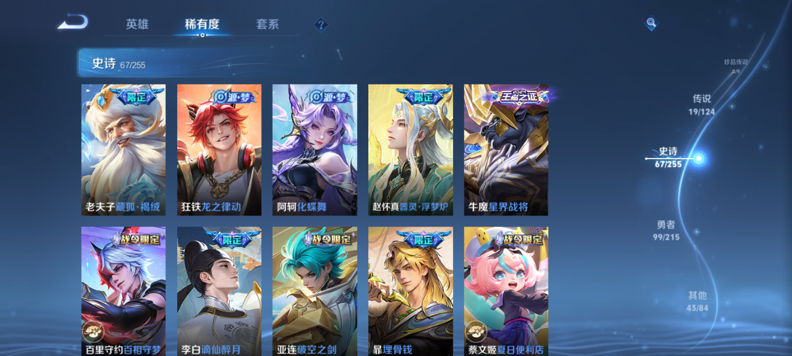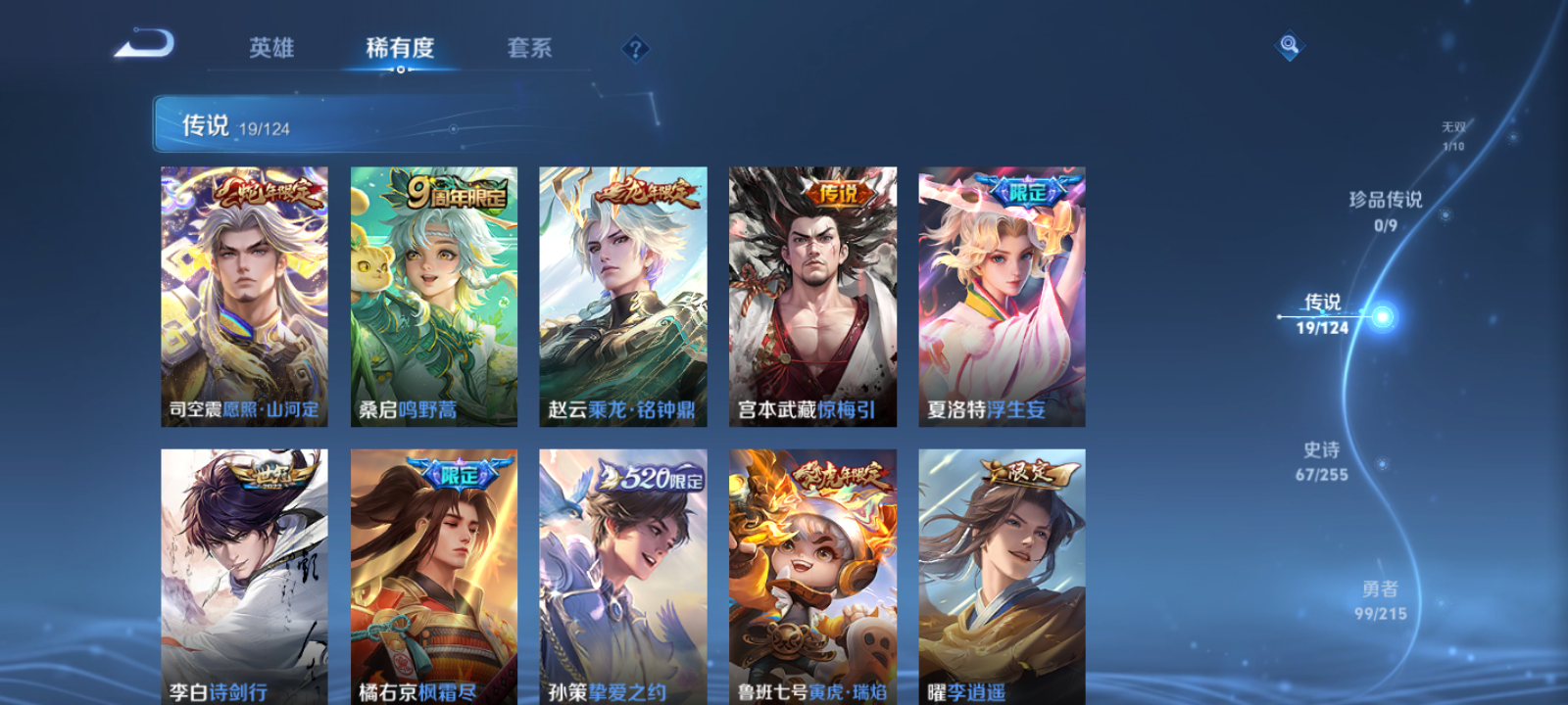 【王者荣耀】【lywz10124】无双1 典藏2 传说19 史诗47 英雄124 皮肤231 贵族8级 贵族等级:贵族8级__荣耀典藏:无限飓风号|鸣剑·曳影__传说皮肤:鸣野蒿|枫霜尽|挚爱之约|启明星使|地狱之眼|黄金狮子座|狄仁杰-超时空战士|刘备-时之恋人|一念神魔|云鹰飞将|李|浮生妄|惊梅引|诗剑行|时雨天司|寅虎·瑞焰|周瑜-音你心动|乘龙·铭钟鼎|愿照·山河定__稀有限定:寅虎·御盾|白晶晶|朱雀志|蔷薇恋人|青春决赛季|李小龙|拒霜思|百解令|冰霜恋舞曲|大漠名商|地狱燃心|高山流水|古海寻踪|海滩派对|海盐诗旅|皇家上将|辉光之辰|混沌棋|剑破天穹|金庭之子|魔术师|奇幻香踪|千军破阵|擒涛扼浪|驱傩正仪|荣光圣徽|沙漠行僧|探海日志|醍醐杖|天穹祈灯|万华元夜|妄想食味|无心|五谷丰年|演武夺筹|疑决卦|阴阳师|御旌|御狮|原初追逐者|暗夜贵公子|暗隐猎兽者|白龙吟|冰冠公主|冰雪圆舞曲|乘风破浪|大乔-猫狗日记|地狱岩魂|功夫厨神|鬼剑武藏|节奏热浪|金属风暴|魅力维加斯|梦奇-顽趣|偶像歌手|赏金猎手|绅士熊喵|圣诞狂欢|圣诞恋歌|水果甜心|水晶猎龙者|天才门将|天秀·启明|赵云-未来纪元|星夜王子|永昼|幽灵船长|月团寄思|钟无艳-超时空战士|紫霞仙子|百里守约-百相守梦|老夫子-百相守梦|谪仙醉月|噬灭天穹|破空之剑|埋骨钱|蔡文姬-夏日便利店|虞姬-夏日便利店|天穹之誓|修罗|曙光守护者|心灵战警|千年之狐|舞动绿茵|星界战将|谧流熔炉|器灵·浮梦炉|化蝶舞|御霄|狰|原初探秘者|云中旅人|孙悟空-神迹守卫|流音漫舞|落雪兰心|藏狐·褐绒|龙之律动|布丁狗之约|虚灵犬护__王者段位:至尊星耀__无双皮肤:碎月剑心__优质皮肤:潮玩探月行|鲨炮海盗猫|野性能量|丁香结|科学大爆炸|守护之力|坚韧之力|幻乐之宴|功夫老勺|幻想奇妙夜|海滩丽影|阿尔法小队|兔女郎|死亡骑士|黄金武士|少女阿狸|天使之翼|玩偶对对碰|宫本武藏-未来纪元|红桃皇后|忍·炎影|爱心护理|街头霸王|鸿运当头|时空谍影|破局者|西部游侠|潮玩造梦师|危途狂花|契约魔法|潮玩牛仔|黑桃队长|拳王|白色死神|程咬金-星际陆战队|大发明家|哥特玫瑰|西施-雪境奇遇|灵卦秘语|掌控之力|雾都夜雨|铁骨偃魂|龙腾万里|霸王丸|乱世虎臣|敏锐之力|龙舞盛年|汉昭烈帝|乓乓大师|五福同心|盾山-圆桌骑士|沉稳之力|化身博士|花好人间|熔金海岸|万象初新|潮玩骑兵|苍林狼骑|蔚蓝守将|劲辣红锅|特工战影|玫蓝誓约打野边路皮肤号鸣剑·电影,无限飓风号,碎月剑心 愿照·山河定 乘龙·铭钟鼎 惊梅引 浮生妄 枫霜尽 李等热门皮肤