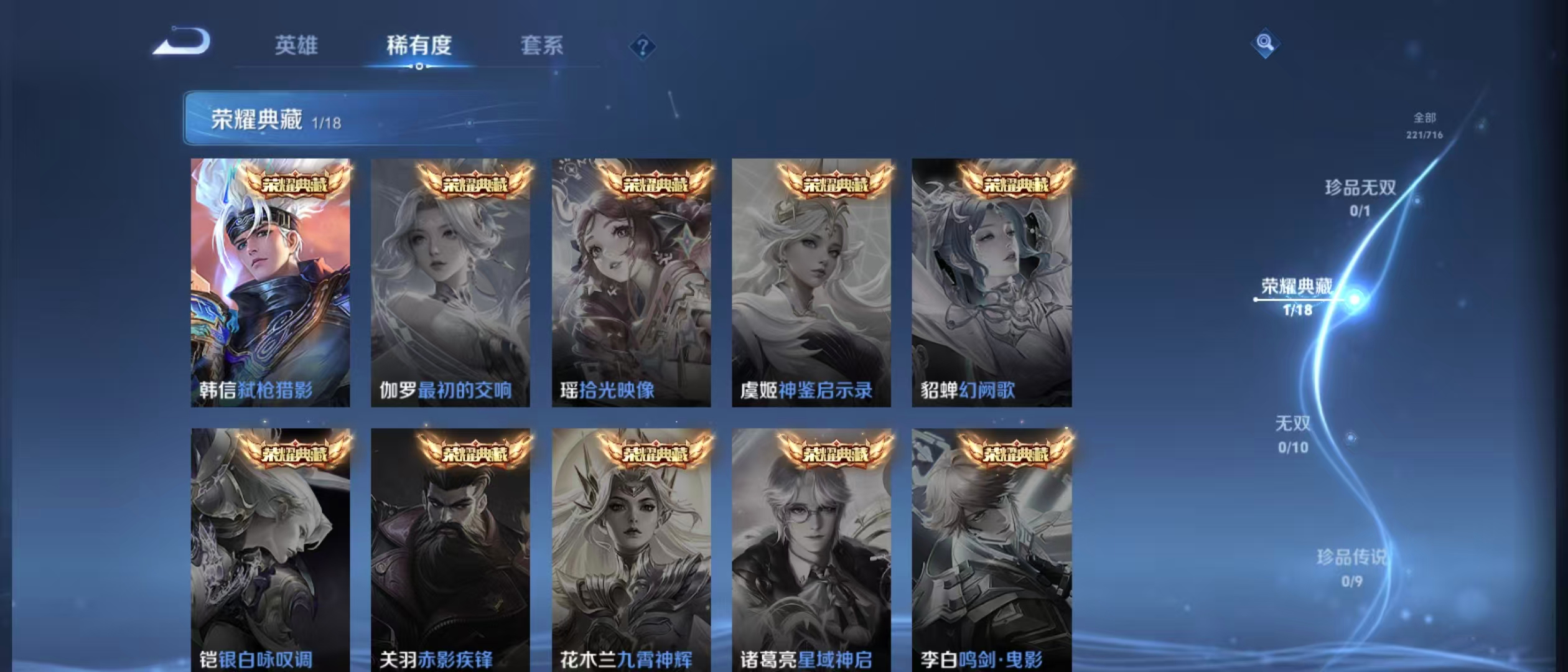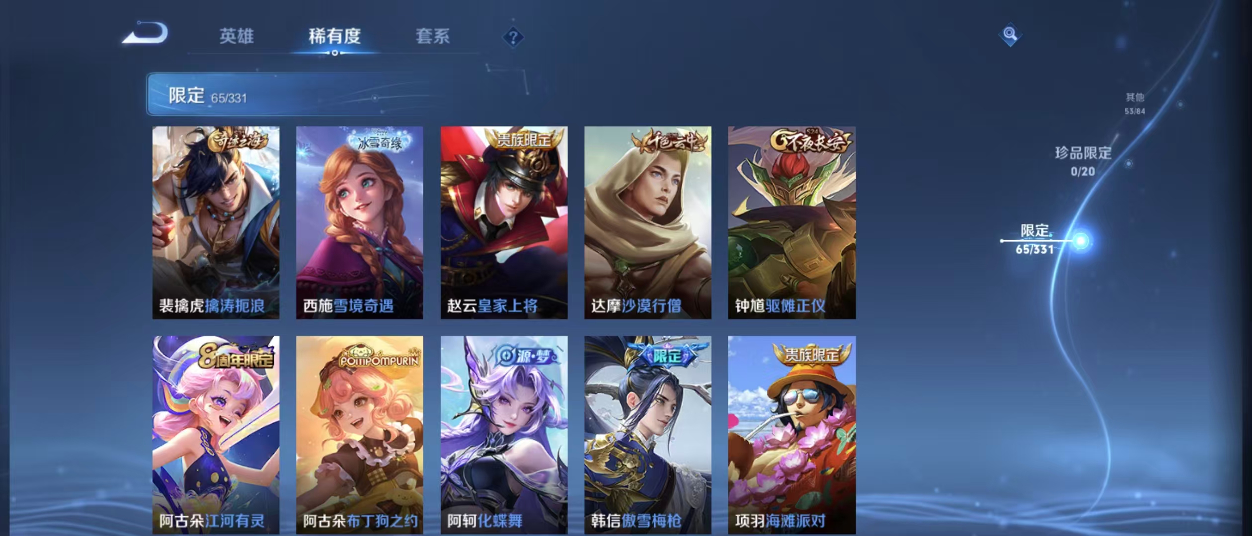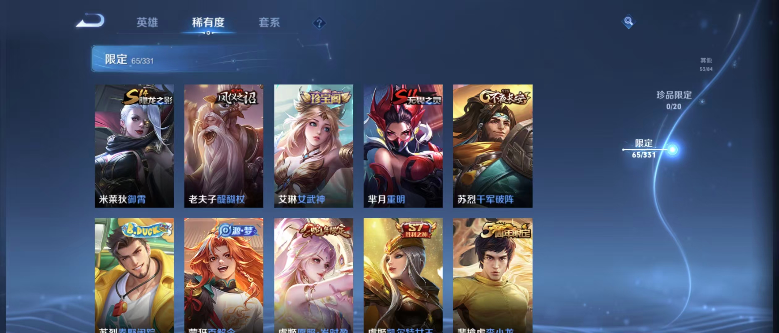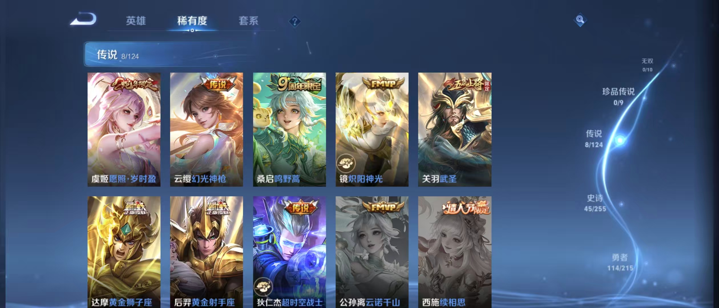 安卓qq/v7/尊贵铂金/221皮肤/125英雄/1典藏/0珍品无双/0无双/0珍品传说/8传说/45史诗/9稀有英雄