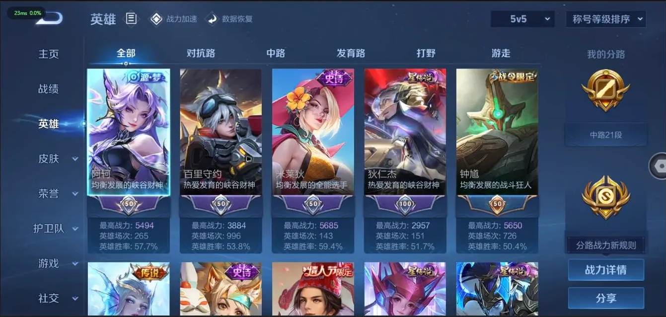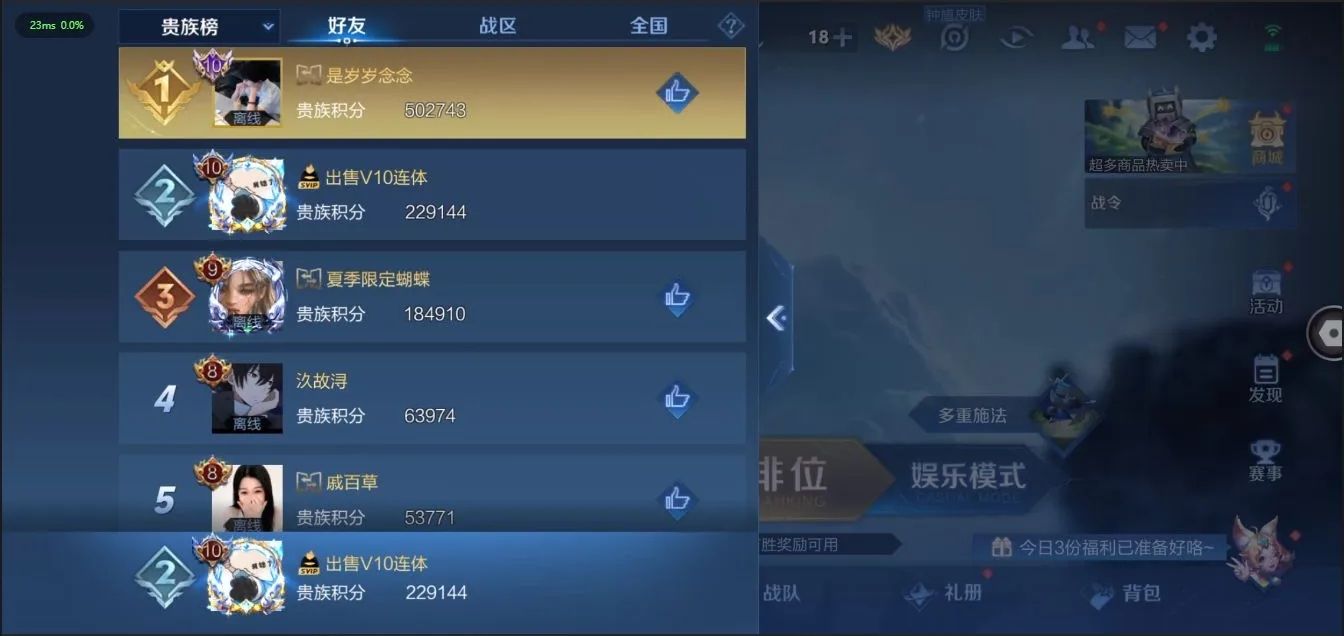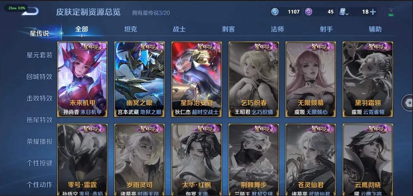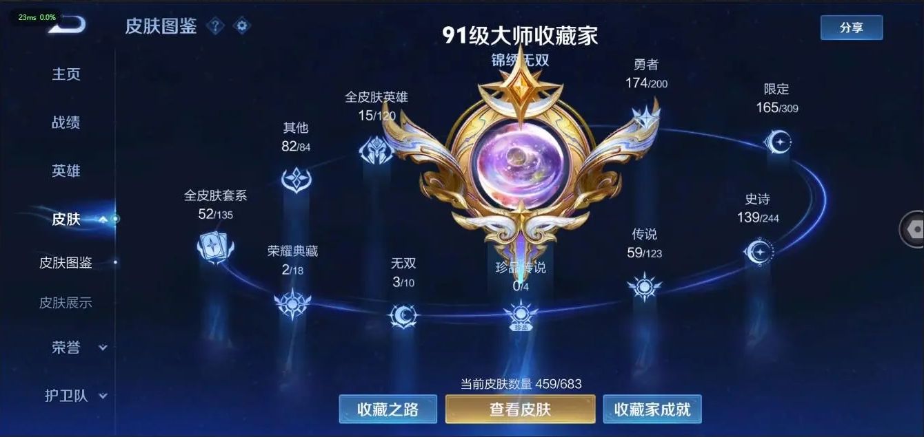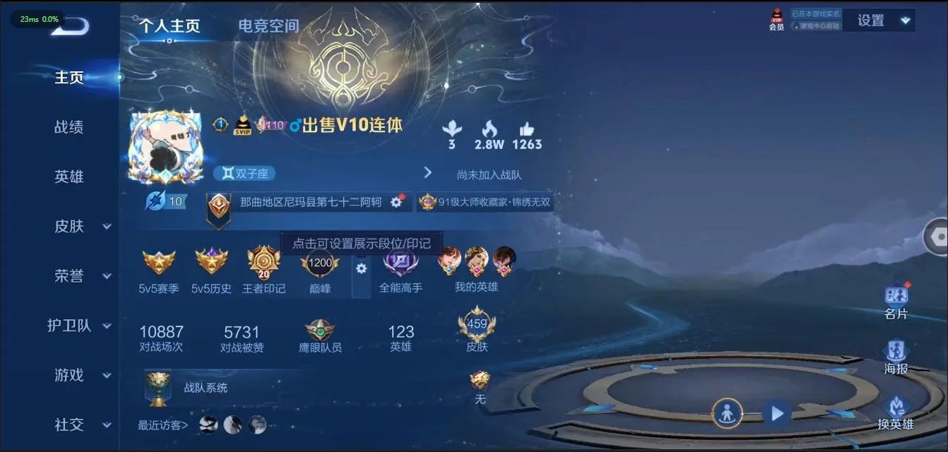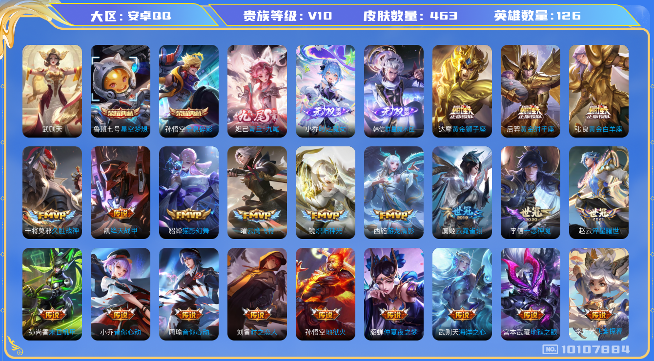 [10107884]贵族v10 荣耀典藏3 无双3 传说皮肤59 史诗皮肤140 皮肤数量462 皮肤价值:391852 英雄125 最强王者