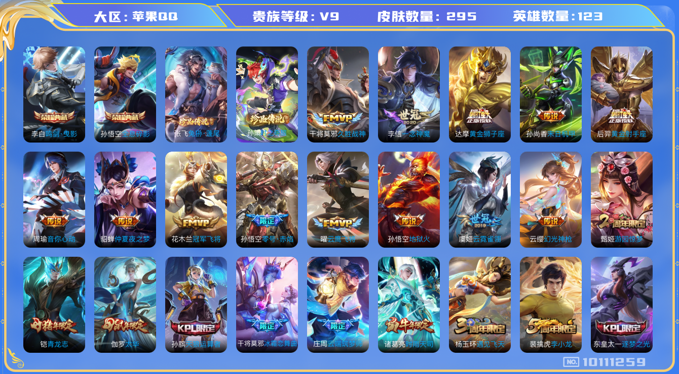 [10111259]v9 2典藏 2珍品传说 18传说 123英雄 295皮肤 可修改实名 荣耀水晶:鸣剑·曳影全息碎影猴子典藏 珍品传说:时之奇旅-孙策兔狲·蓬尾 传说皮:幻光神呛黄金狮子座黄金射手座零号·赤焰地狱火仲夏夜之梦大飞蛾末日机甲-孙尚香绿蚂蚱云霓雀翎一念神魔冠军飞将久胜战神云鹰飞将小将军音你心动-周瑜 珍宝阁皮:女武神玩趣恶龙 限定皮:鸣野蒿白虎志电光耗子太华伽罗年限时之彼端白晶晶时雨天司水龙头遇见飞天五谷丰年青龙志铠年限冰锋战神天狼运算者游园惊梦梁祝逐梦之星天狼绘梦者李小龙逐梦之光霸王别姬-虞姬默契交锋-花木兰孙行者大圣娶亲冰霜恋舞曲云端筑梦师 史诗皮:百相守梦-百里守约茶境仙化蝶舞鸭鸭历险记-刘禅灵蛊蚀心龙之律动紫霞仙子电玩小子小书包白龙吟黄金分割率特工魅影千年之狐冰冠公主偶像歌手龙骑士小龙虾无限星赏官魅语末日机甲-吕布猫狗日记-孙策时之恋人-孙尚香乱世虎臣节奏热浪修罗女仆咖啡水果甜心星夜王子心灵骇客时之奇旅-安琪拉功夫厨神德古拉伯爵暗隐猎兽者幽灵船长鬼剑武藏心灵战警天秀·启明舞动绿茵纤云弄巧繁星吟游呼啦呼啦拒霜思缤纷独角兽乘风破浪逐浪之夏月团寄思水晶猎龙者金属风暴圣诞狂欢圣诞恋歌鹰眼统帅王者之锤魅力维加斯未来纪元-赵云