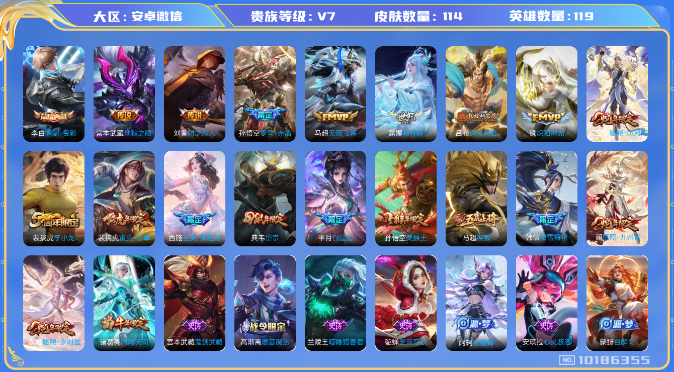 [10186355]v7 1典藏 12传说 119英雄 114皮肤 可修改实名 荣耀水晶:鸣剑·曳影 传说皮:零号·赤焰地狱之眼炽阳神光无双飞将时之恋人-刘备电焊工遇见神鼓霜月吟 珍宝阁皮:万物之道 限定皮:愿照·九州拓澜年限愿照·岁时盈虞姬年限愿照·山河定司空震年限傲雪梅呛白晶晶时雨天司水龙头神威电光马子至美·乘鲤谣岱宗典韦年限李小龙美猴王寅虎·赤拳老虎年限 史诗皮:器灵·浮梦炉绮世丹青化蝶舞龙之律动石田雨龙紫霞仙子电玩小子小书包黄金分割率特工魅影百相守梦刘备真我赫兹镜冰冠公主江河有灵百解令蒙犽高渐离燃音魔法蒙恬荣光圣徽偶像歌手时之恋人-孙尚香水果甜心心灵骇客功夫厨神暗隐猎兽者鬼剑武藏舞动绿茵纤云弄巧拒霜思逐浪之夏曙光守护者箭羽风息金属风暴圣诞恋歌鹰眼统帅未来纪元-赵云