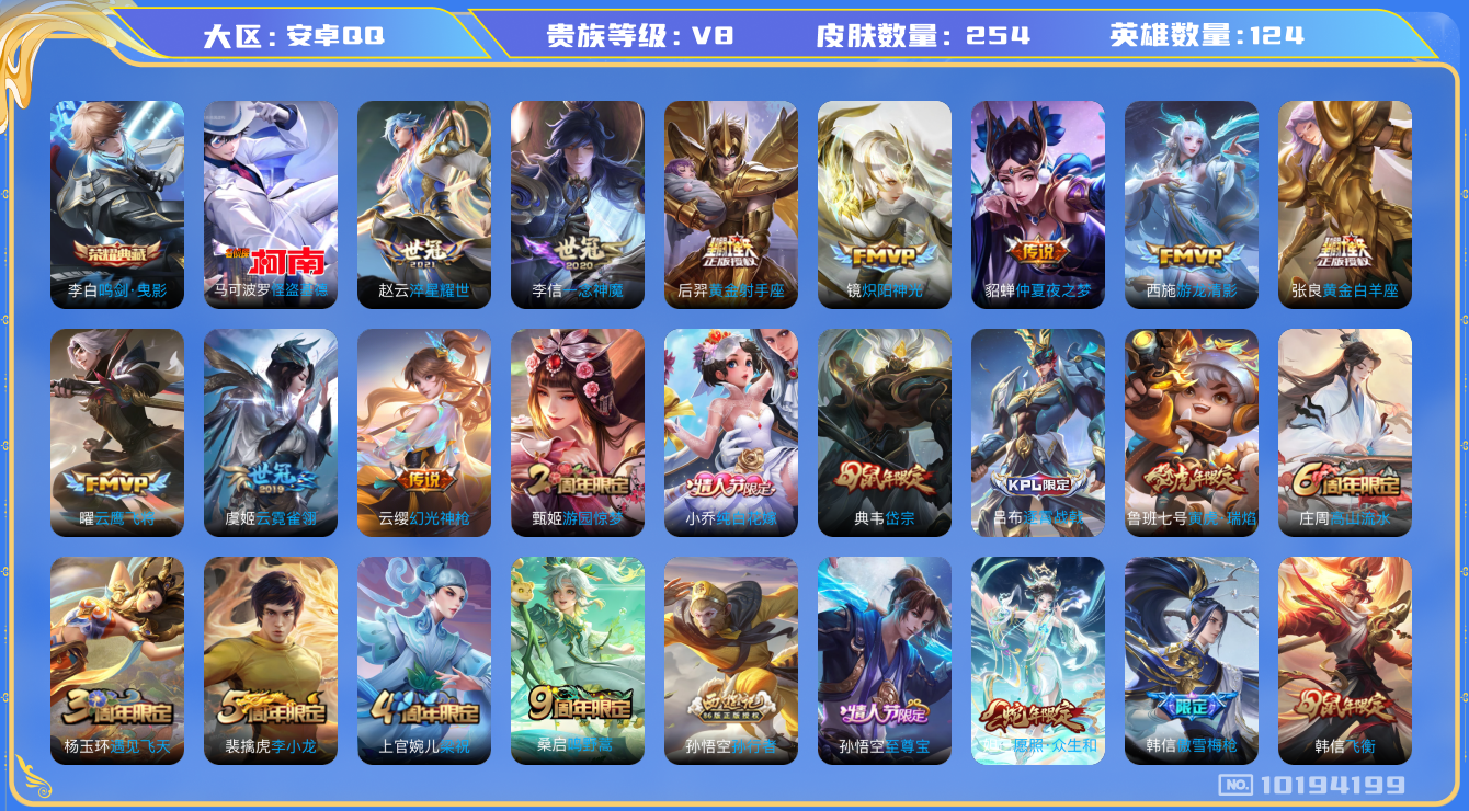 [10194199]v8 1典藏 1珍品传说 15传说 124英雄 254皮肤 可修改实名 荣耀水晶:鸣剑·曳影 珍品传说:怪盗基德 传说皮:幻光神呛游龙清影小青龙黄金射手座黄金白羊座仲夏夜之梦大飞蛾云霓雀翎一念神魔淬星耀世云鹰飞将小将军炽阳神光 珍宝阁皮:蔷薇恋人玩趣恶龙 限定皮:愿照·九州拓澜年限愿照·众生和妲己年限逐霄战戟鸣野蒿至尊宝傲雪梅呛飞衡韩信年限遇见飞天高山流水游园惊梦梁祝岱宗典韦年限李小龙纯白花嫁孙行者寅虎·瑞焰虎皮蛋子 史诗皮:百相守梦-百里守约茶境仙器灵·浮梦炉星界特工化蝶舞撼地雄心破空之剑紫霞仙子苍穹之光电玩小子小书包黄金分割率特工魅影千年之狐永昼冰冠公主偶像歌手青蛇晚萤白蛇猫狗日记-孙策乱世虎臣节奏热浪摇滚巨星水果甜心心灵骇客功夫厨神德古拉伯爵暗隐猎兽者鬼剑武藏乐园奇幻夜天秀·启明舞动绿茵地狱岩魂拒霜思乘风破浪逐浪之夏水晶猎龙者曙光守护者箭羽风息金属风暴原初追逐者圣诞狂欢鹰眼统帅魅力维加斯黎明之约赏金猎手未来纪元-赵云