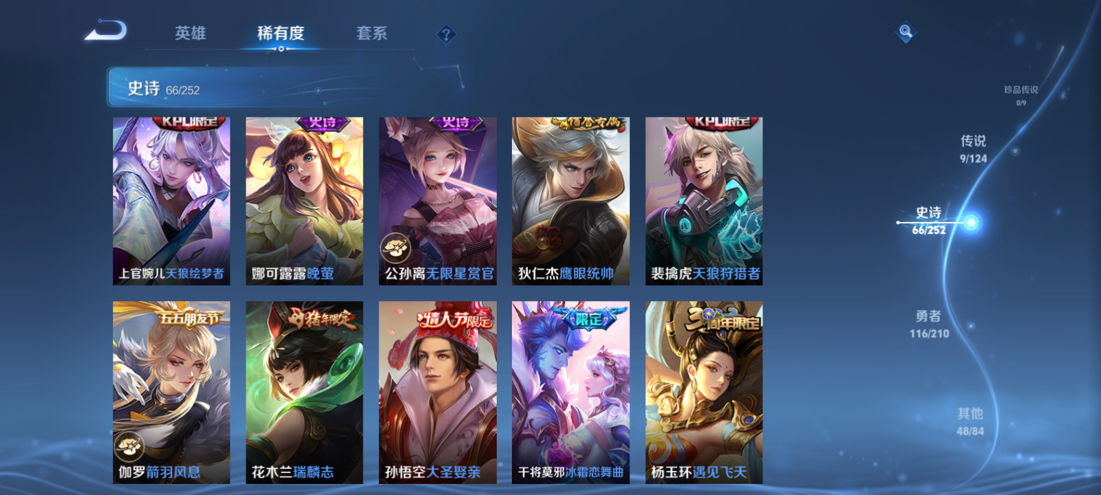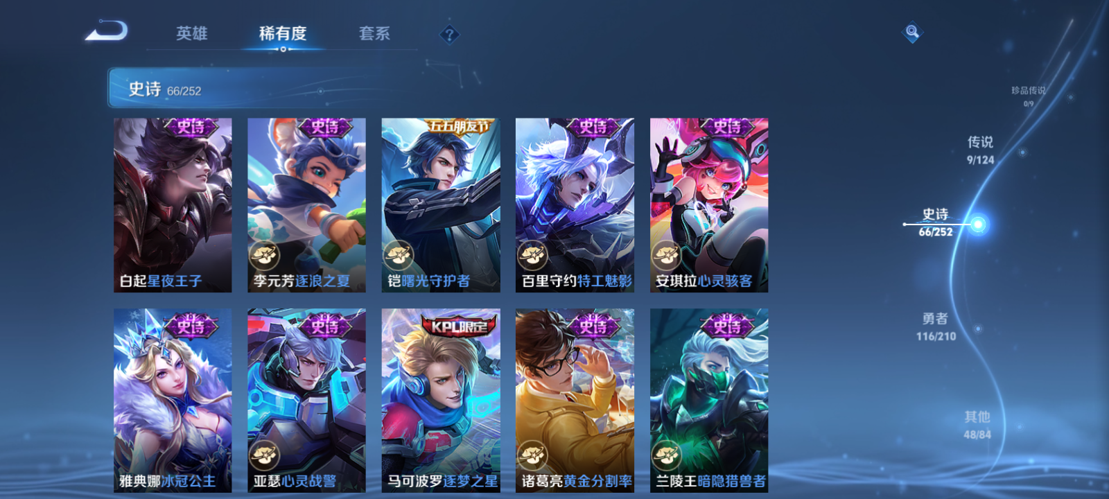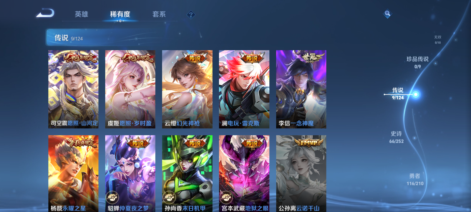 [10202169]【v7 杨戬狗限 至尊宝 9传说 66史诗 1星元】239皮肤-124英雄【传说皮肤】 司空震-愿照·山河定 虞姬-愿照·岁时盈 杨戬-永曜之星 李信-一念神魔 云缨-幻光神呛 貂蝉-仲夏夜之梦 孙尚香-末日机甲 宫本武藏-地狱之眼【史诗皮肤】 孙悟空-至尊宝 上官婉儿-天狼绘梦者 关羽-冰锋战神 盘古-敬我三分 孙悟空-大圣娶亲 项羽-霸王别姬 虞姬-霸王别姬 白起-苍鳞隐世 芈月-白晶晶 马可波罗-逐梦之星 裴擒虎-天狼狩猎者 亚连-糖绘人间 伽罗-天狼溯光者 干将莫邪-冰霜恋舞曲 钟无艳-王者之锤 项羽-苍穹之光 嫦娥-拒霜思 花木兰-瑞麟志 刘备-百相守梦 墨子-龙骑士 甄姬-冰雪圆舞曲 梦奇-顽趣 干将莫邪-真爱魔法 老夫子-航海奇遇记 白起-星夜王子 嬴政-暗夜贵公子 李元芳-逐浪之夏 铠-曙光守护者 百里守约-特工魅影 亚瑟-心灵战警 诸葛亮-黄金分割率 兰陵王-暗隐猎兽者 夏侯惇-乘风破浪 韩信-白龙吟 吕布-末日机甲 妲己-魅力维加斯 孙尚香-水果甜心 妲己-女仆咖啡 刘邦-德古拉伯爵 雅典娜-冰冠公主 安琪拉-心灵骇客 公孙离-无限星赏官 貂蝉-圣诞恋歌 宫本武藏-鬼剑武藏 吕布-圣诞狂欢 墨子-金属风暴 王昭君-偶像歌手 元歌-无心 云中君-纤云弄巧 庄周-高山流水 裴擒虎-李小龙 狄仁杰-鹰眼统帅 赵云-嘻哈天王 孙尚香-蔷薇恋人 杨玉环-遇见飞天 伽罗-箭羽风息 张飞-乱世虎臣 雅典娜-黎明之约 狄仁杰-魔术师 赵云-皇家上将 ky5396 营地id:361468937