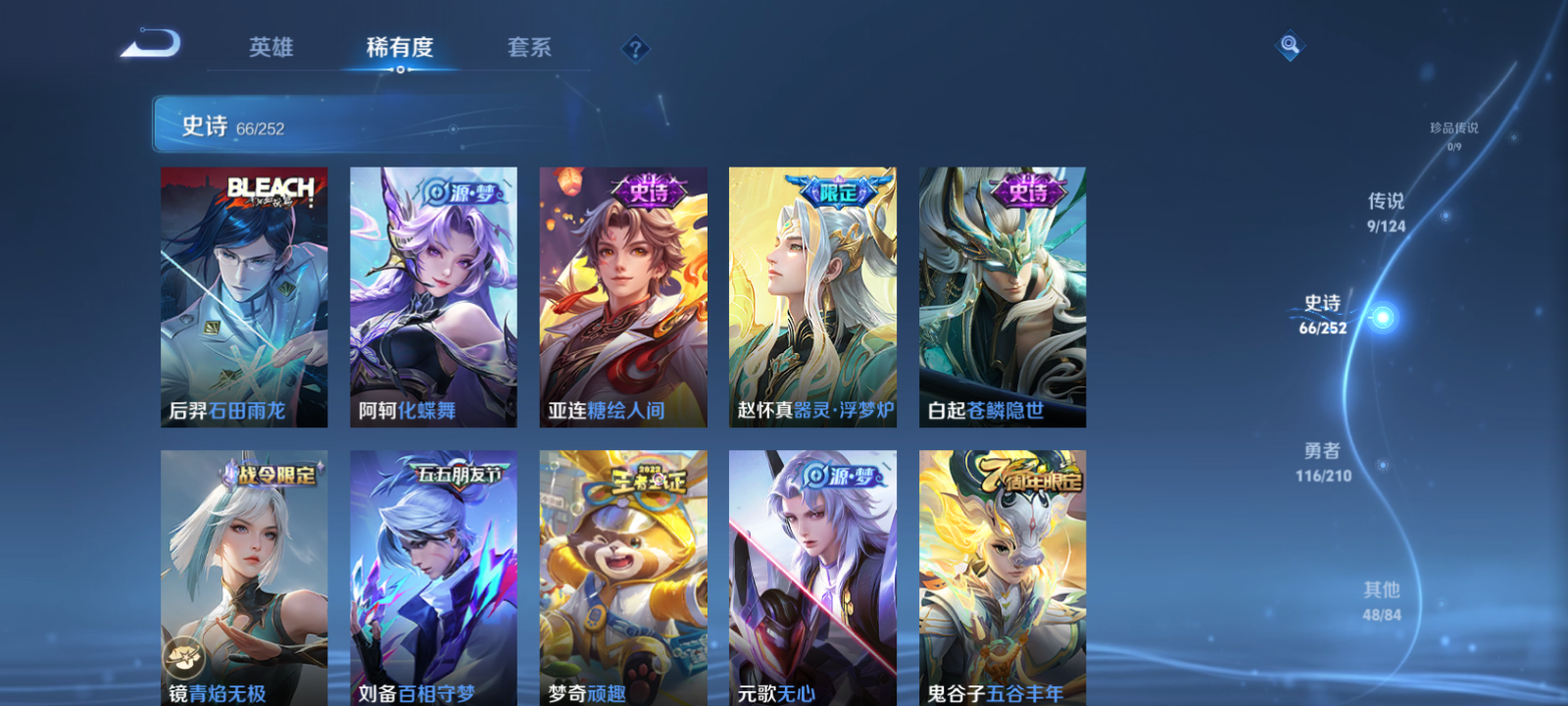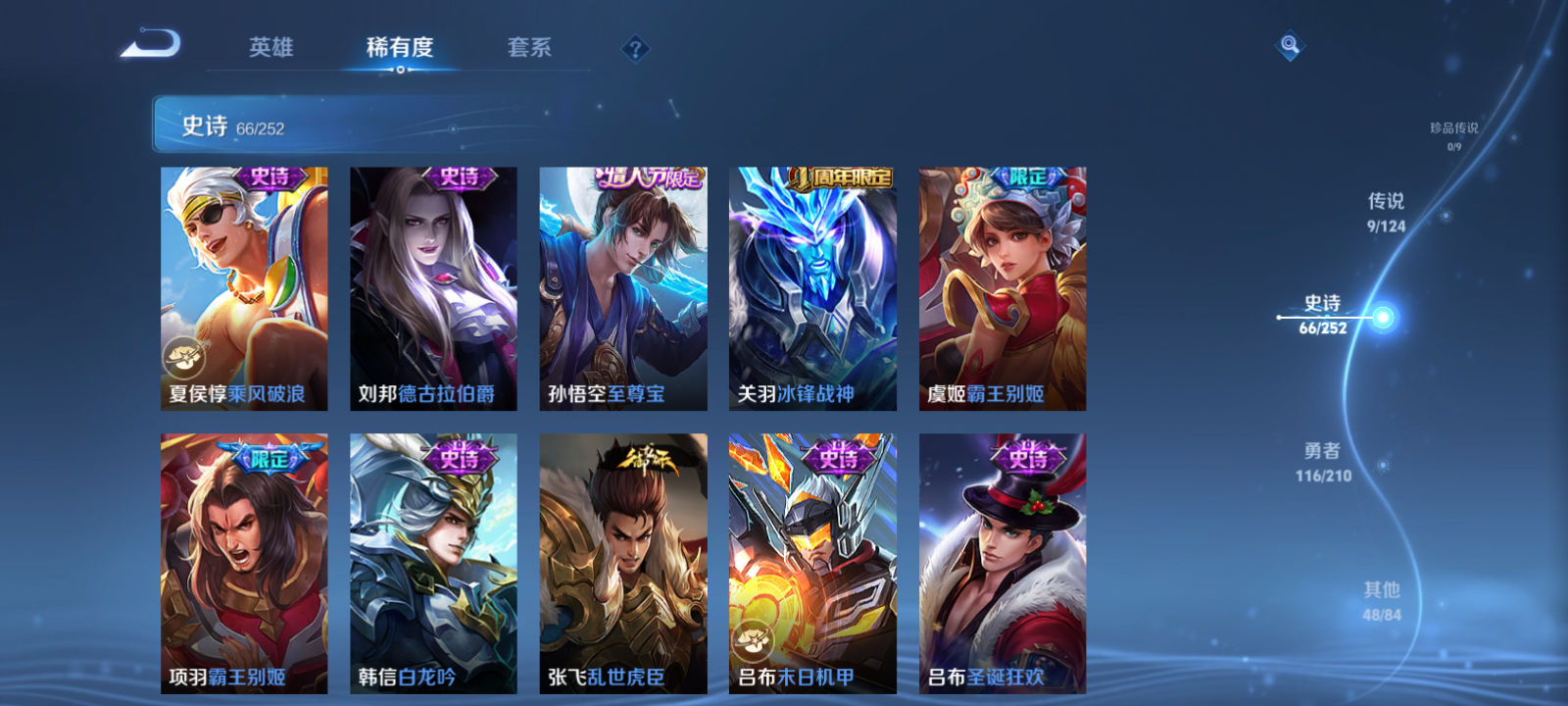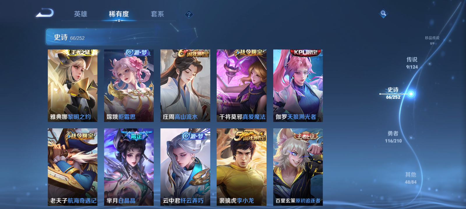 [10202169]【v7 杨戬狗限 至尊宝 9传说 66史诗 1星元】239皮肤-124英雄【传说皮肤】 司空震-愿照·山河定 虞姬-愿照·岁时盈 杨戬-永曜之星 李信-一念神魔 云缨-幻光神呛 貂蝉-仲夏夜之梦 孙尚香-末日机甲 宫本武藏-地狱之眼【史诗皮肤】 孙悟空-至尊宝 上官婉儿-天狼绘梦者 关羽-冰锋战神 盘古-敬我三分 孙悟空-大圣娶亲 项羽-霸王别姬 虞姬-霸王别姬 白起-苍鳞隐世 芈月-白晶晶 马可波罗-逐梦之星 裴擒虎-天狼狩猎者 亚连-糖绘人间 伽罗-天狼溯光者 干将莫邪-冰霜恋舞曲 钟无艳-王者之锤 项羽-苍穹之光 嫦娥-拒霜思 花木兰-瑞麟志 刘备-百相守梦 墨子-龙骑士 甄姬-冰雪圆舞曲 梦奇-顽趣 干将莫邪-真爱魔法 老夫子-航海奇遇记 白起-星夜王子 嬴政-暗夜贵公子 李元芳-逐浪之夏 铠-曙光守护者 百里守约-特工魅影 亚瑟-心灵战警 诸葛亮-黄金分割率 兰陵王-暗隐猎兽者 夏侯惇-乘风破浪 韩信-白龙吟 吕布-末日机甲 妲己-魅力维加斯 孙尚香-水果甜心 妲己-女仆咖啡 刘邦-德古拉伯爵 雅典娜-冰冠公主 安琪拉-心灵骇客 公孙离-无限星赏官 貂蝉-圣诞恋歌 宫本武藏-鬼剑武藏 吕布-圣诞狂欢 墨子-金属风暴 王昭君-偶像歌手 元歌-无心 云中君-纤云弄巧 庄周-高山流水 裴擒虎-李小龙 狄仁杰-鹰眼统帅 赵云-嘻哈天王 孙尚香-蔷薇恋人 杨玉环-遇见飞天 伽罗-箭羽风息 张飞-乱世虎臣 雅典娜-黎明之约 狄仁杰-魔术师 赵云-皇家上将 ky5396 营地id:361468937