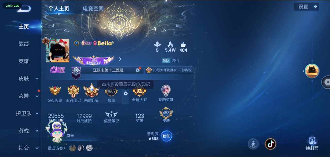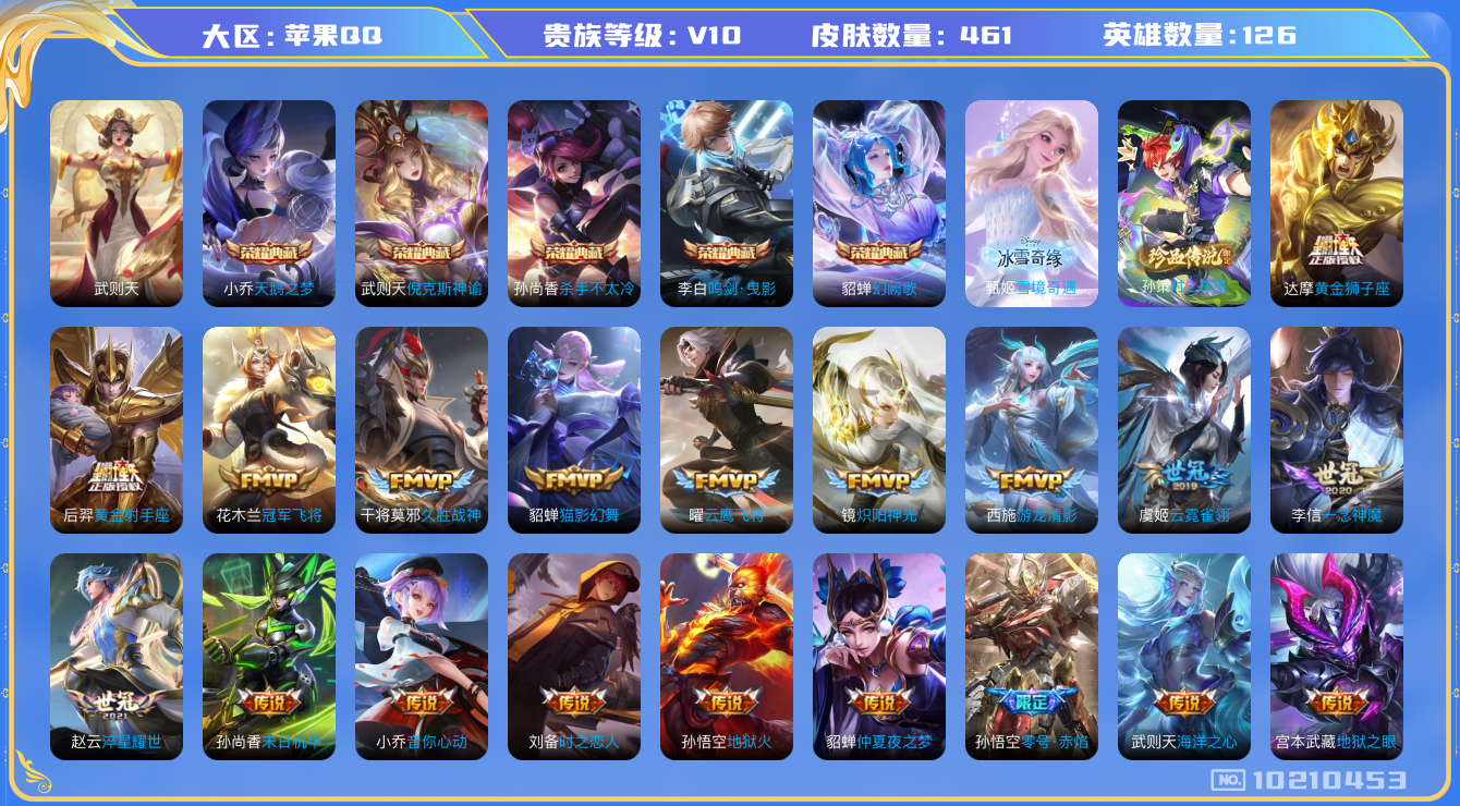 [10210453]禁言到26年4月 贵族v10 荣耀典藏6 无双1 珍品传说1 传说皮肤61 史诗皮肤152 皮肤数量457 皮肤价值:455330 英雄125 无双王者