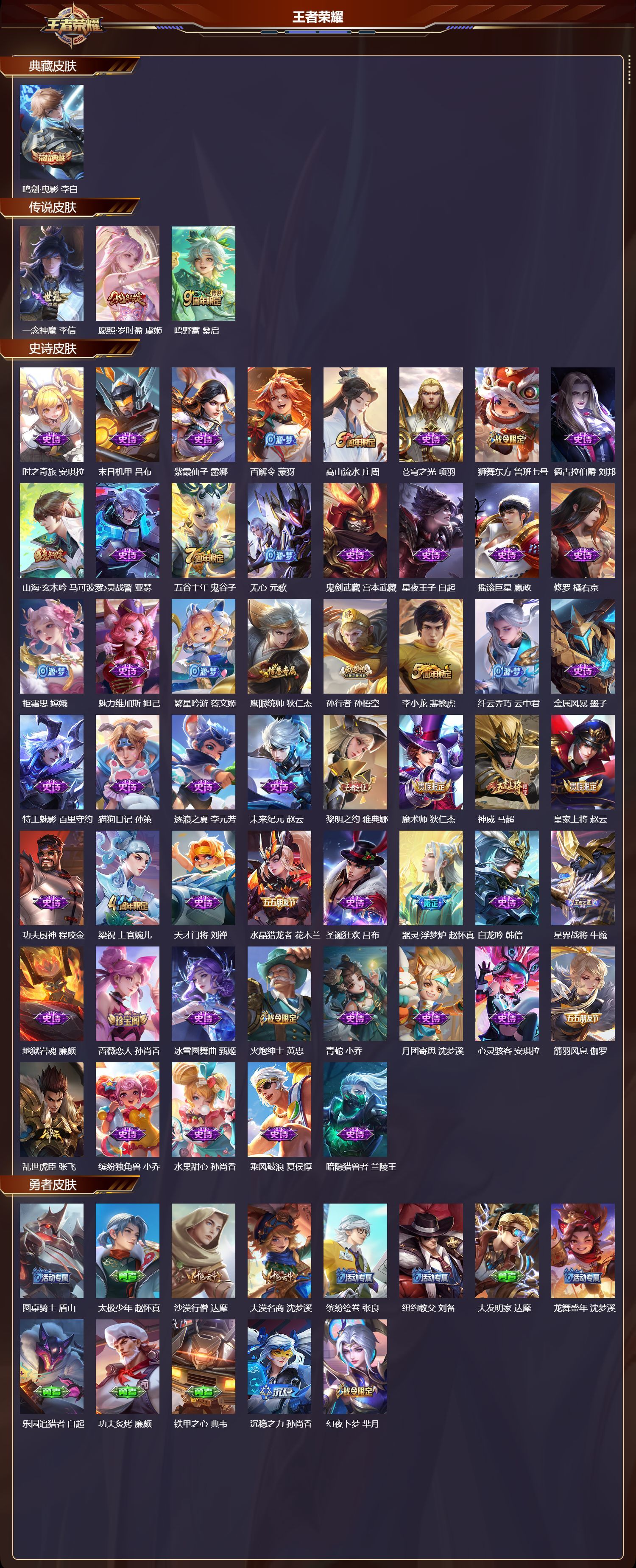 [9173795]安卓qq/ v6/ 188皮肤/ 122英雄 【1 典藏皮肤】鸣剑·曳影 李白 【3 传说皮肤】一念神魔 李信愿照·岁时盈 虞姬鸣野蒿 桑启 【53 史诗皮肤】时之奇旅 安琪拉末日机甲 吕布紫霞仙子 露娜百解令 蒙犽高山流水 庄周苍穹之光 项羽狮舞东方 鲁班七号德古拉伯爵 刘邦山海·玄木吟 马可波罗心灵战警 亚瑟五谷丰年 鬼谷子无心 元歌鬼剑武藏 宫本武藏星夜王子 白起摇滚巨星 嬴政修罗 橘右京拒霜思 嫦娥魅力维加斯 妲己繁星吟游 蔡文姬鹰眼统帅 狄仁杰孙行者 孙悟空李小龙 裴擒虎纤云弄巧 云中君金属风暴 墨子特工魅影 百里守约猫狗日记 孙策逐浪之夏 李元芳未来纪元 赵云黎明之约 雅典娜魔术师 狄仁杰神威 马超皇家上将 赵云功夫厨神 程咬金梁祝 上官婉儿天才门将 刘禅水晶猎龙者 花木兰圣诞狂欢 吕布器灵·浮梦炉 赵怀真白龙吟 韩信星界战将 牛魔地狱岩魂 廉颇蔷薇恋人 孙尚香冰雪圆舞曲 甄姬火炮绅士 黄忠青蛇 小乔月团寄思 沈梦溪心灵骇客 安琪拉箭羽风息 伽罗乱世虎臣 张飞缤纷独角兽 小乔水果甜心 孙尚香乘风破浪 夏侯惇暗隐猎兽者 兰陵王 【97 勇者皮肤】圆桌骑士 盾山太极少年 赵怀真沙漠行僧 达摩大漠名商 沈梦溪缤纷绘卷 张良纽约教父 刘备大发明家 达摩龙舞盛年 沈梦溪乐园追猎者 白起功夫炙烤 廉颇铁甲之心 典韦沉稳之力 孙尚香幻夜卜梦 芈月海盐诗旅