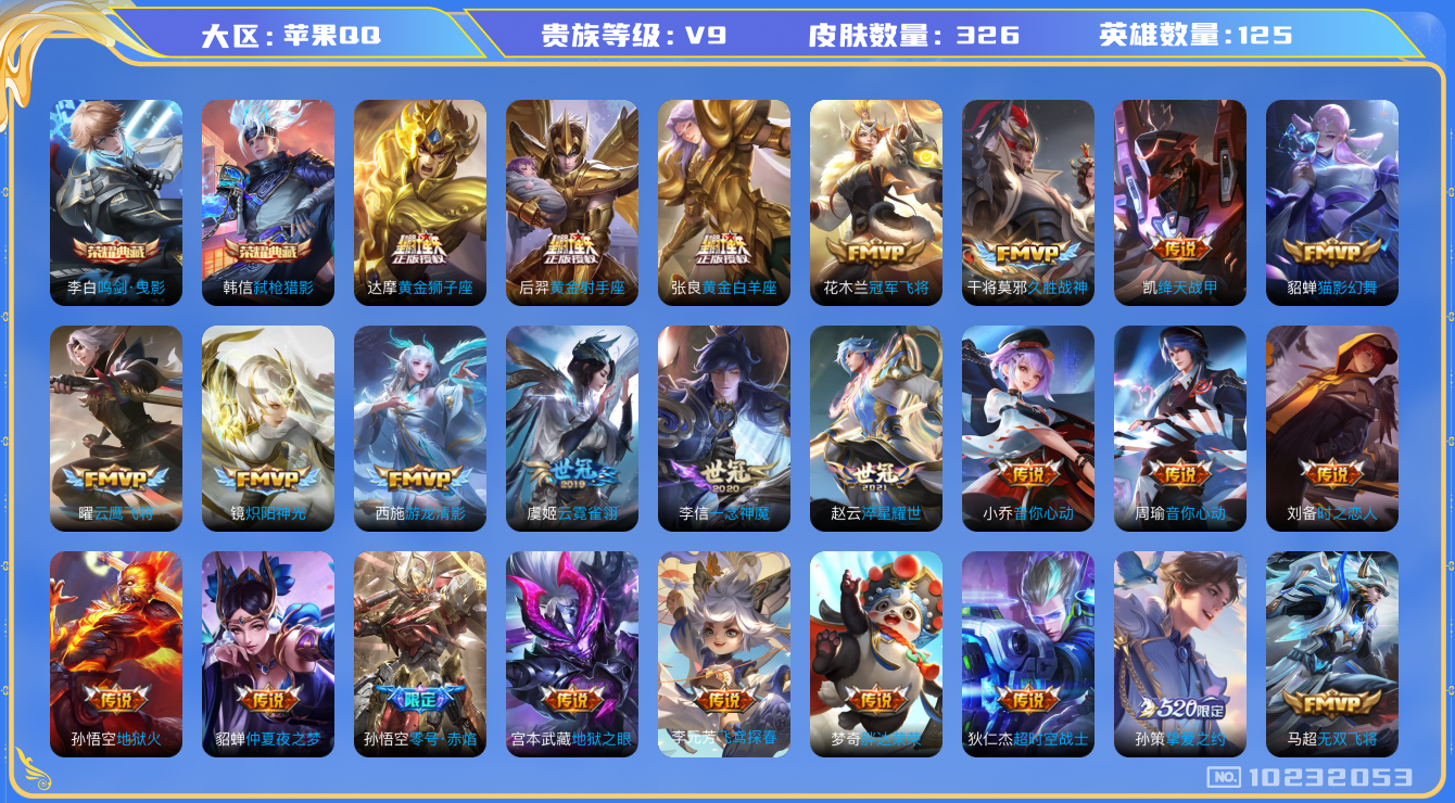 [10232053]王者 可二次 打野野王边路带妹神级号 2典藏 41传说 弑呛猎影 鸣剑曳影 愿照九州拓 幻光神呛 启明野蒿 冥王哈迪斯 琥珀纪元 山海苍雷引 山海炽霜斩 诗剑行 深海息 无双飞将 挚爱之约 启示之音 时之祈愿 寅虎·赤拳 寅虎瑞焰 淬星耀世 游龙清影 音你心动 音你心动 飞鸢探春 绛天战甲 炽阳神光 启明星使 零号赤焰 武圣 云鹰飞将 一念神魔 时之恋人 猫影幻舞 黄金白羊座 久胜战神 云霓雀翎 黄金狮子座 冠军飞将 胖达荣荣 黄金射手座 武陵仙君 仲夏夜之梦 地狱之眼 地狱火 超时空战士 器灵浮梦炉 浮光幕影 山海玄木吟 赏金猎手 玉兔公主 百木心呛 永昼 时之祈愿 寅虎展翼 寅虎心曲 傲雪梅呛 女儿国国王 猪悟能 孙行者 白晶晶 龙胆 修罗 魅语 晚莹 岱宗 青龙志 猫狗日记 一生所爱 朱雀志 青春决赛季 千年之狐 紫霞仙子 苍穹之光 电玩小子