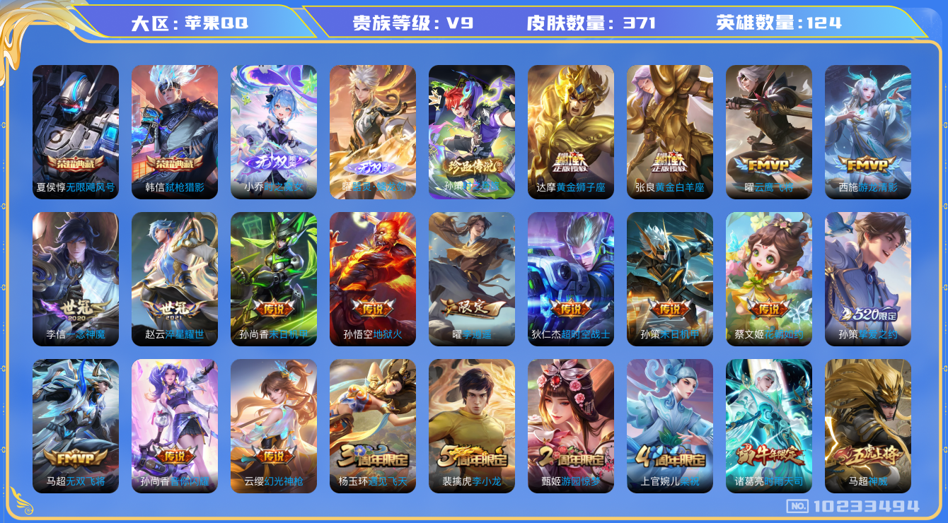 [10233494]贵族等级:v9 皮肤价值:290694 荣耀典藏:2 无双皮肤:2 传说皮肤:26 史诗皮肤:111 英雄数量:124 皮肤数量:371 游戏区服:苹果qq100区