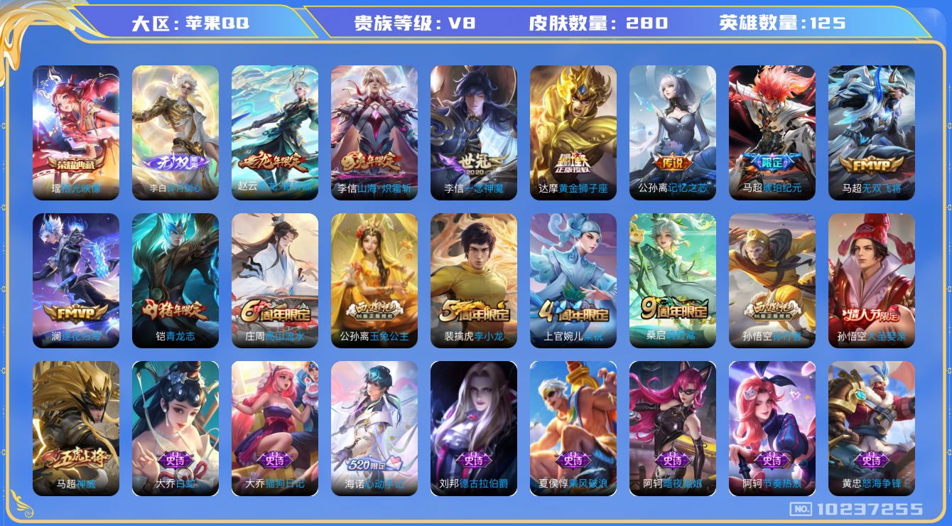 [10237255]v8 1典藏 1无双 10传说 125英雄 280皮肤 可修改实名 女号 荣耀水晶:拾光映像瑶典藏 无双皮:碎月剑心李白无双 传说皮:琥珀纪元马超乘龙·铭钟鼎赵云年限山海·炽霜斩李信年限黄金狮子座一念神魔无双飞将记忆之芯机甲兔澜逐花归海 珍宝阁皮:万物之道玩趣恶龙 限定皮:鸣野蒿神威电光马子高山流水青龙志铠年限梁祝李小龙孙行者大圣娶亲玉兔公主 史诗皮:星界战将茶境仙星界特工蒙犽顽岩魄芈月浮光幕影怒海争锋海诺心动手记蔬乡物语鲁班七号乘龙·聚宝船安琪拉年限琥珀纪元伽罗破空之剑东方月初紫霞仙子苍穹之光白龙吟黄金分割率特工魅影千年之狐百相守梦刘备电玩·爆裂旋风江河有灵蒙恬荣光圣徽偶像歌手银翎春语白蛇暗夜猫娘魅语龙骑士小龙虾猫狗日记-孙策猫狗日记-大乔乱世虎臣节奏热浪修罗女仆咖啡摇滚巨星水果甜心天才门将星夜王子德古拉伯爵暗隐猎兽者幽灵船长鬼剑武藏心灵战警舞动绿茵诗语江南纤云弄巧繁星吟游呼啦呼啦拒霜思缤纷独角兽乘风破浪逐浪之夏月团寄思水晶猎龙者曙光守护者热力回旋箭羽风息唤灵魅影金属风暴原初追逐者圣诞狂欢鹰眼统帅暗夜贵公子魅力维加斯赏金猎手